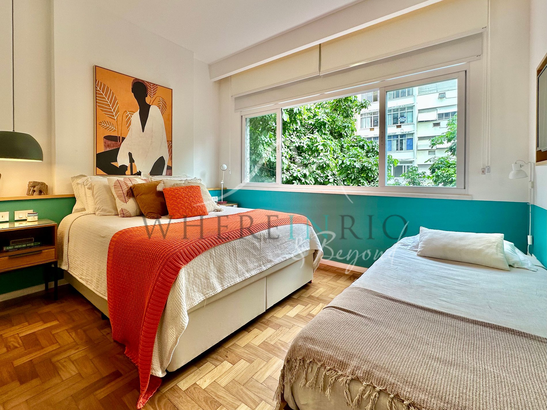 This modern apartment features a spacious living room with an elegant dining area, and a fully equipped open-plan kitchen perfect for cooking and socializing. Each room is tastefully decorated, creating a cozy yet refined ambiance. Designed to provide privacy and relaxation, it’s perfect for families or groups who want to enjoy the authentic Ipanema lifestyle.