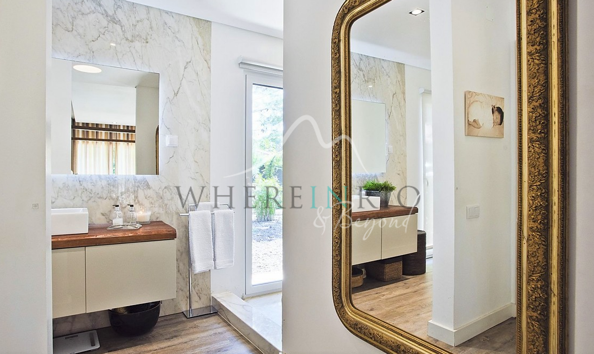 Upstairs, the spacious suite overlooks the garden and swimming pool, offering a serene retreat.
