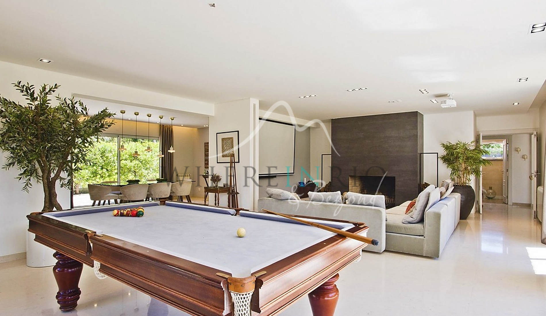 The main living area boasts an open-plan layout with generous sofas arranged around a central fireplace, situated beneath a large flat-screen TV. The walls are adorned with expansive sliding doors that lead out to the verdant garden and pool area, adorned with flowing white curtains should you desire a moment of seclusion. For entertainment, there's a pool table where you and your friends can unwind in the evenings.
