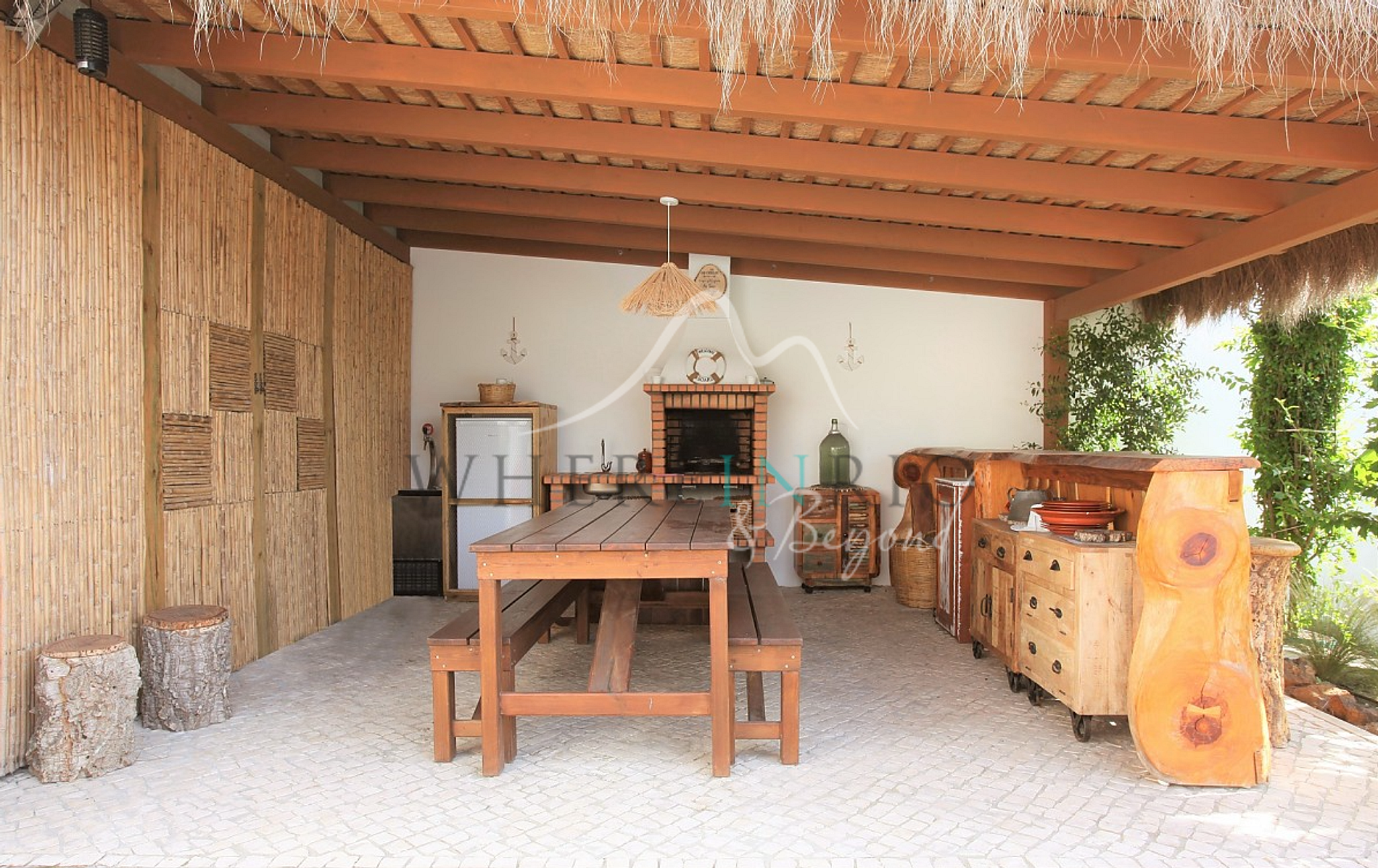 The villa’s most charming feature is its infinity pool, surrounded by wooden planking on either side, offering a picturesque setting. Adjacent to the pool, a covered outdoor dining area equipped with its own barbecue invites guests to enjoy al fresco meals. Towering palm trees dominate the outdoor space, evoking a true holiday ambiance.