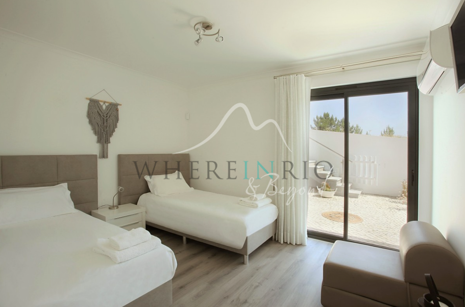 Sunbeds and umbrellas are strategically placed around the pool, providing comfort and shade for those seeking relief from the Portuguese sun. A hammock, nestled on a grassy patch nearby, offers a tranquil spot to unwind and read. For the more active guests, bicycles are available for rent at just 10 euros per day.