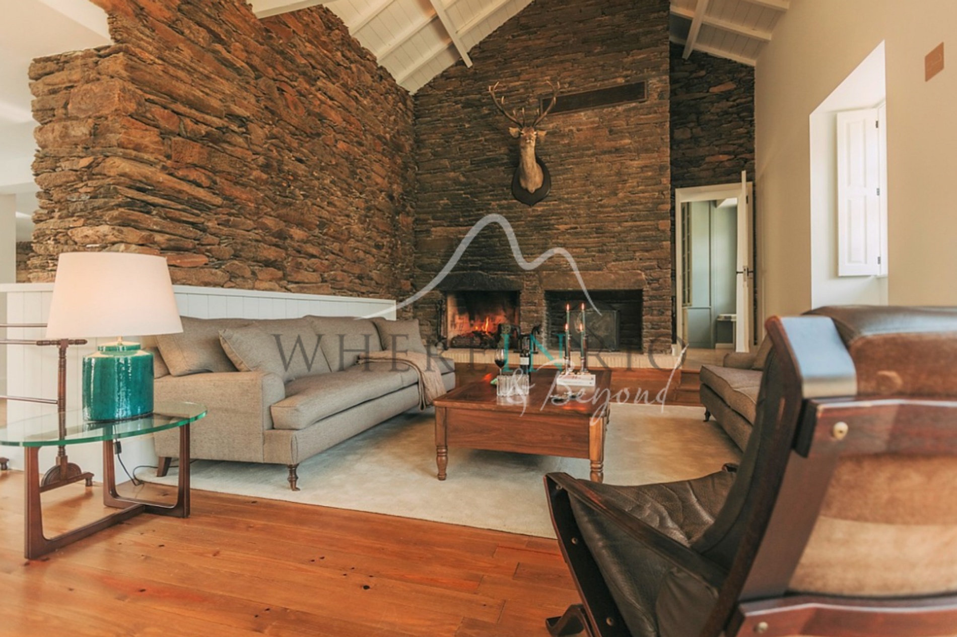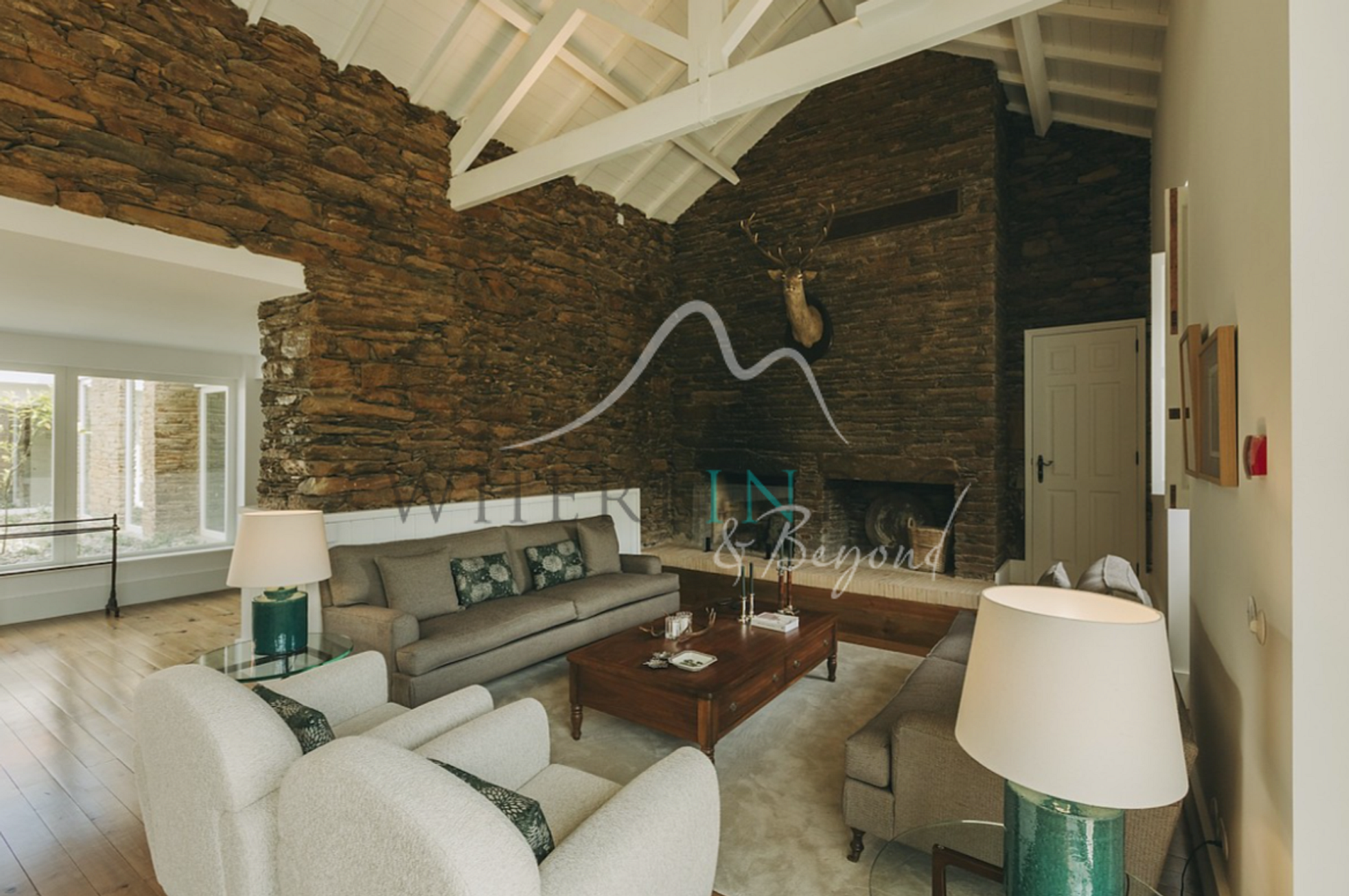 The villa's interior is designed in the style of a traditional fishing lodge, blending classic charm with modern amenities. Its expansive central living and dining area features wooden flooring, brick walls, and exquisite furnishings, creating a captivating atmosphere. Spacious sofas in soothing beiges and browns complement the decor, while double fireplaces and a mounted stag's head add a touch of tradition and coziness.