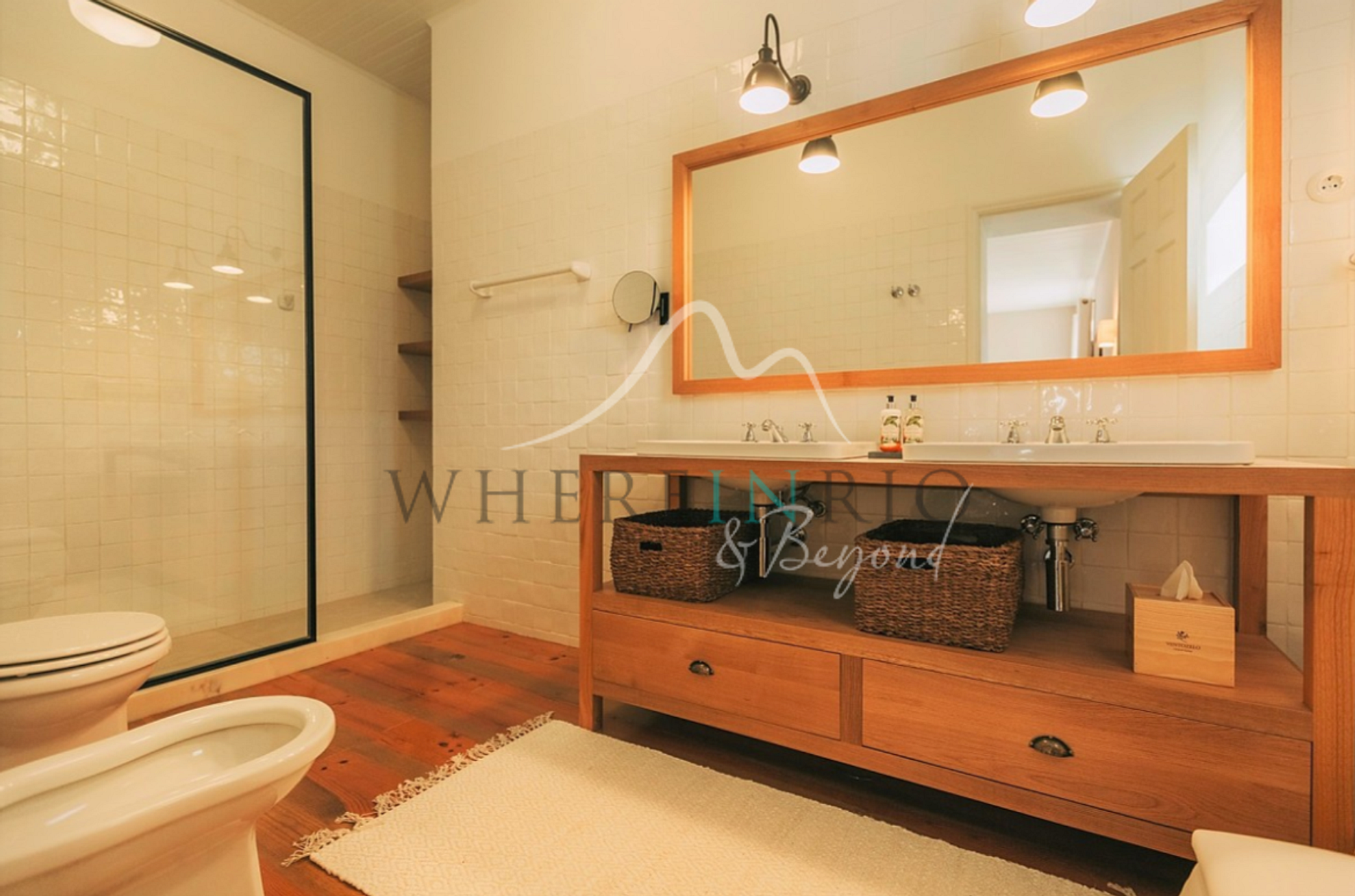 The house features six double bedrooms, each adorned with floral bed coverings, light rugs, and stunning wooden furniture. Each bedroom offers a private bathroom with double sinks, large mirrors, and modern amenities for a comfortable stay. Ample cupboard space and large windows create a bright and airy ambiance. Outside, the infinity pool overlooking the river provides a memorable setting for sunbathing amidst lush greenery. Outdoor seating areas offer the perfect spot to enjoy meals while taking in the breathtaking natural surroundings.