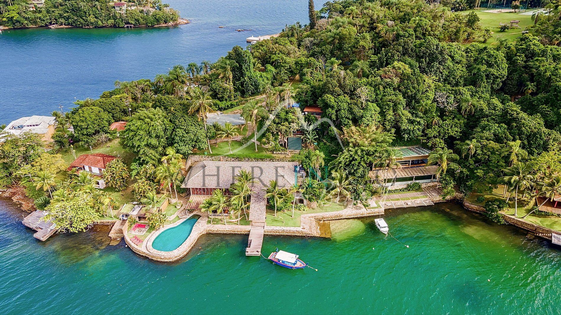 Access only by boat or helicopter. Boat docking and helipad available.