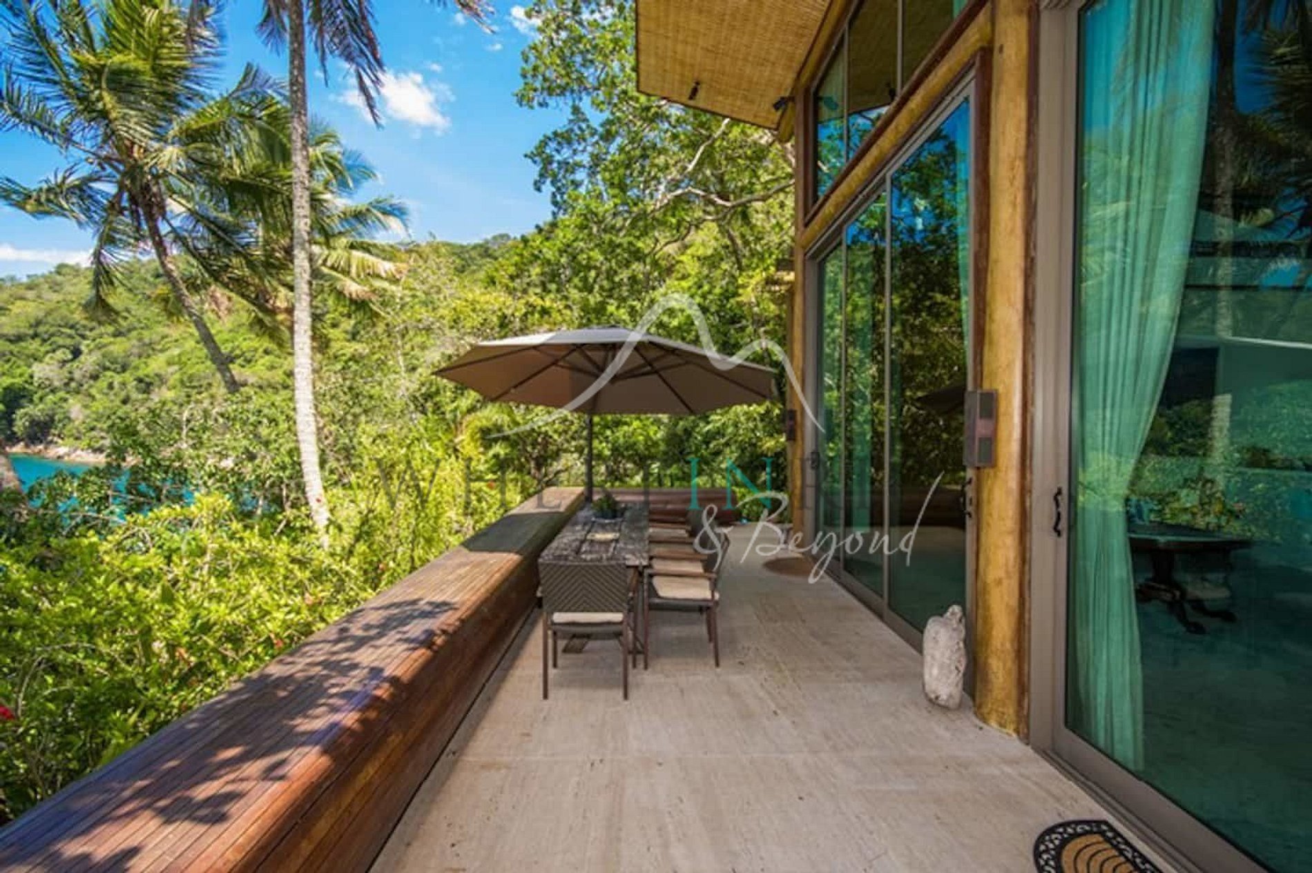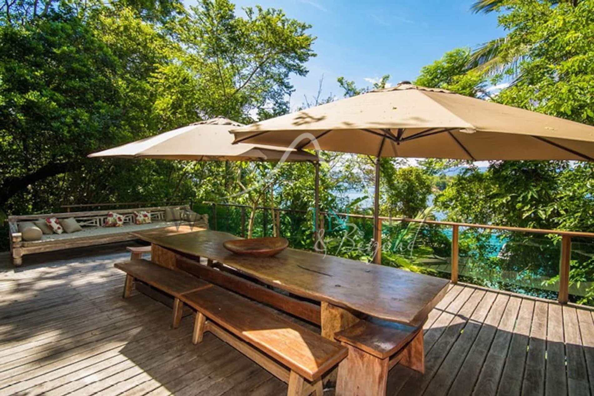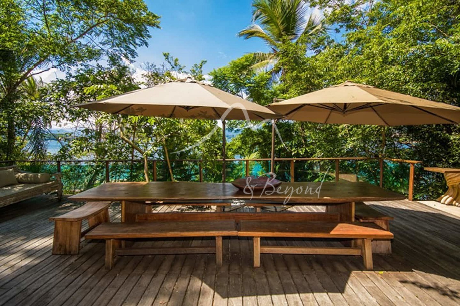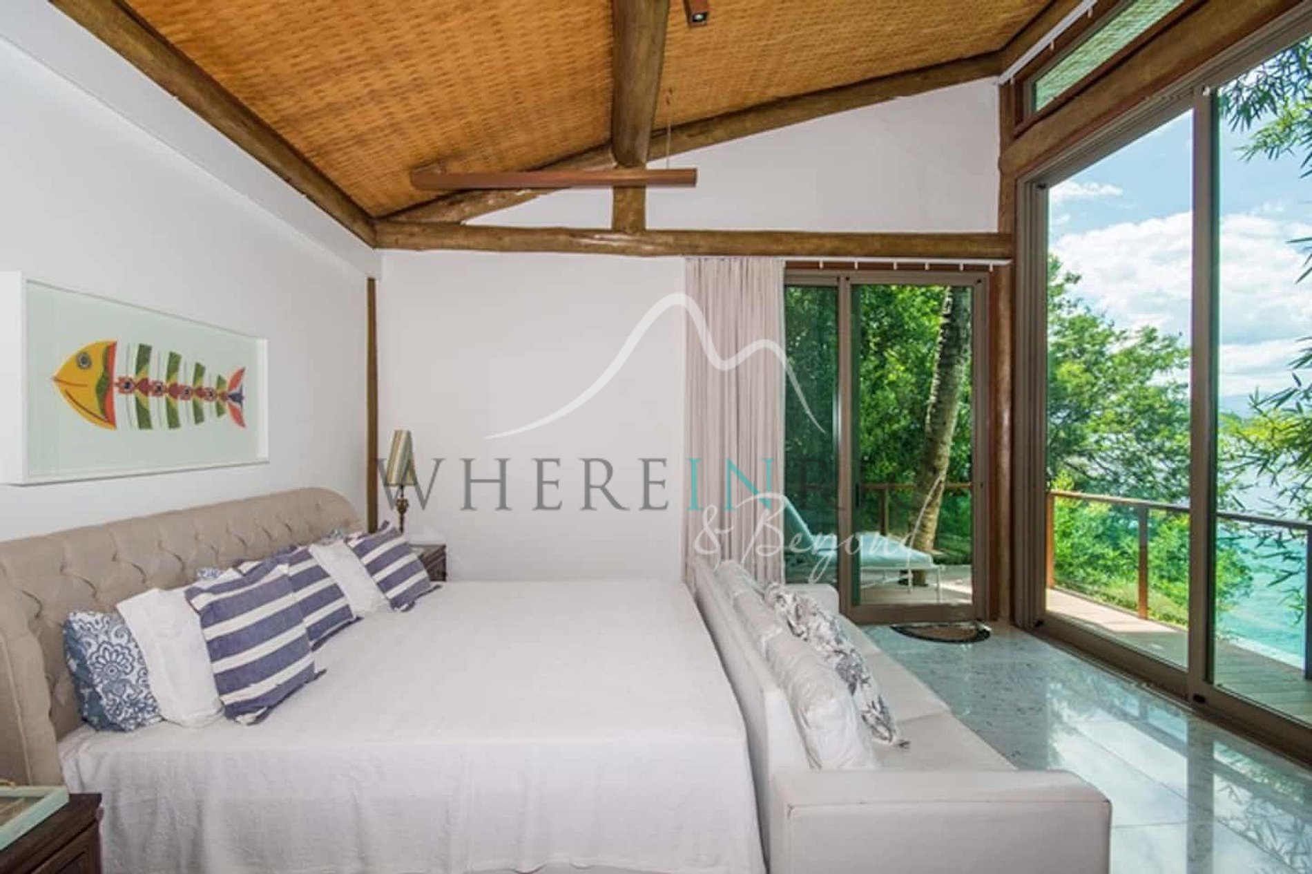 Designed in harmony with its natural surroundings, the main house and bungalows offer spacious suites with private terraces. The gourmet area includes a professional barbecue, pizza oven, and large dining table. The glassed-in living room allows guests to enjoy panoramic island views.