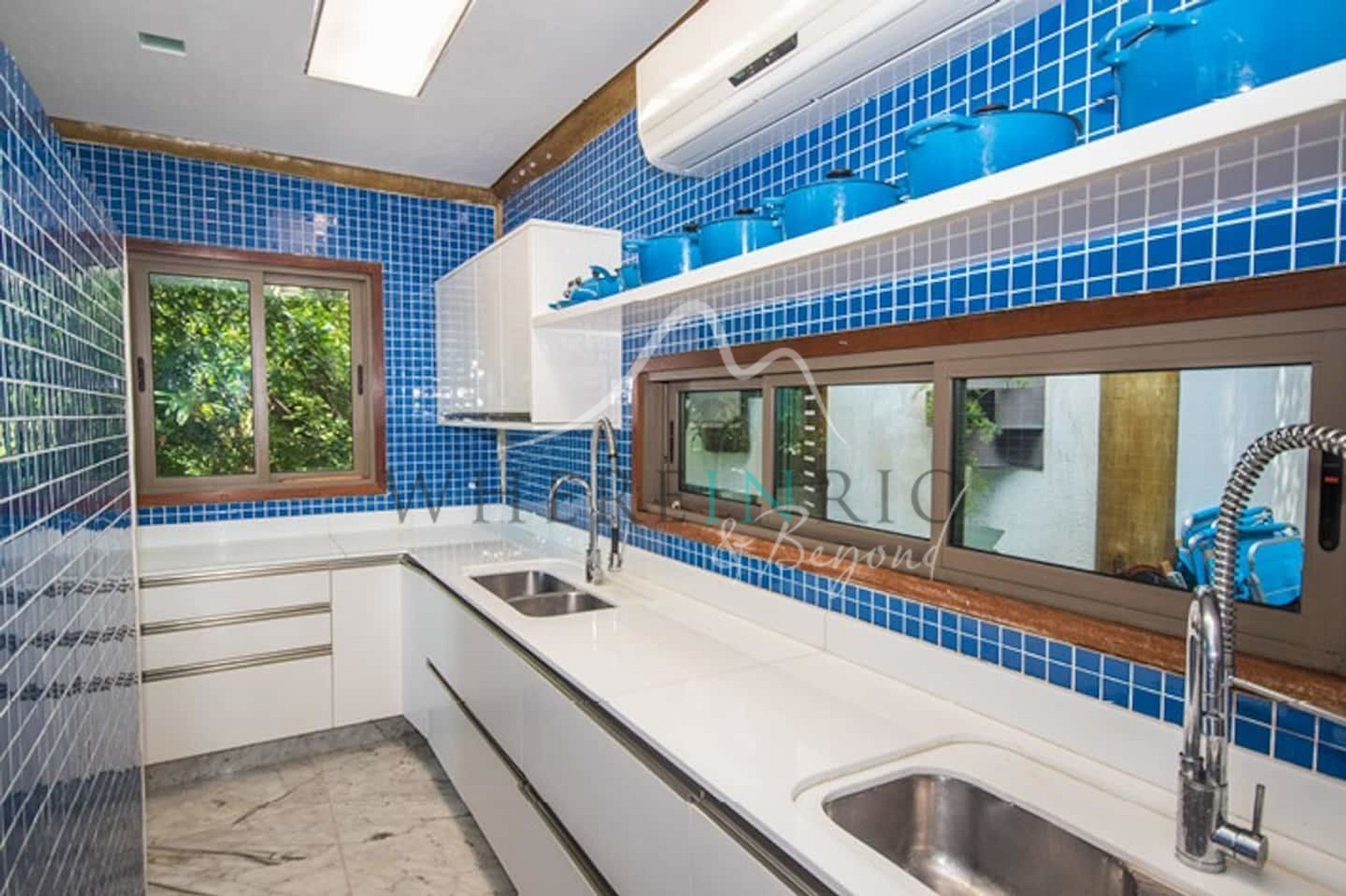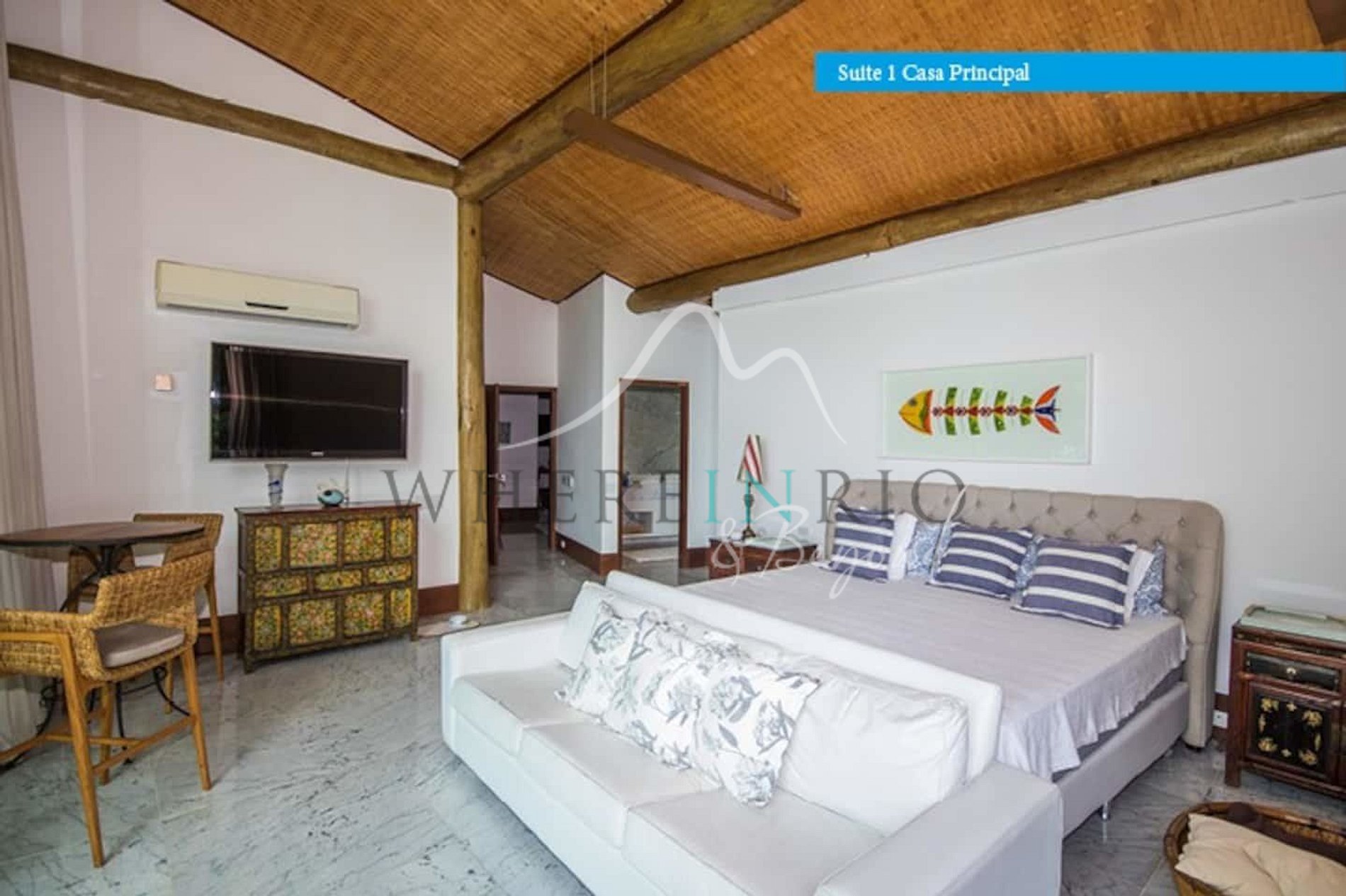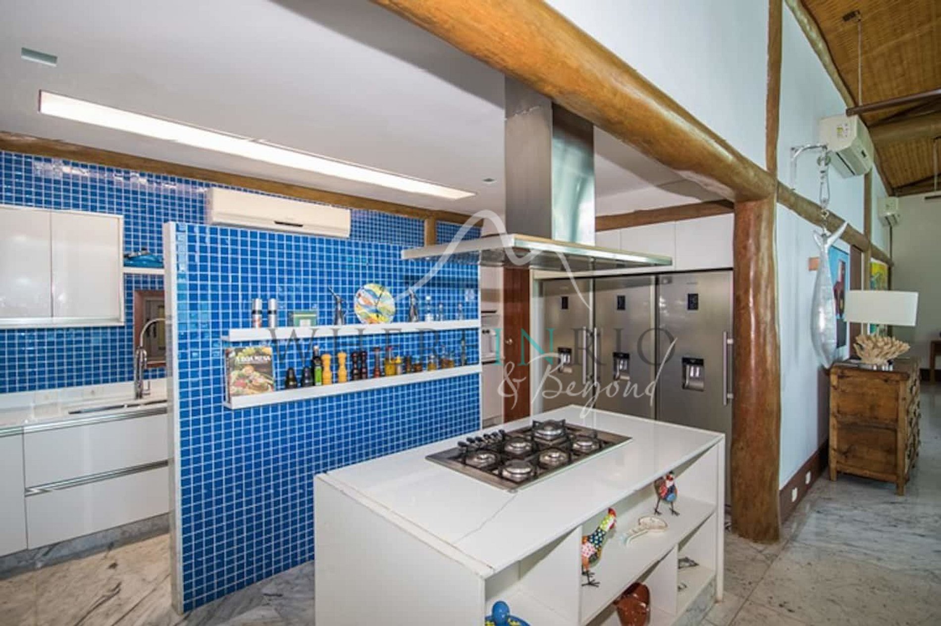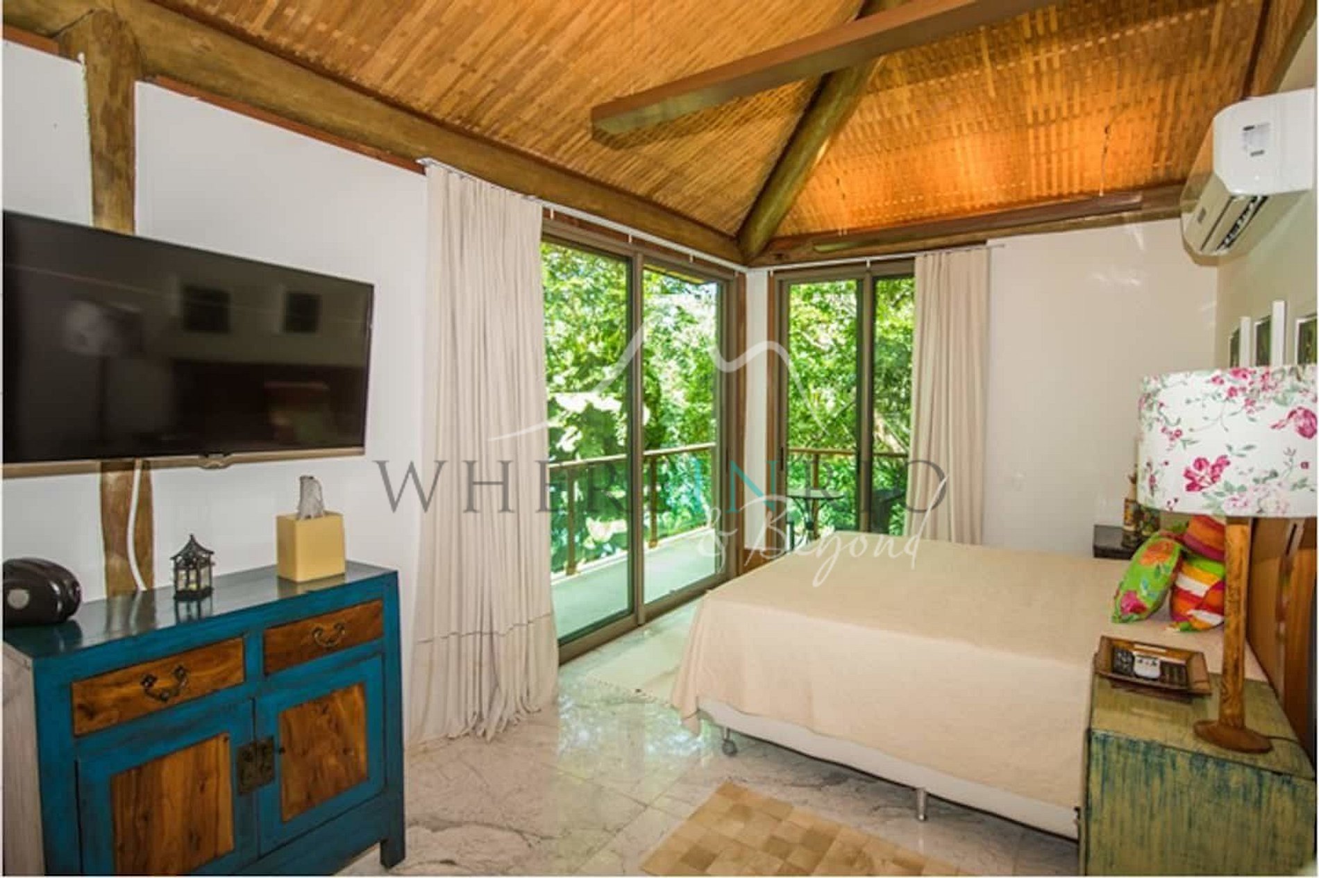 Designed in harmony with its natural surroundings, the main house and bungalows offer spacious suites with private terraces. The gourmet area includes a professional barbecue, pizza oven, and large dining table. The glassed-in living room allows guests to enjoy panoramic island views.