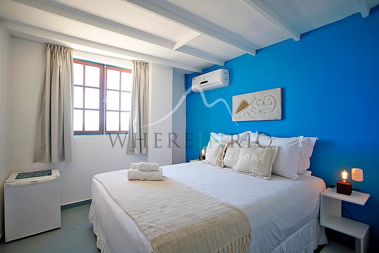 Casa Azul is a recently renovated Greek-style luxury house in the heart of Búzios. Just steps from Praia do Canto beach, it offers 10 elegant suites with sea views, bar, fully equipped kitchen and private staff—perfect for a high-end Búzios luxury rental.