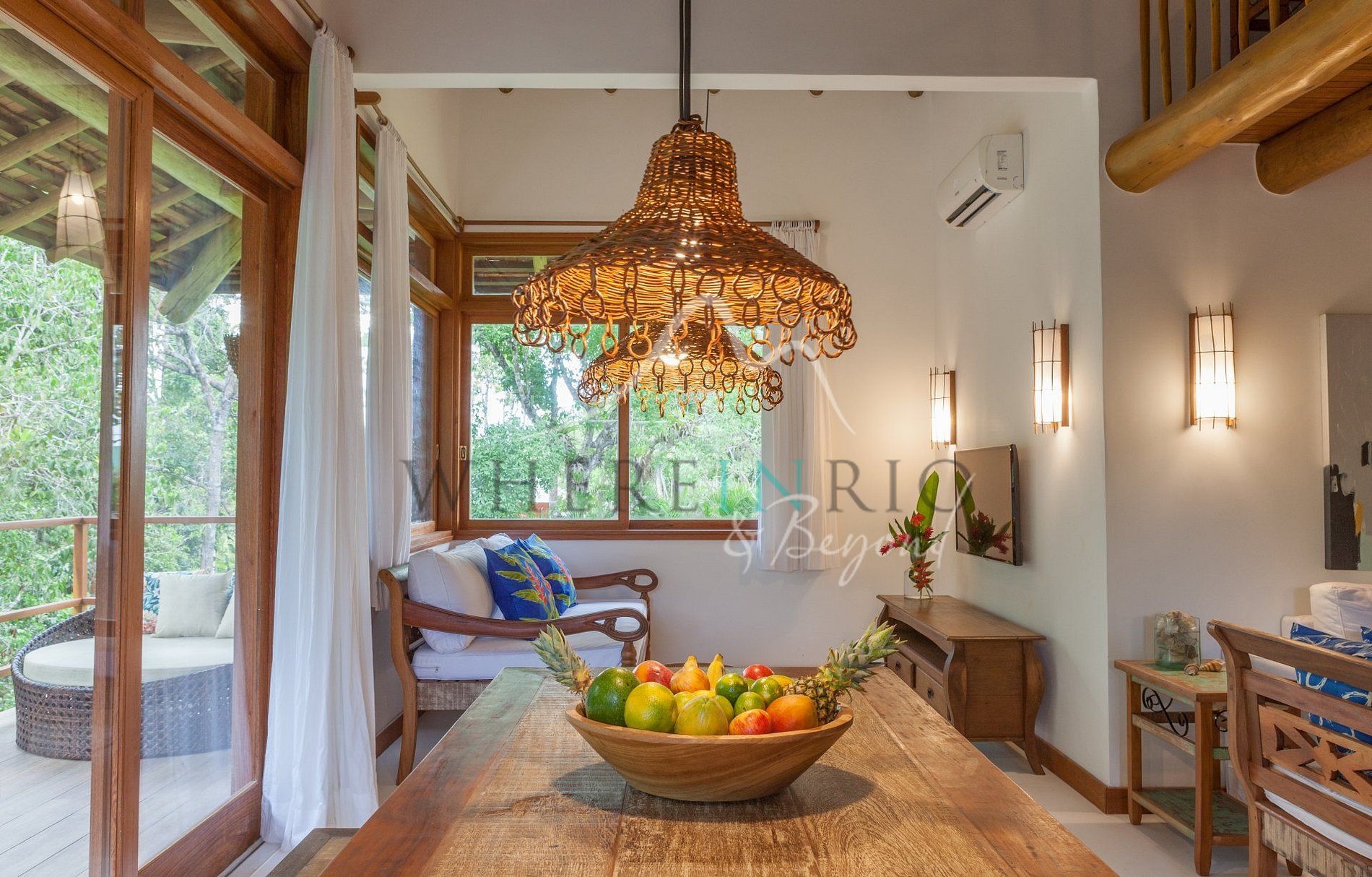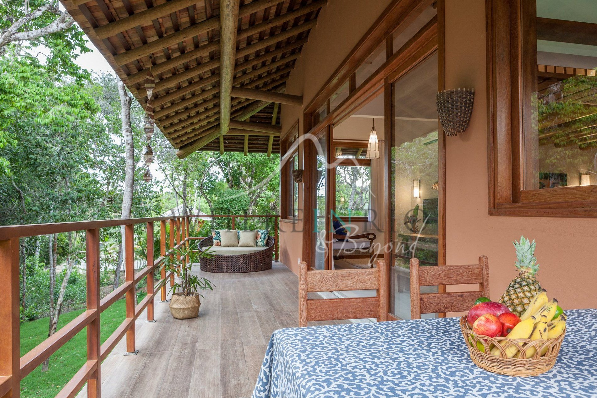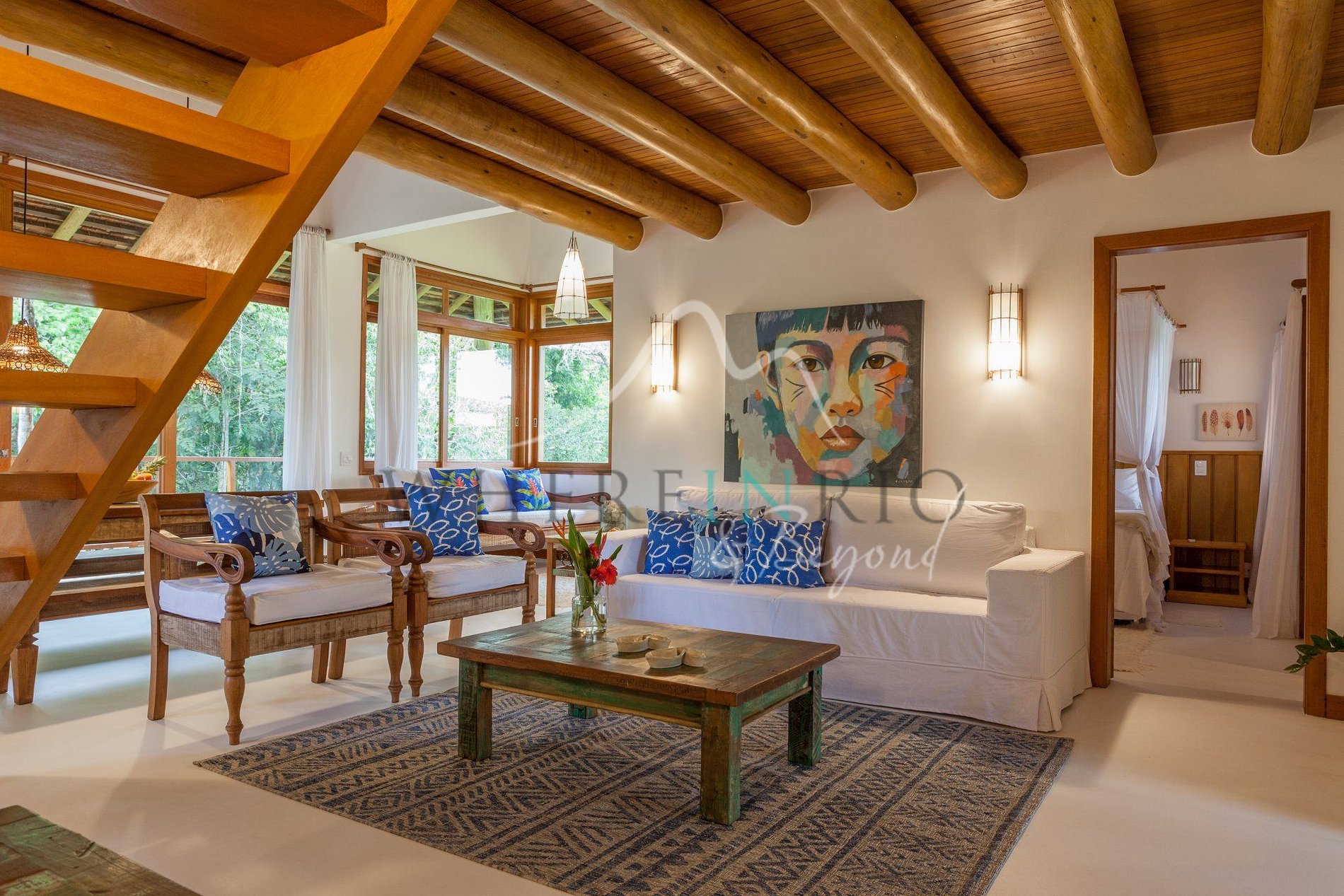 Bright, elegant, and warmly decorated in light tones and wood accents, this home feels like a peaceful retreat. Floor-to-ceiling windows open to lush greenery, immersing guests in the natural beauty of Trancoso.