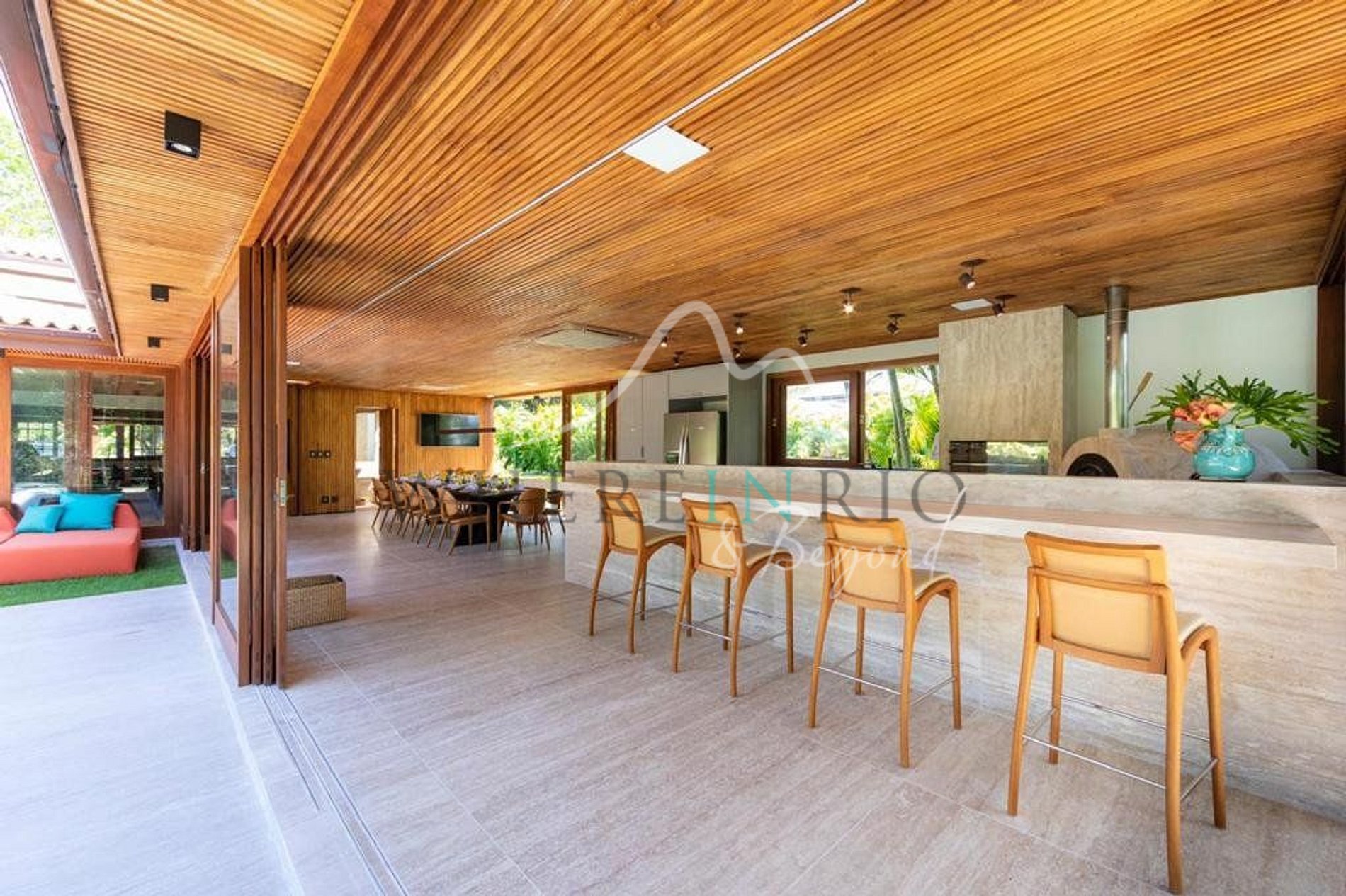 Entering the house, a great and spacious room divided into two environments: living room and TV room. Next to it there is a great pool table for your entertainment. With furniture signed by Sérgio Rodrigues and Jader Almeida, elegance and style are guaranteed on your vacation. The living room gives access to the pool, through large sliding doors, integrating it to the leisure area. The dining room is next to the kitchen, very well equipped.