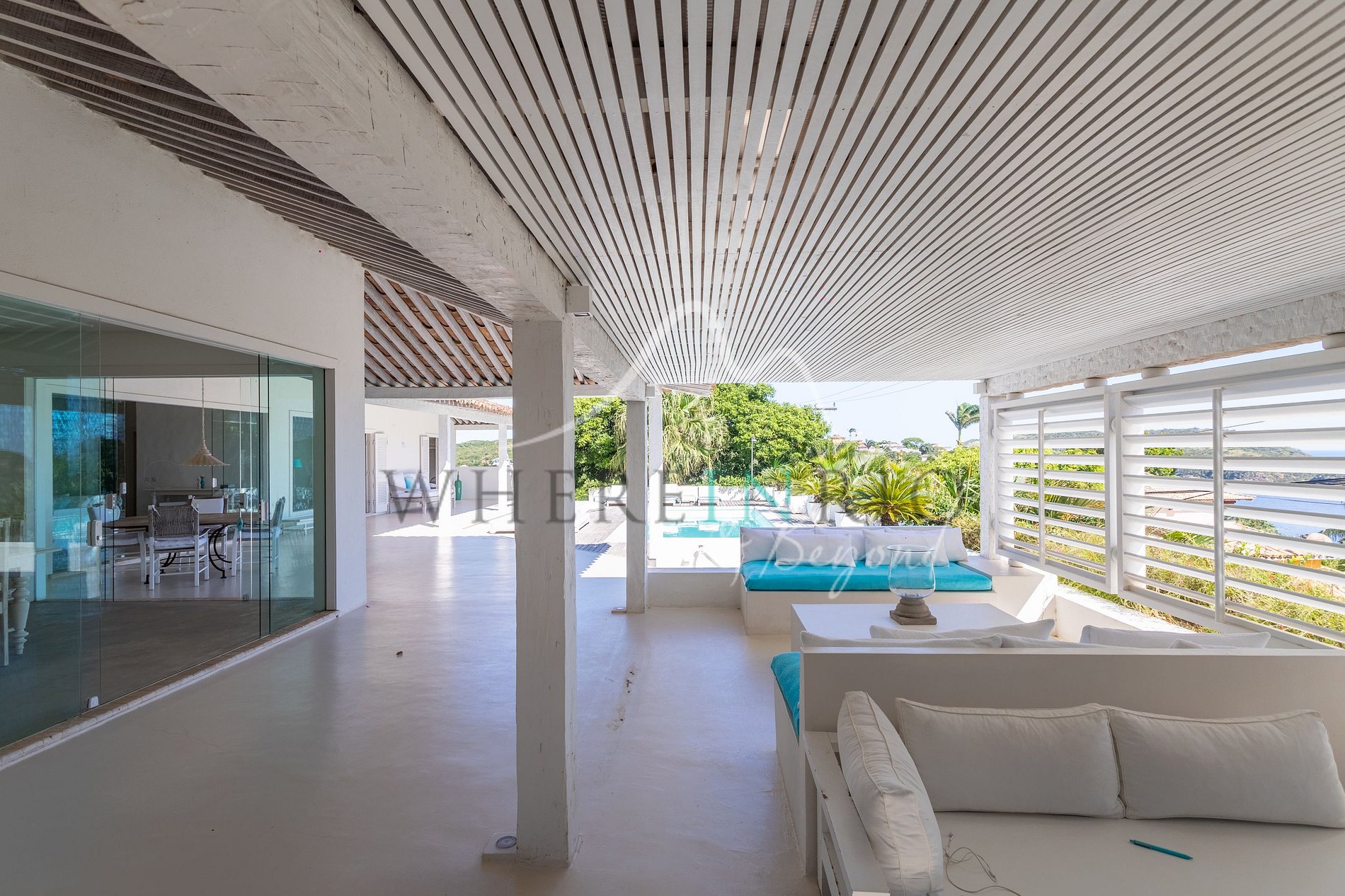 Charming blue-and-white luxury villa above Ferradura beach in Búzios with breathtaking bay views, five spacious suites and a private pool with wooden deck—perfect for family or friends seeking a high-end Búzios vacation.