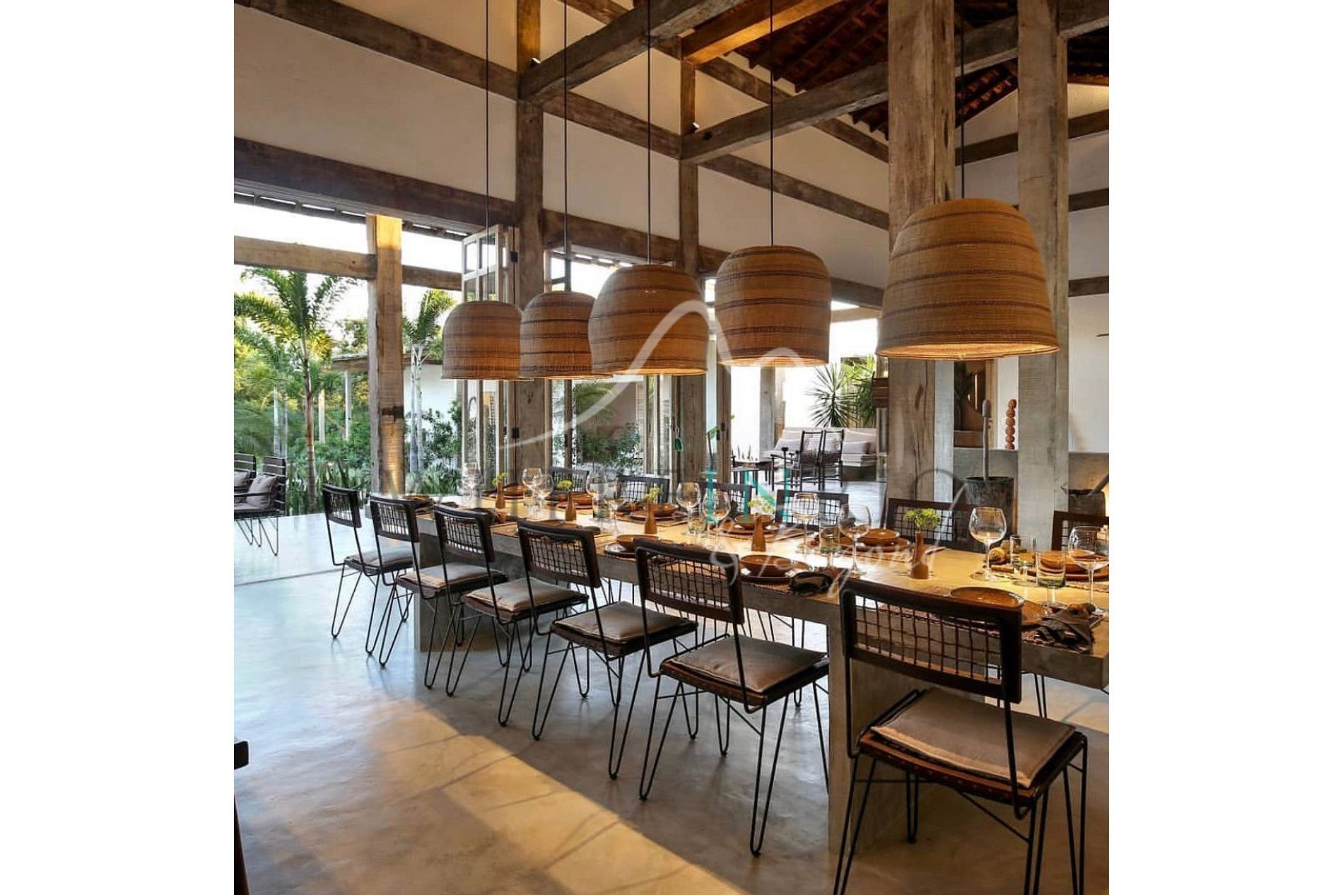 The 250 m² villa features 5 suites, a spacious open-plan living area, high ceilings, an infinity pool, and a wooden deck with forest views. Built with local materials like biriba, the design evokes the relaxed spirit of Mykonos and Ibiza. Perfect for up to 10 guests.