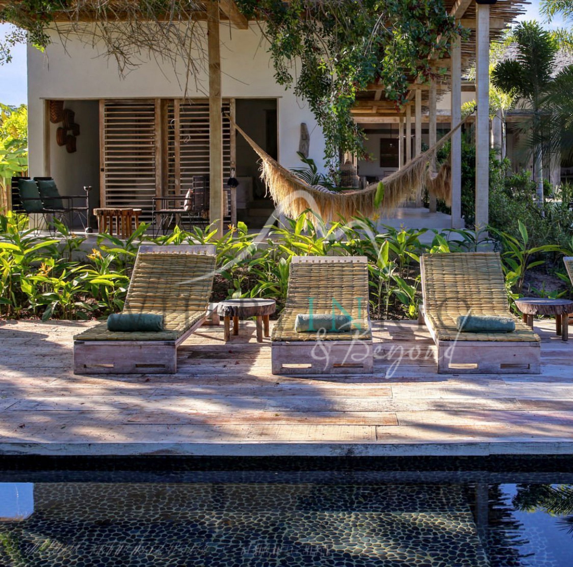 The 250 m² villa features 5 suites, a spacious open-plan living area, high ceilings, an infinity pool, and a wooden deck with forest views. Built with local materials like biriba, the design evokes the relaxed spirit of Mykonos and Ibiza. Perfect for up to 10 guests.