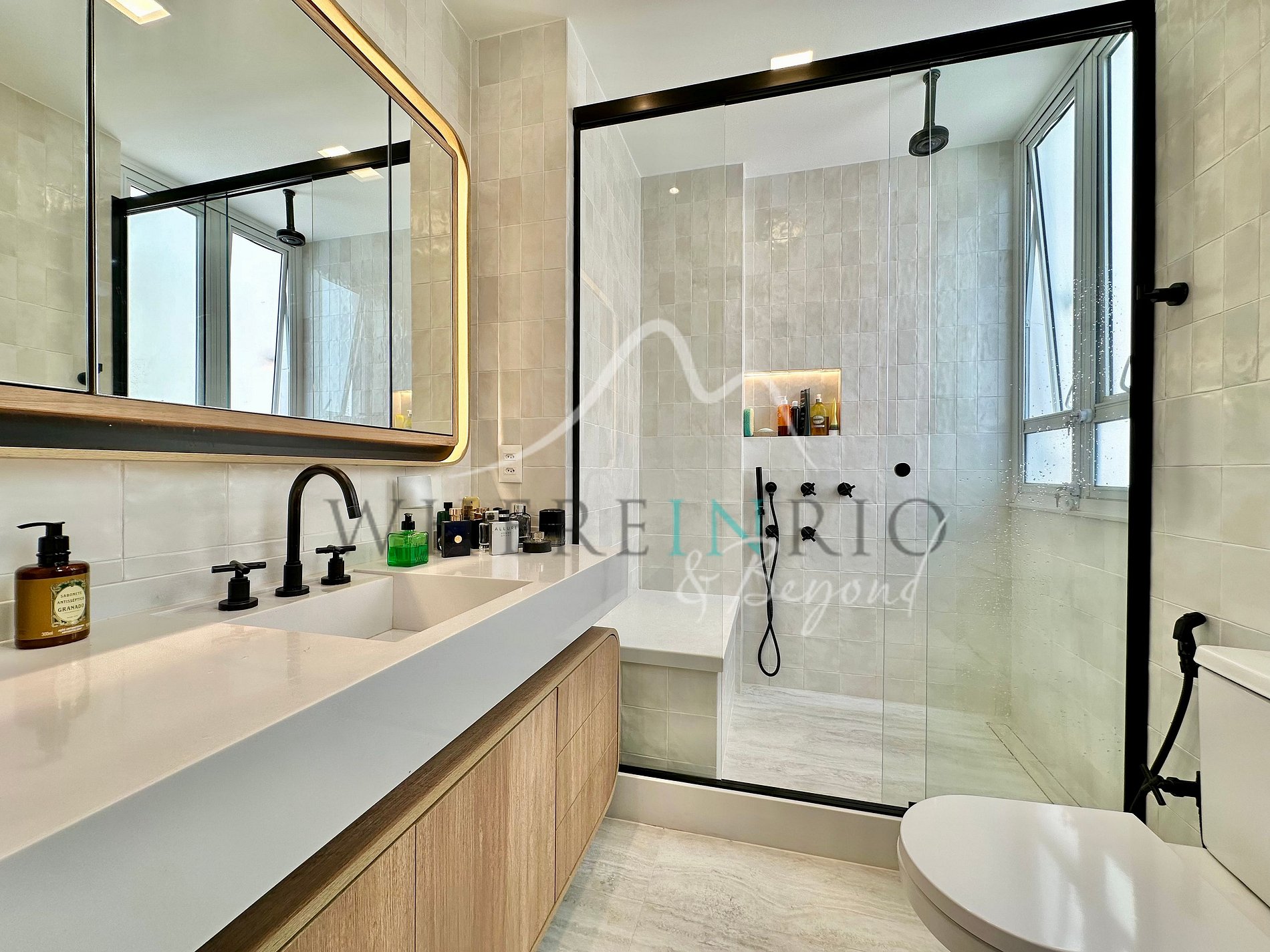 This modern apartment features a spacious living room and a fully planned kitchen that connect seamlessly to a retractable glass-enclosed balcony. The balcony includes a charming outdoor shower, perfect for refreshing on sunny days. Elegant muxarabi wood panels hide storage areas and the laundry space, while light wood furniture and black metal accents bring a refined urban aesthetic. The light gray porcelain flooring unifies all areas — from the living room to the gourmet balcony — creating a cohesive and welcoming atmosphere. Solar curtains and a glass roof allow natural light control, making this apartment a true gem in Ipanema.