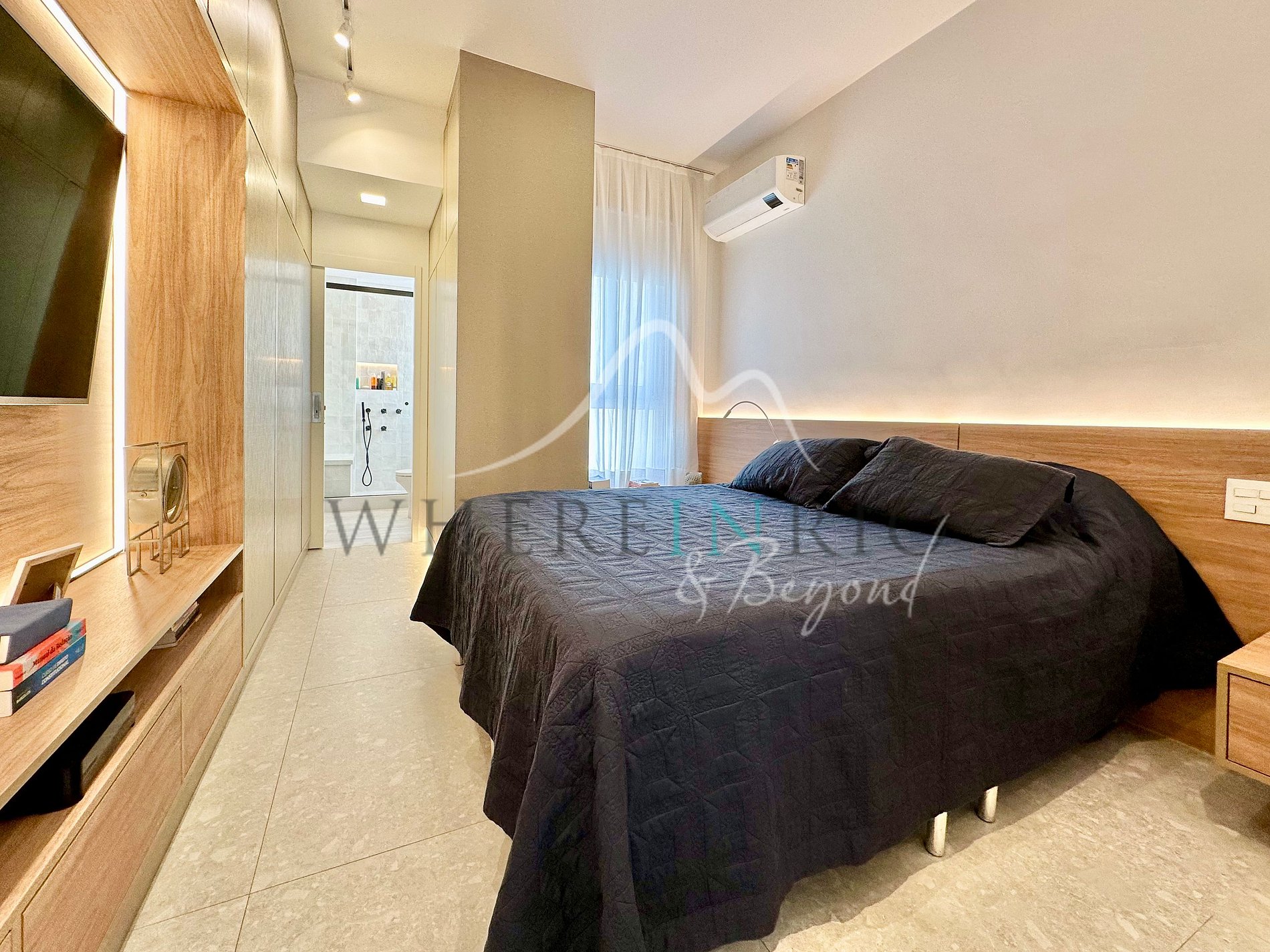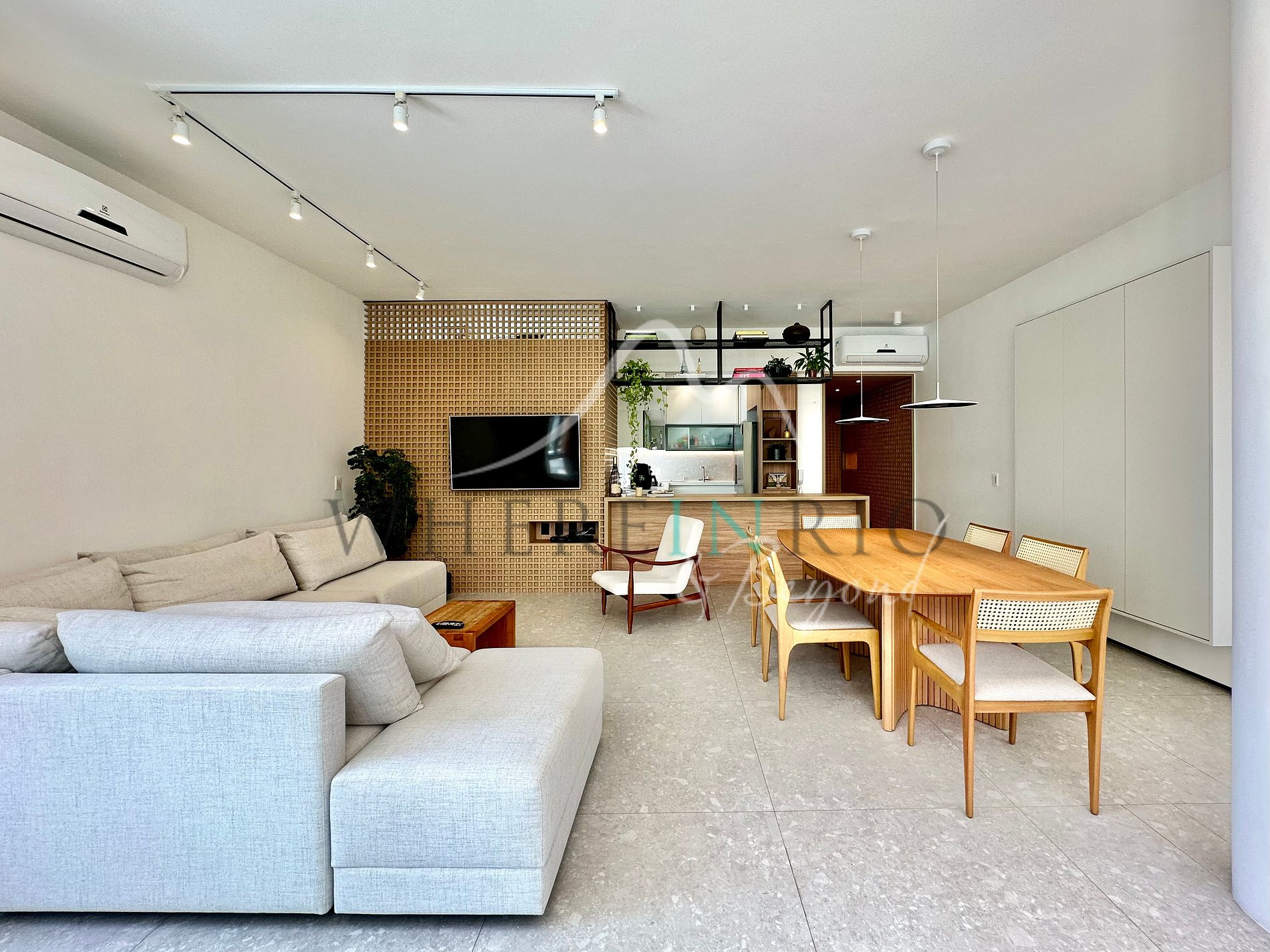 This modern apartment features a spacious living room and a fully planned kitchen that connect seamlessly to a retractable glass-enclosed balcony. The balcony includes a charming outdoor shower, perfect for refreshing on sunny days. Elegant muxarabi wood panels hide storage areas and the laundry space, while light wood furniture and black metal accents bring a refined urban aesthetic. The light gray porcelain flooring unifies all areas — from the living room to the gourmet balcony — creating a cohesive and welcoming atmosphere. Solar curtains and a glass roof allow natural light control, making this apartment a true gem in Ipanema.