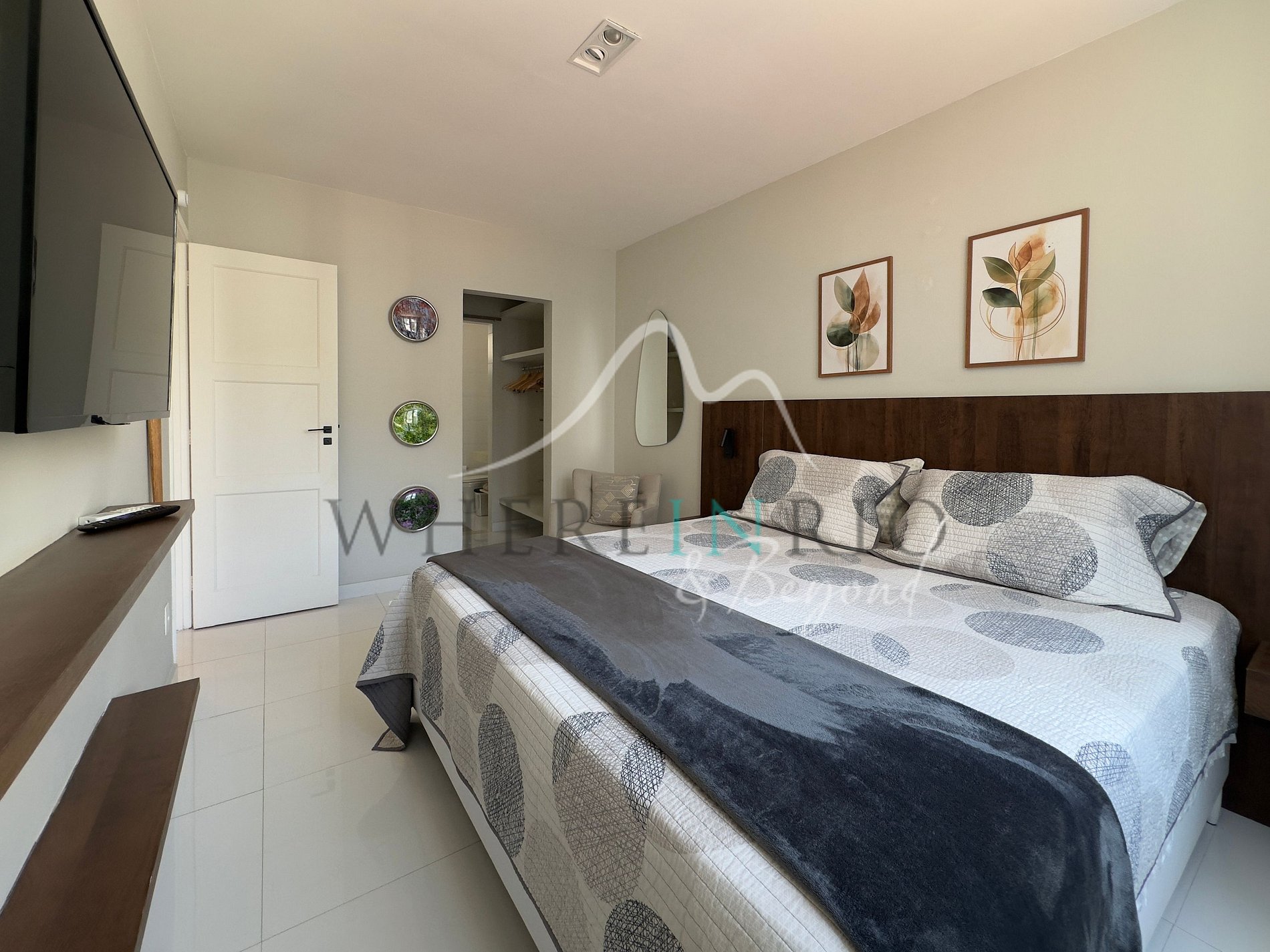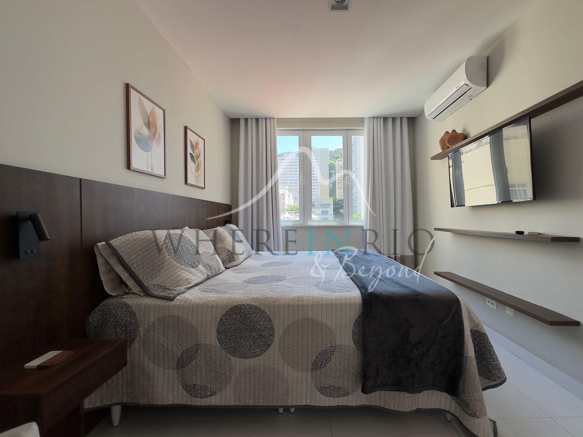 The apartment features one spacious master suite with a king-size bed, air conditioning, smart TV, and closet. The second bedroom has a queen bed, work desk, smart TV, and air conditioning — ideal for remote work or relaxation. The living room and open-concept kitchen are decorated in a modern and elegant style, offering plenty of natural light and a warm atmosphere. Every detail has been carefully designed to ensure a luxurious and comfortable experience.