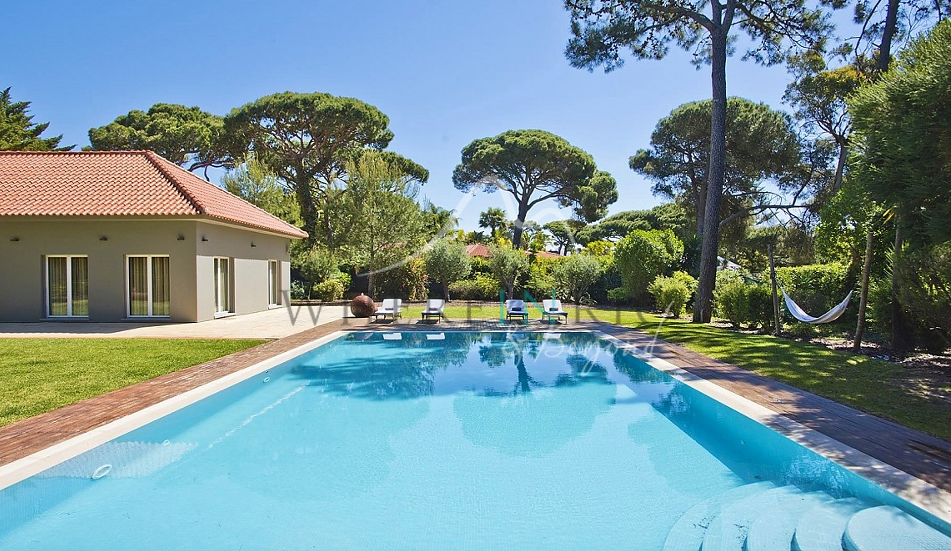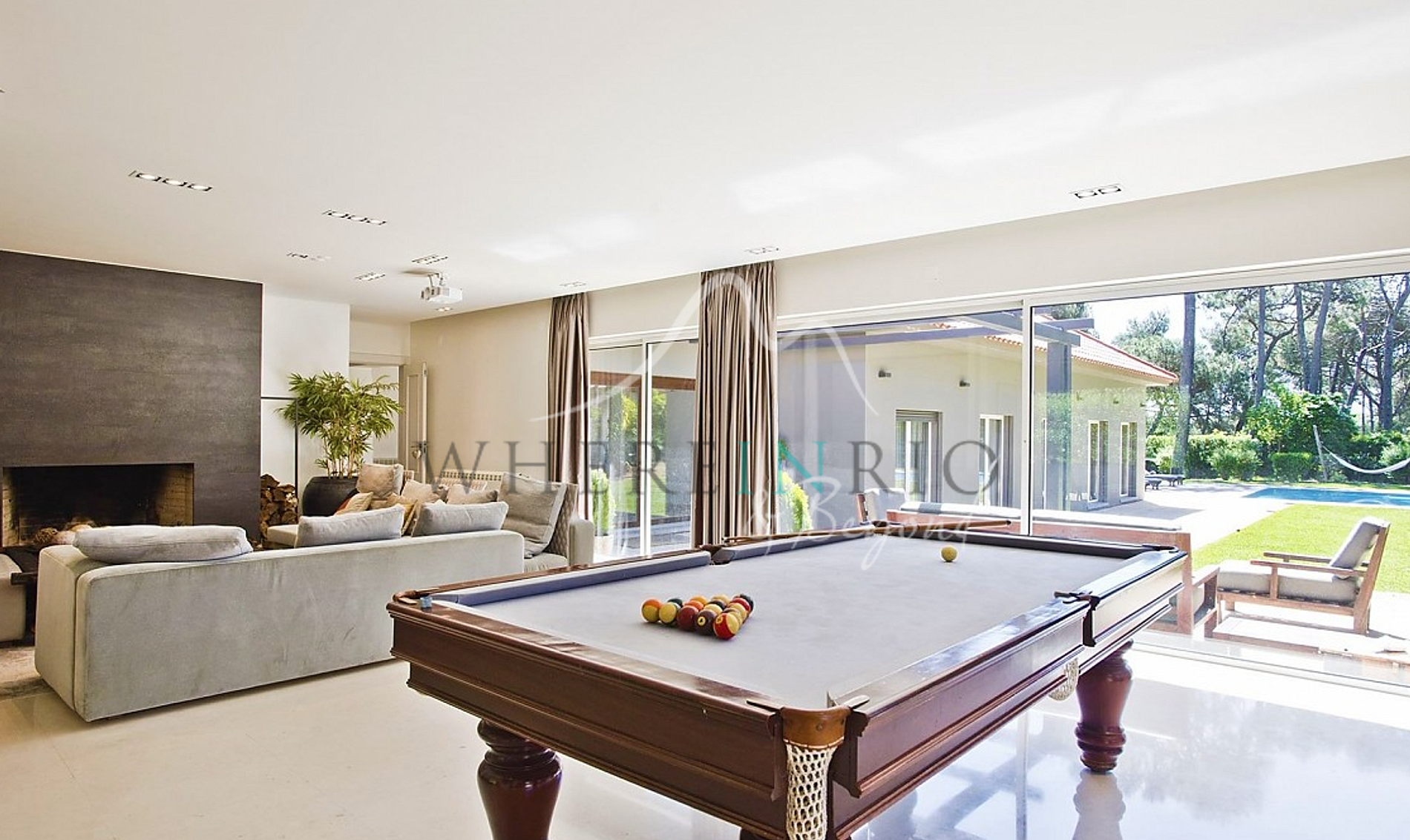 En Quinta da Marinha, un área residencial lujosa con seguridad, comercio, centros de ocio y amplios espacios verdes, encontrarás el equilibrio perfecto entre tranquilidad y centralidad para tu estilo de vida. El Club Quinta da Marinha es parte integral de este desarrollo de lujo, ofreciendo una variedad de actividades encantadoras. Ya sea que estés disfrutando de una partida de golf, paseando a caballo, cenando en el club o dando un paseo tranquilo entre los exuberantes pinos con la impresionante vista del océano Atlántico, hay algo para todos. Esta exquisita villa está meticulosamente diseñada con una decoración profesional, ofreciendo interiores espaciosos y luminosos acentuados con suelos de madera para infundir una sensación de relajación desde el momento en que entras. Grandes puertas correderas adornan las paredes, conectando perfectamente el interior con el exuberante jardín y la atractiva zona de piscina exterior.