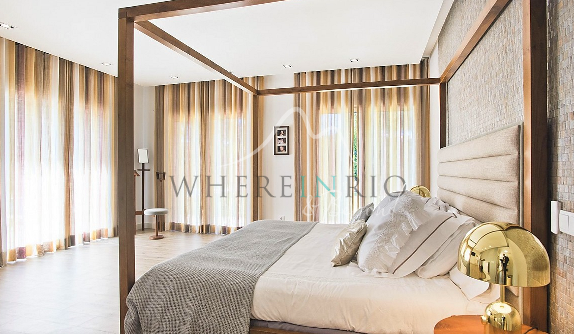 Arriba, la amplia suite ofrece vistas al jardín y la piscina, ofreciendo un refugio sereno.