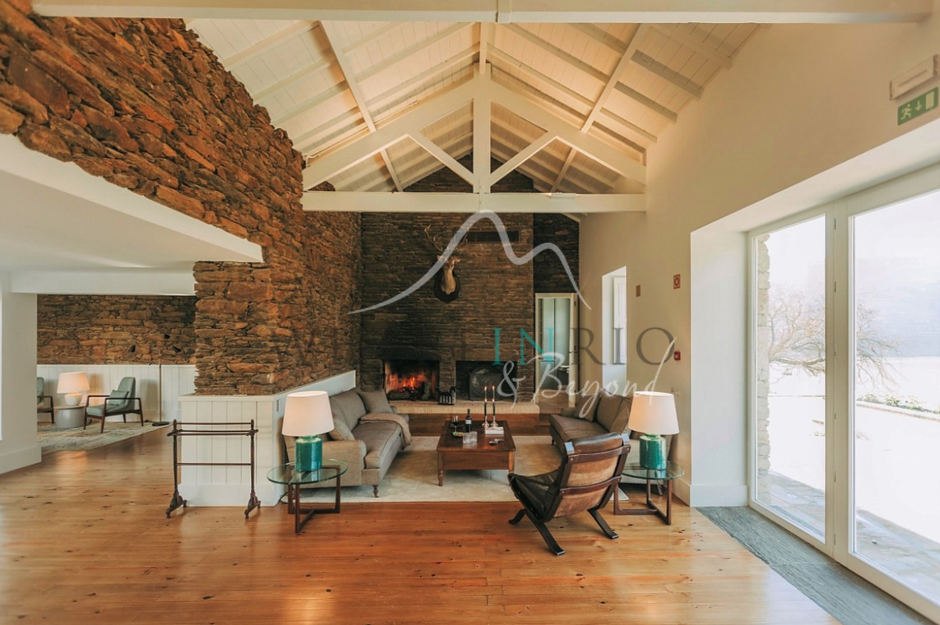 El interior de la villa está diseñado en el estilo de un albergue de pesca tradicional, combinando encanto clásico con comodidades modernas. Su amplia área central de estar y comedor cuenta con suelos de madera, paredes de ladrillo y muebles exquisitos, creando una atmósfera cautivadora. Amplios sofás en tonos suaves de beige y marrón complementan la decoración, mientras que las chimeneas dobles y la cabeza de ciervo montada añaden un toque de tradición y calidez.