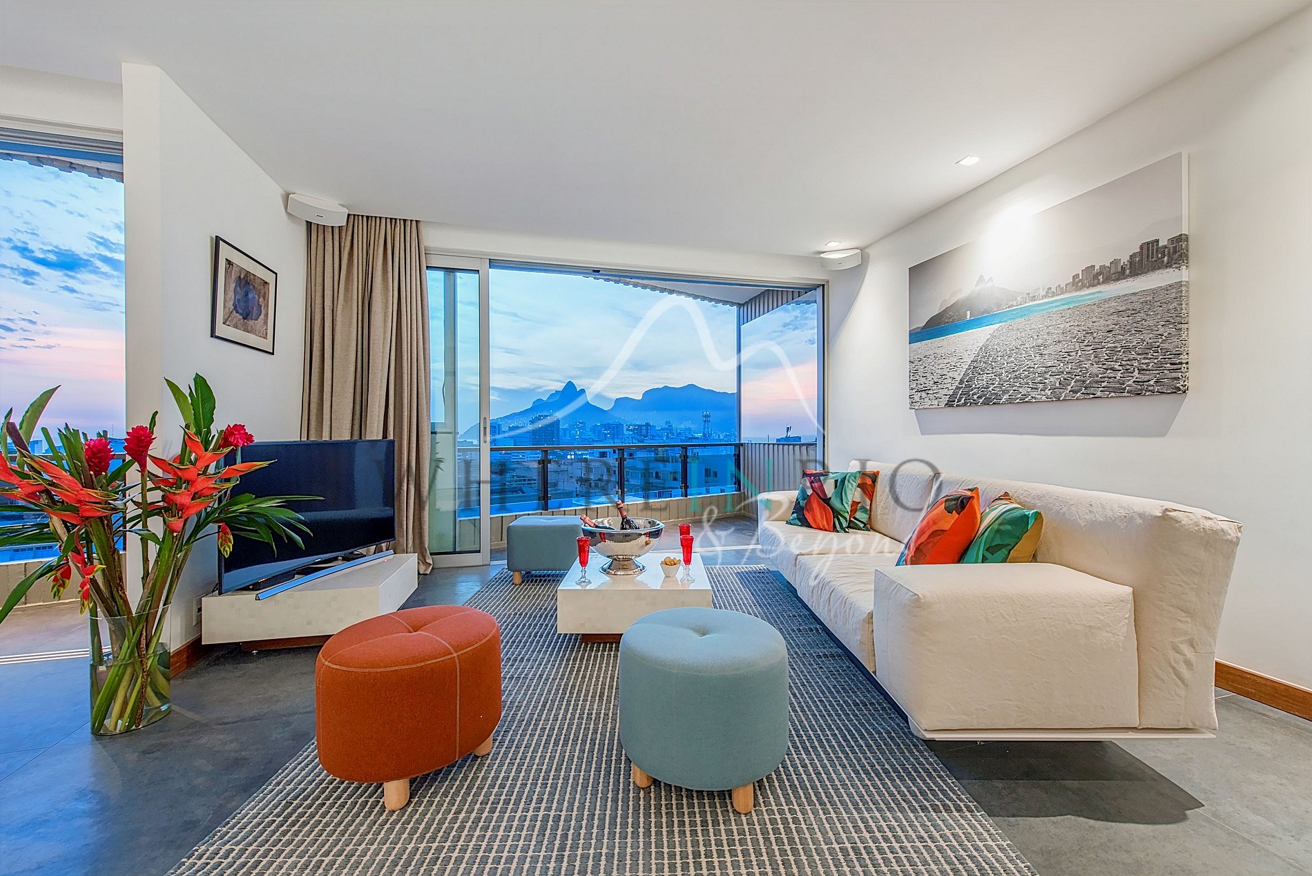 Ambos lados de la propiedad ofrecen maravillosas vistas del océano y las montañas. El salón tiene vistas al Morro Dois Irmãos.