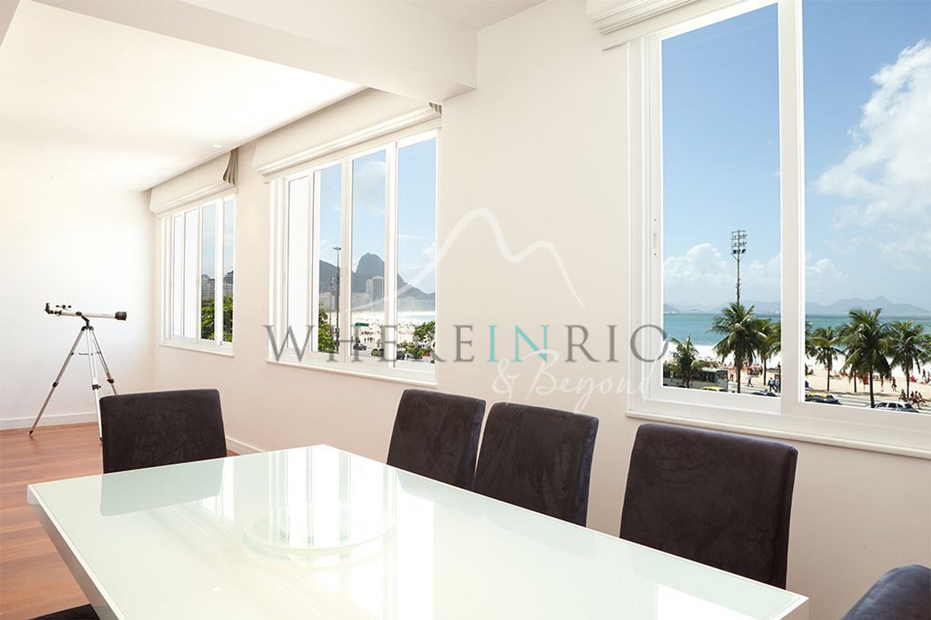El apartamento dispone de tres dormitorios con camas dobles. La habitación principal tiene un gran vestidor y televisión. La segunda cuenta con escritorio ideal para trabajar o leer. La sala de estar y comedor ofrecen una vista espectacular de la Playa de Copacabana. La cocina está equipada con horno, microondas, nevera y estufa.