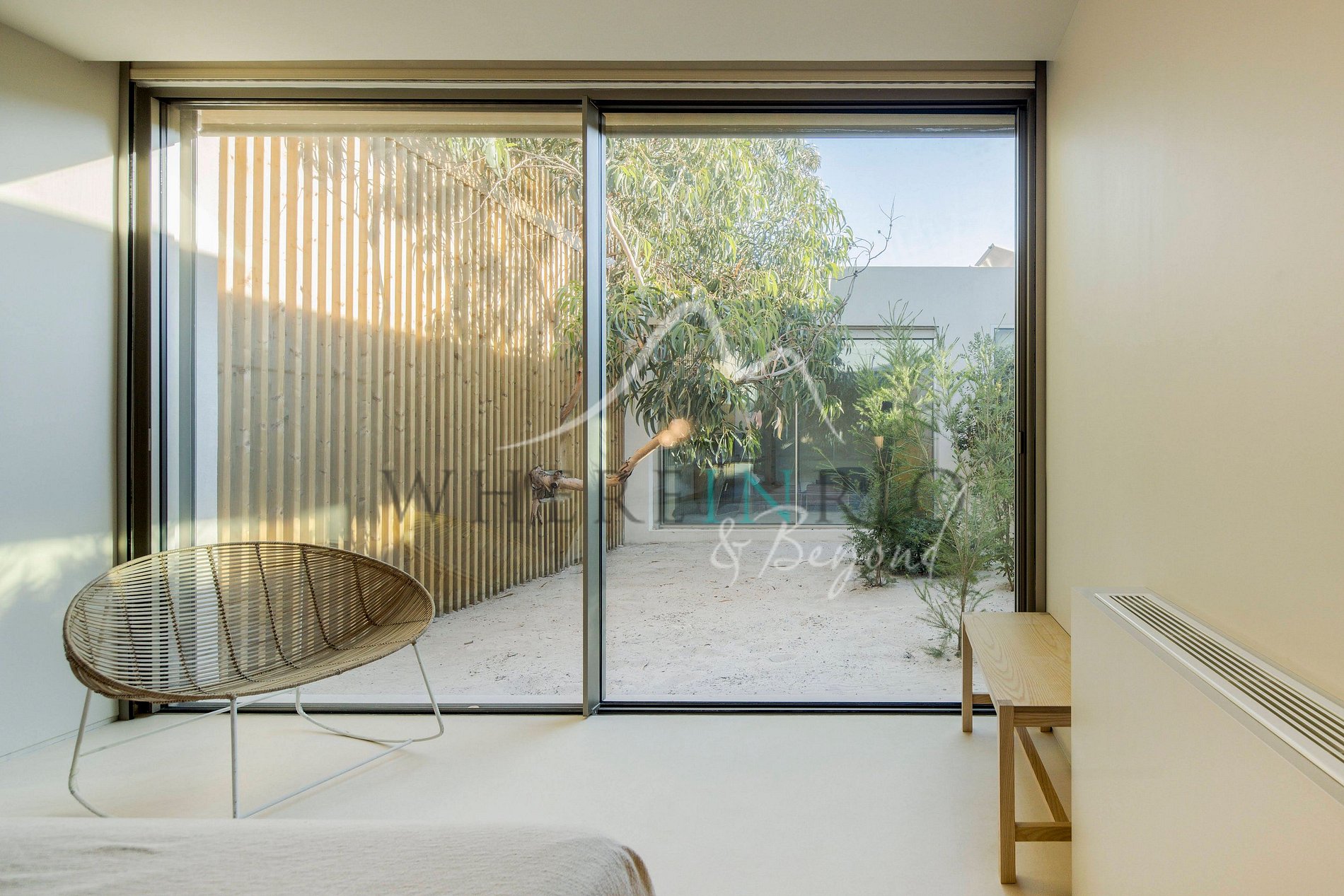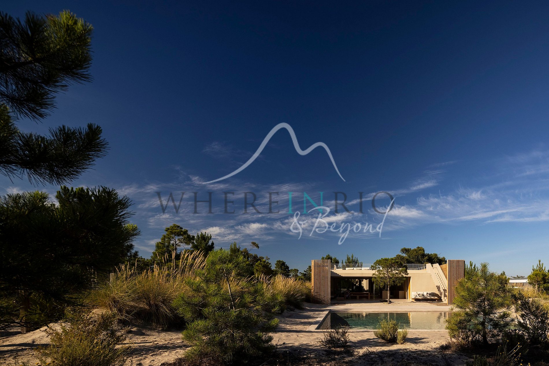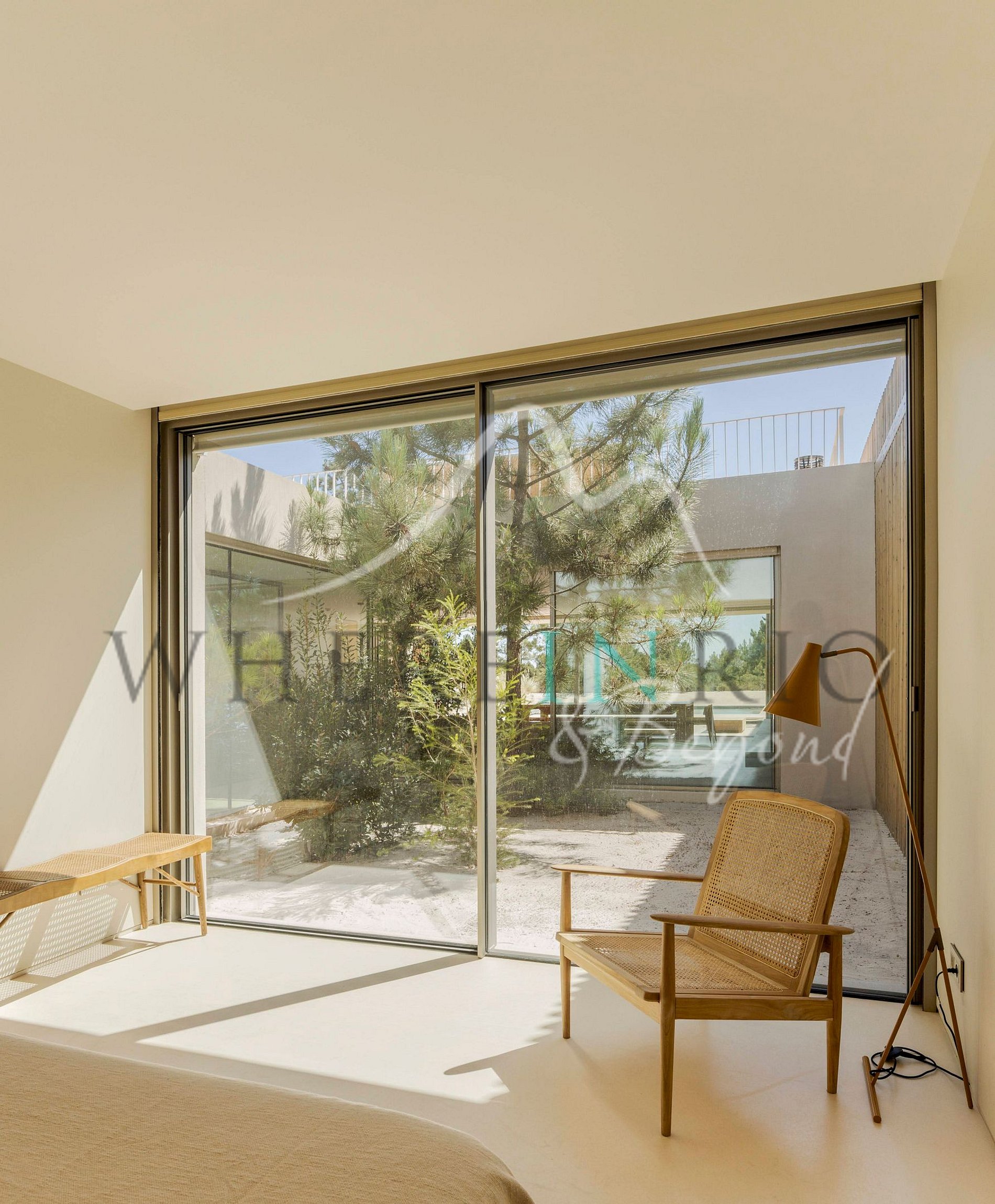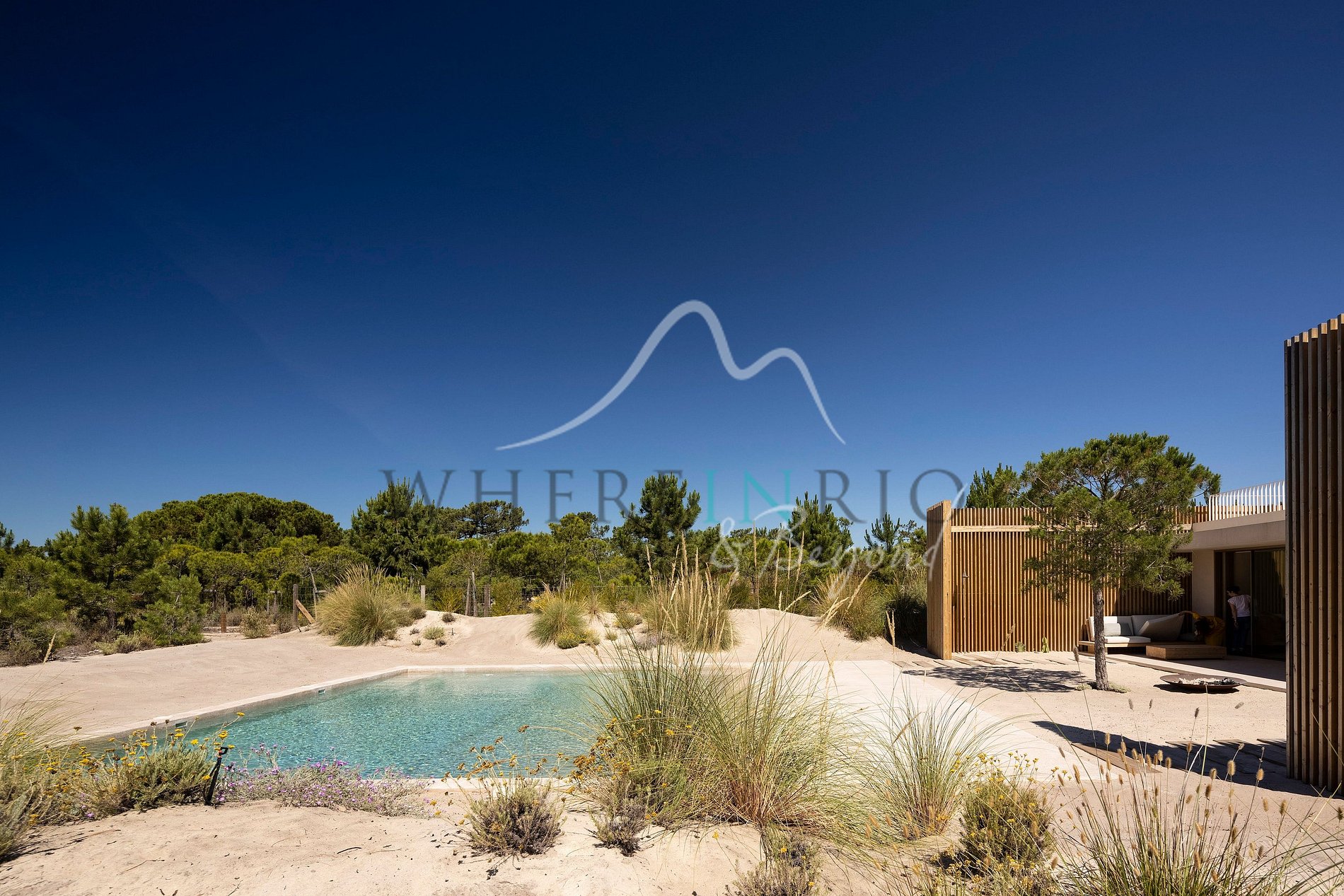 Con una superficie de 400 metros cuadrados, está situada en la cima de las dunas, en medio de un bosque mediterráneo. El diseño incorpora cuatro jardines interiores que traen la naturaleza al interior de la casa. Una cocina de planta abierta, sala de estar y comedor ofrecen vistas a un patio al aire libre y a la piscina.