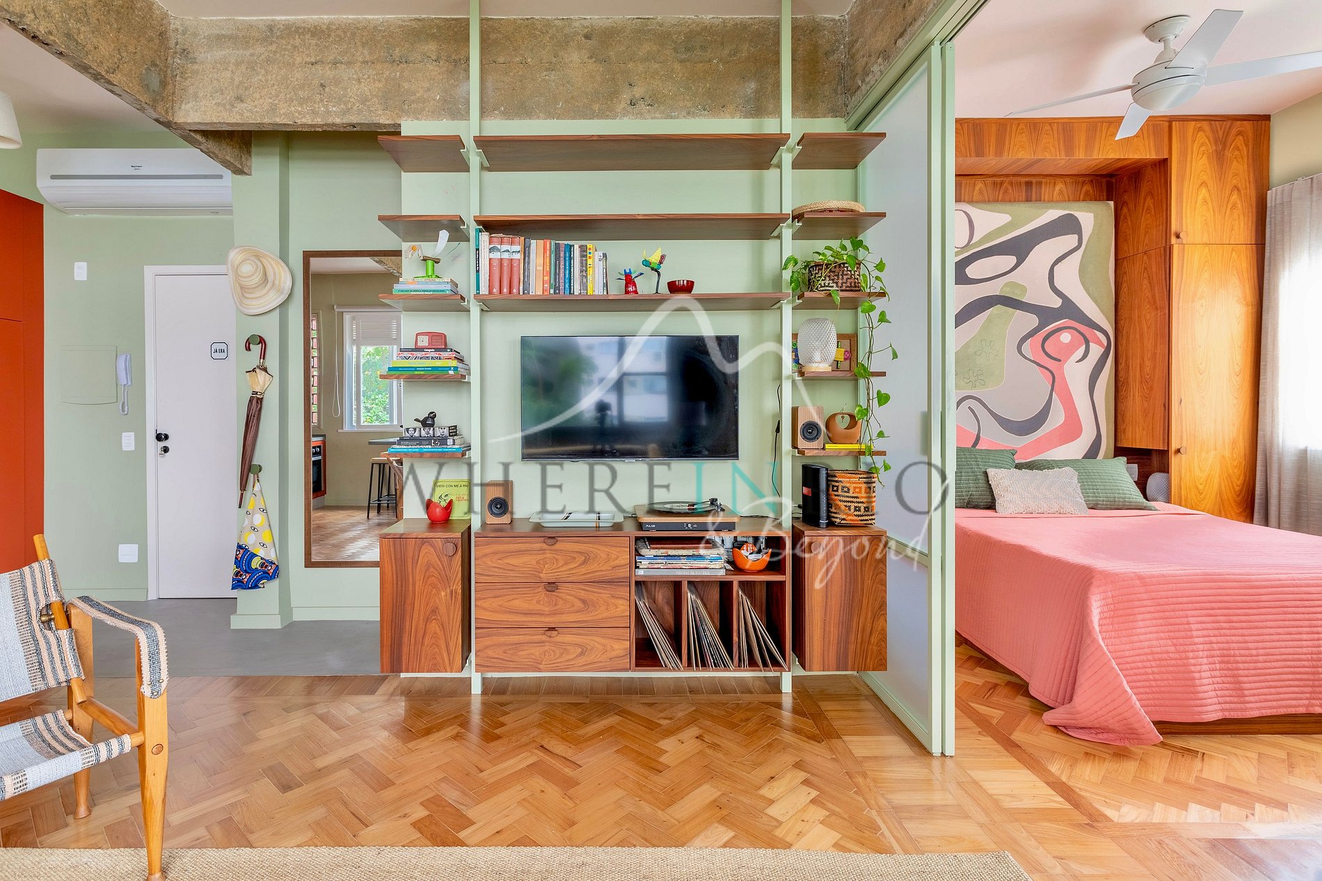 El espacio integra todas las áreas con estilo: sala con sofá cama, cocina abierta totalmente equipada con lavadora y secadora, dormitorio con puerta corrediza para privacidad y baño moderno. Decorado con colores cálidos, ofrece un ambiente acogedor, perfecto para vacaciones o trabajo remoto.