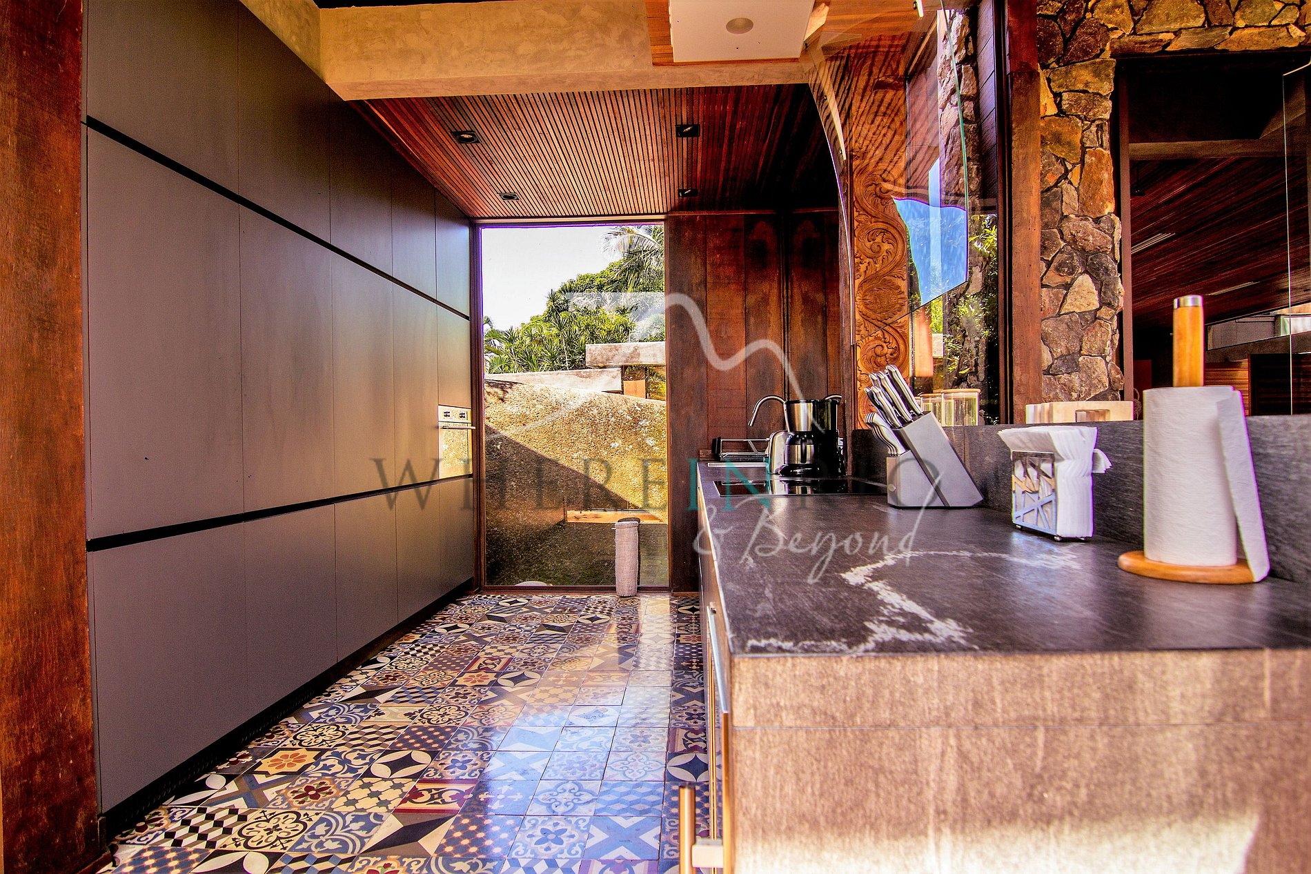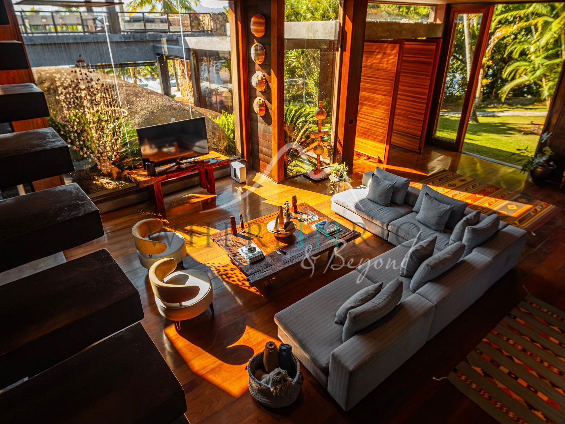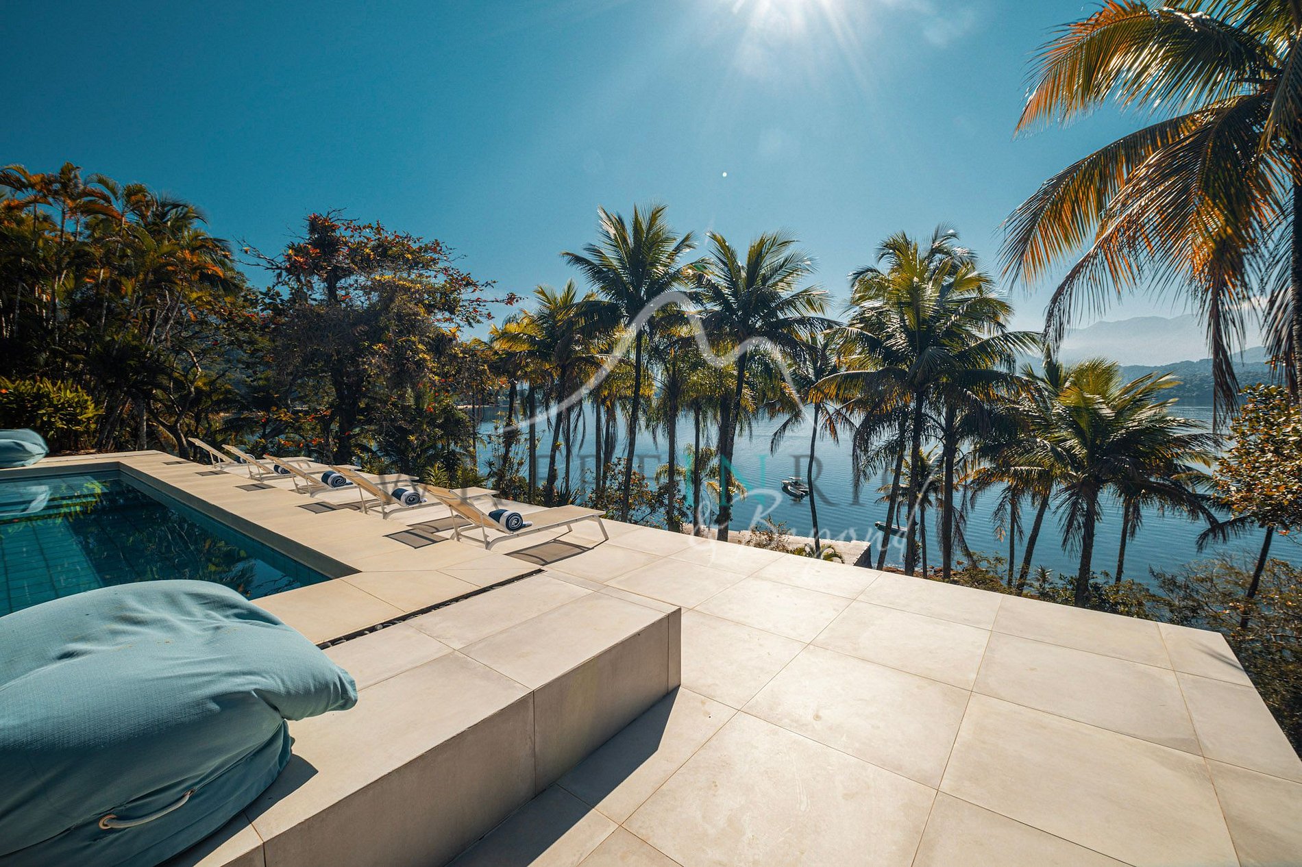 La isla cuenta con 5 suites: en la Casa Principal, 1 suite master y 1 suite king, y 3 bungalows con vista al mar. Áreas comunes: terraza exterior con comedor y barbacoa, piscina con deck y lounge, solárium, jacuzzi exterior y playa privada. Helipuerto para acceso rápido desde Río o São Paulo.