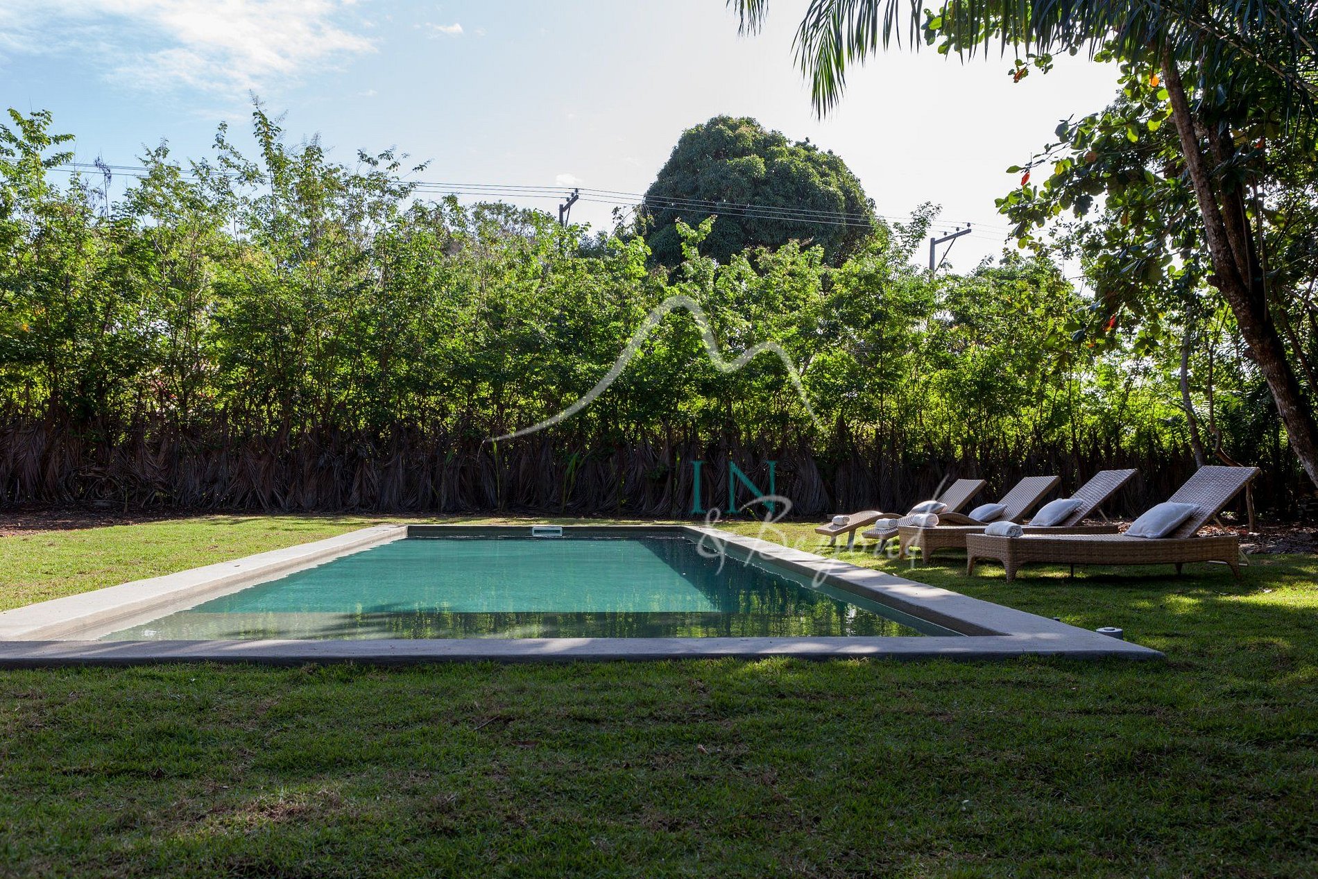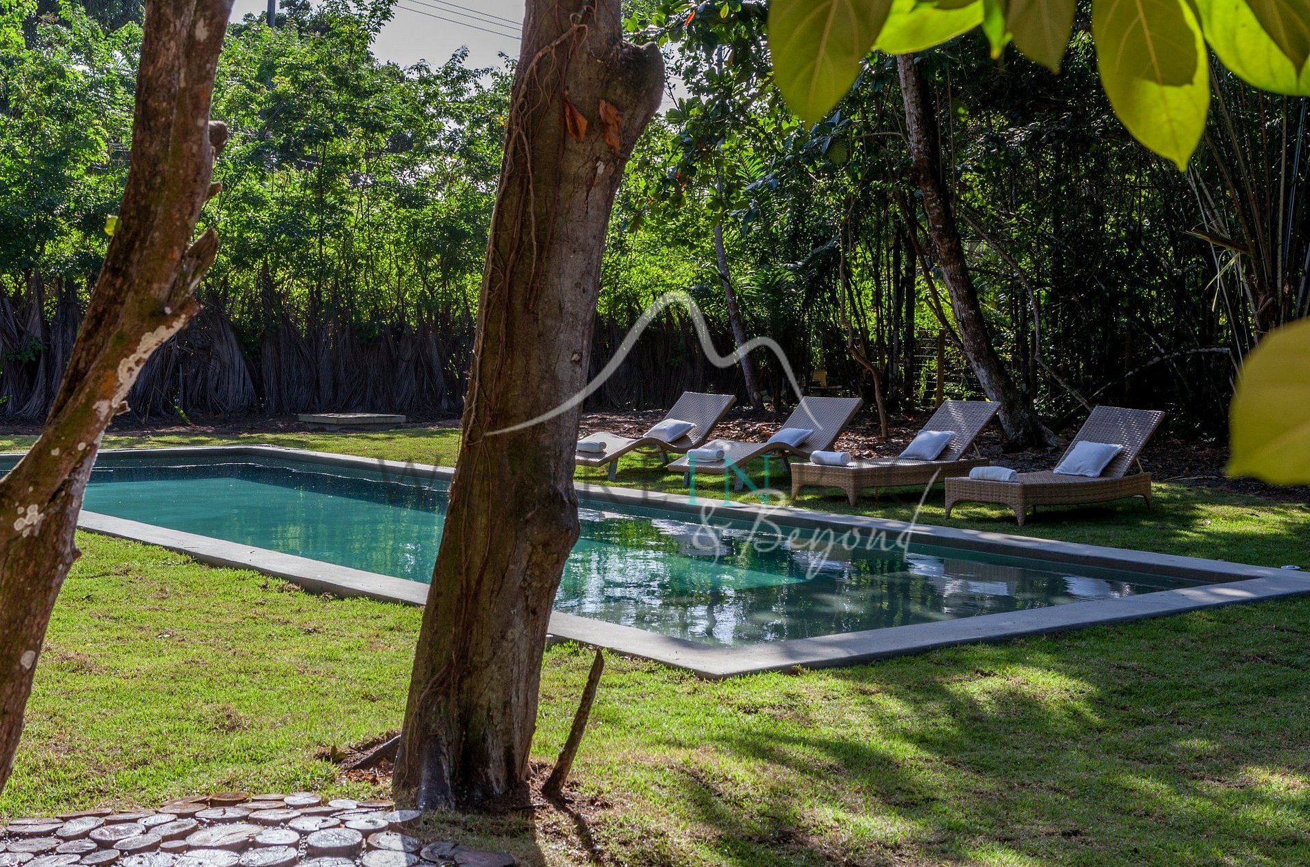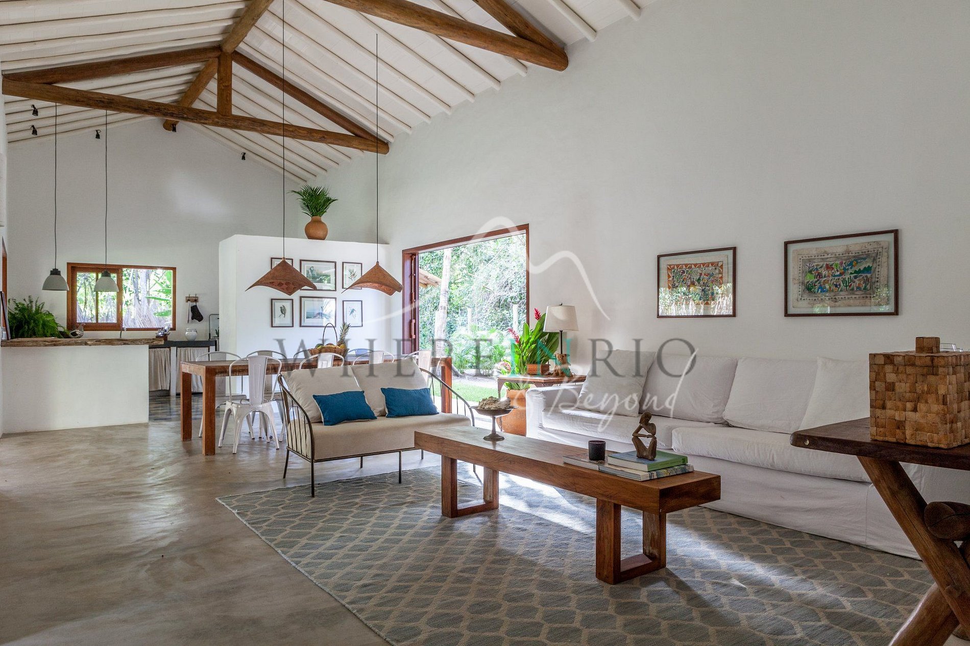 Amplio salón con techos altos y vigas a la vista. Terraza, piscina privada, zona de parrilla y jardín con espacios para descansar.