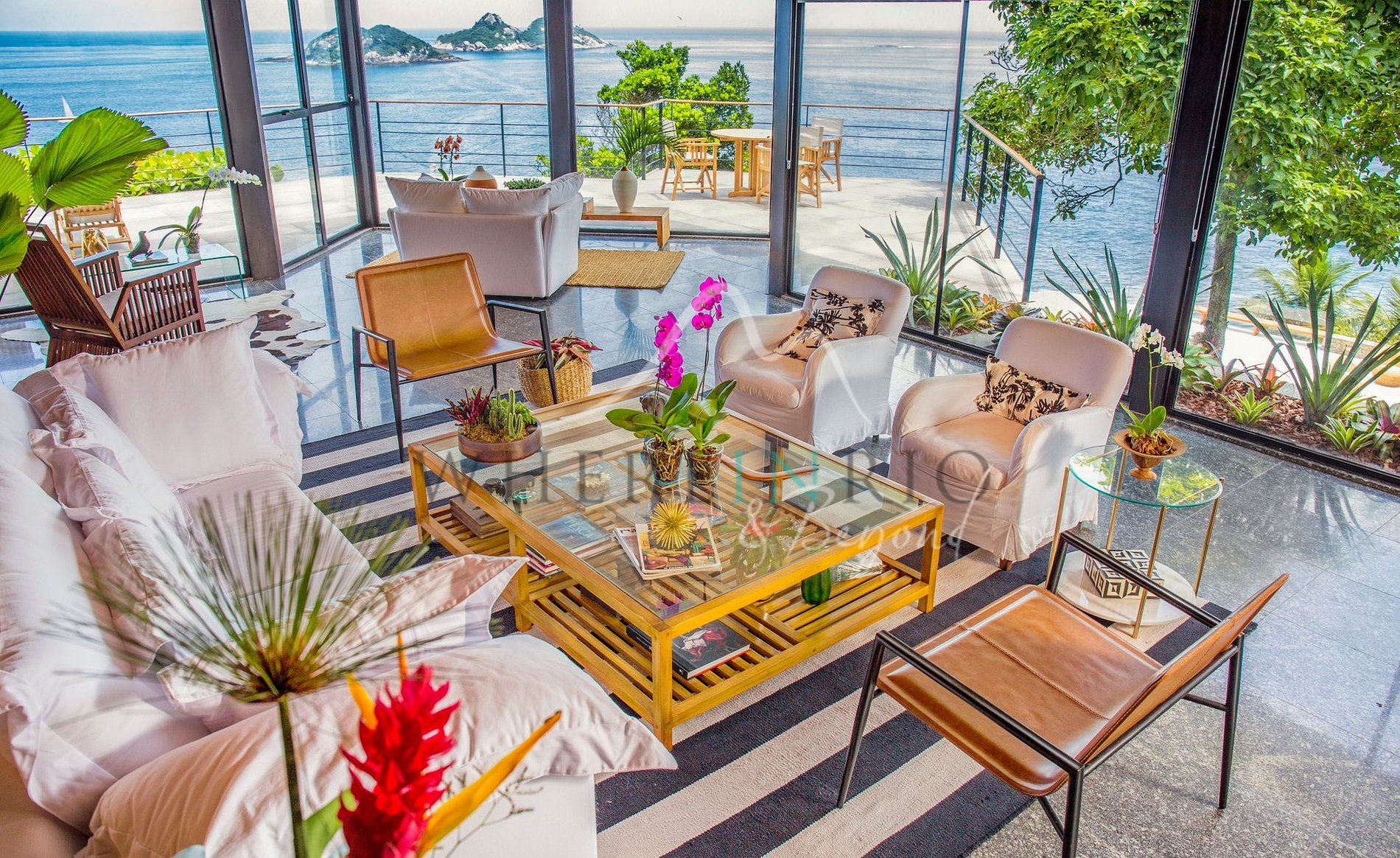 Impresionante mansión de lujo con piscina y vista panorámica al mar, disponible para alquiler vacacional en el exclusivo barrio de Joá, Río de Janeiro.