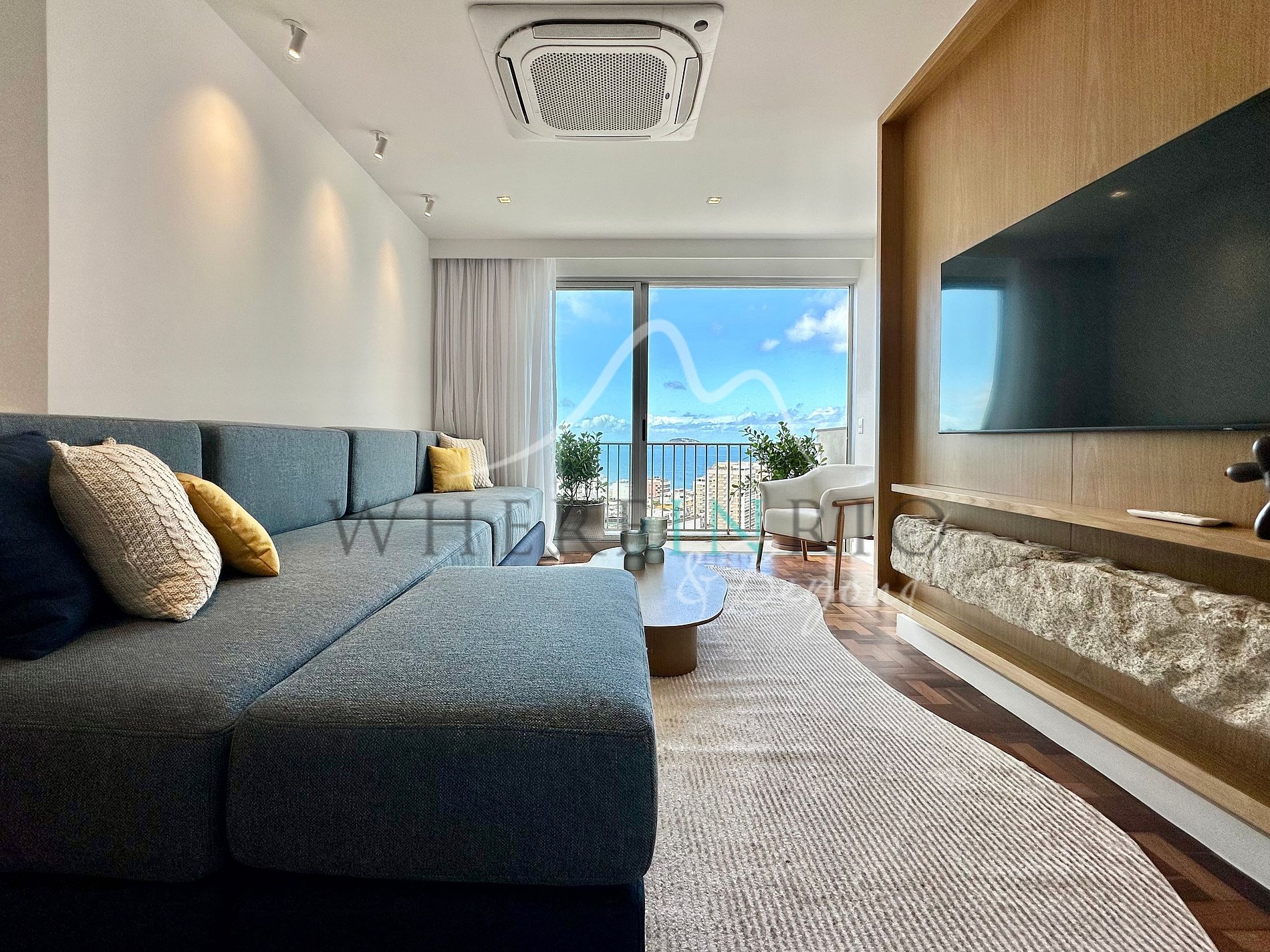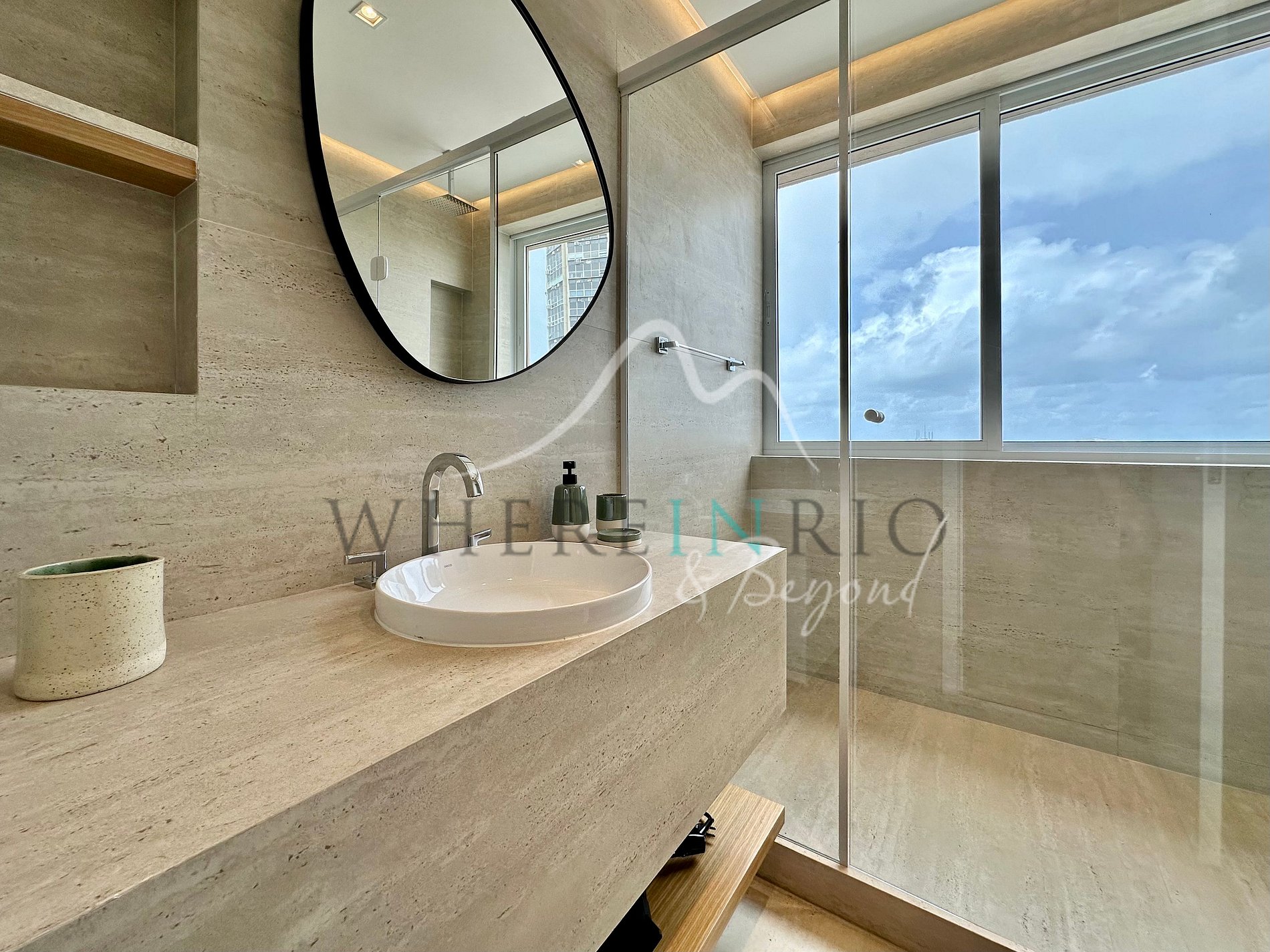 Penthouse duplex à Leblon, signé par Jean de Just, offrant une vue panoramique sur la ville, une luminosité naturelle abondante et un plan intelligent qui met en valeur l’intégration des espaces. Le premier niveau dispose de trois suites bien agencées : la suite principale avec lit king-size et placards intégrés, la deuxième avec deux lits simples pouvant être réunis en un lit king, et la troisième, polyvalente, idéale comme bureau ou salle de jeux pour enfants.