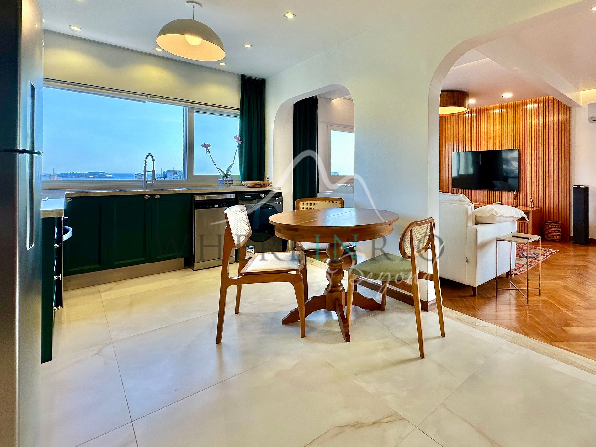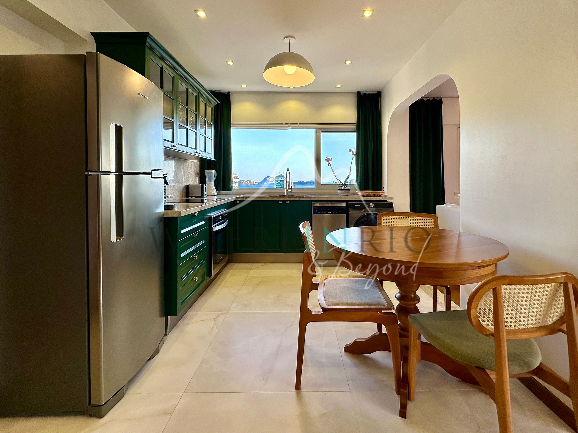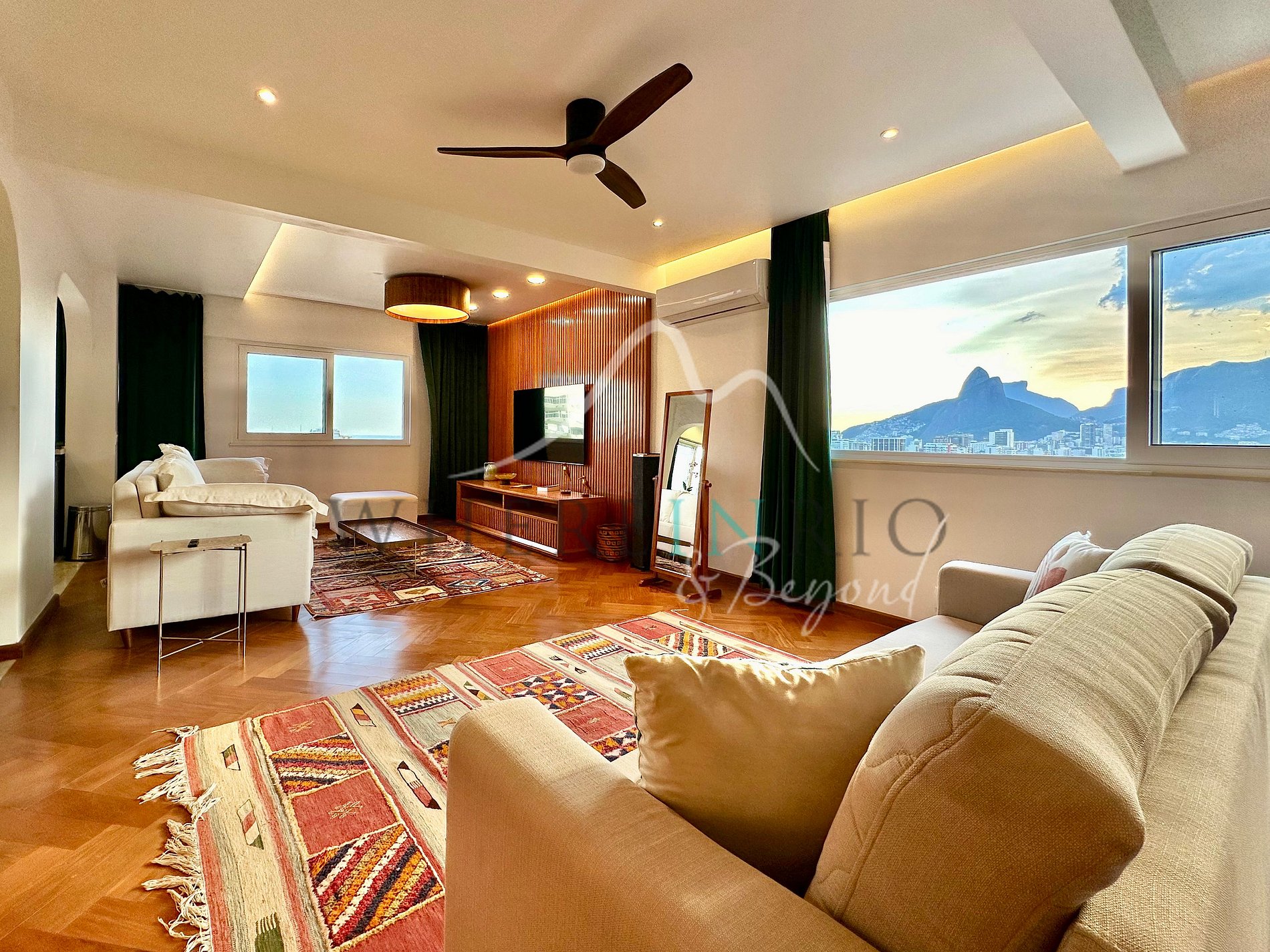 L’appartement de 80 m² dispose d’un salon confortable, d’une cuisine américaine moderne, d’une buanderie et d’un WC invité. Les deux chambres sont des suites avec placards intégrés. Les grandes fenêtres offrent une vue panoramique sur la Lagoa, l’océan et le Christ Rédempteur. La rénovation combine design contemporain et fonctionnalité pour un séjour élégant et confortable.