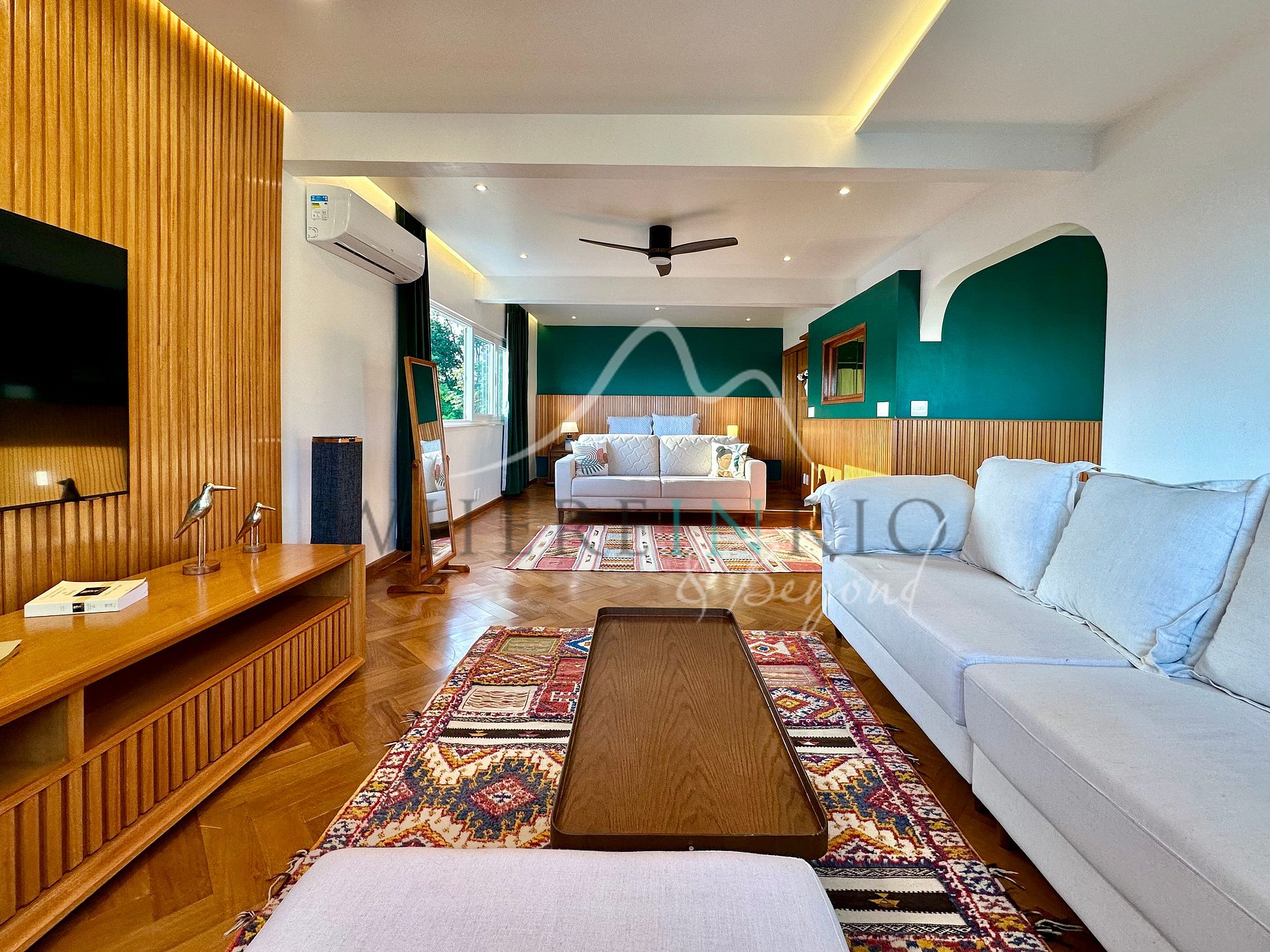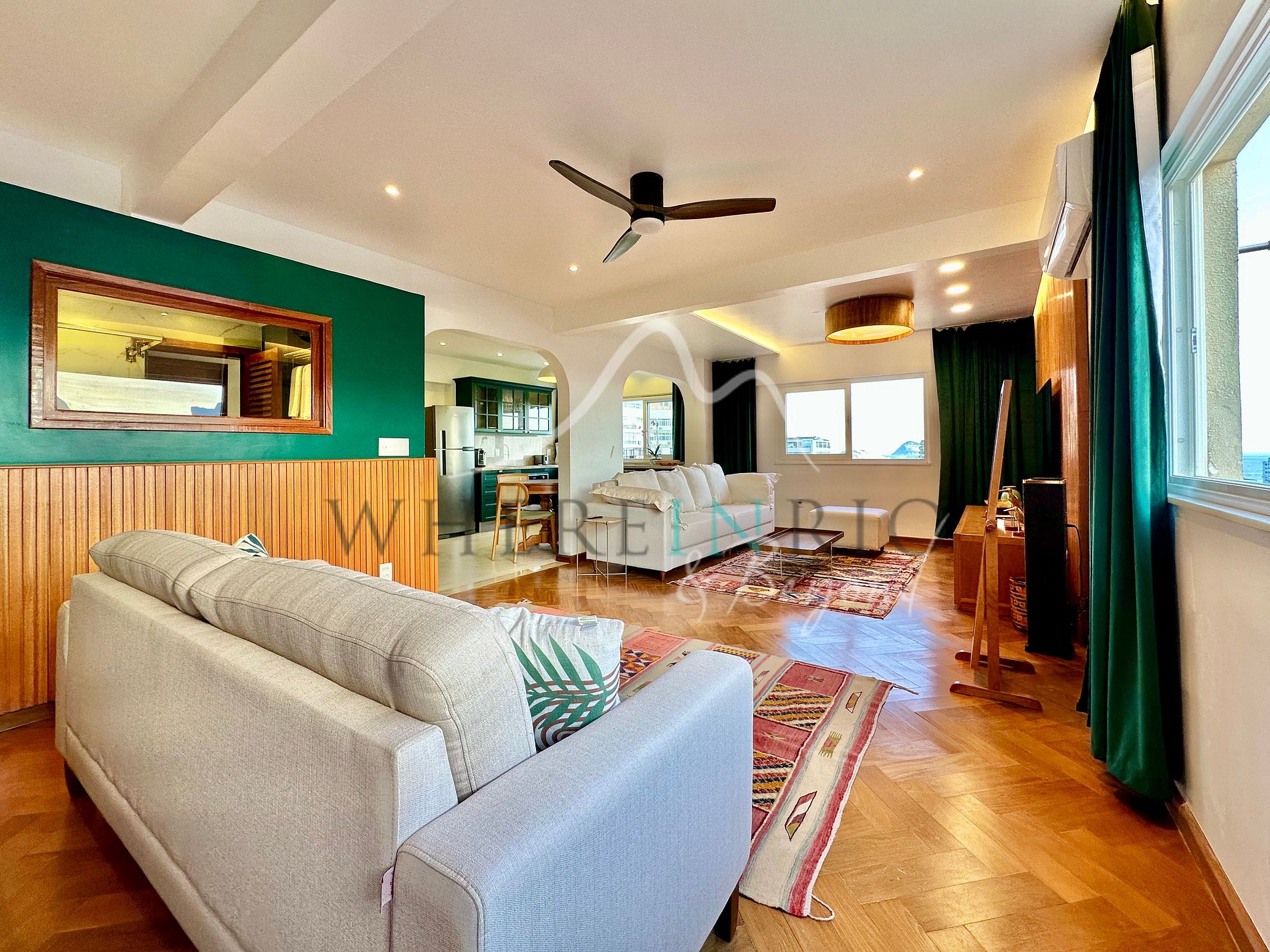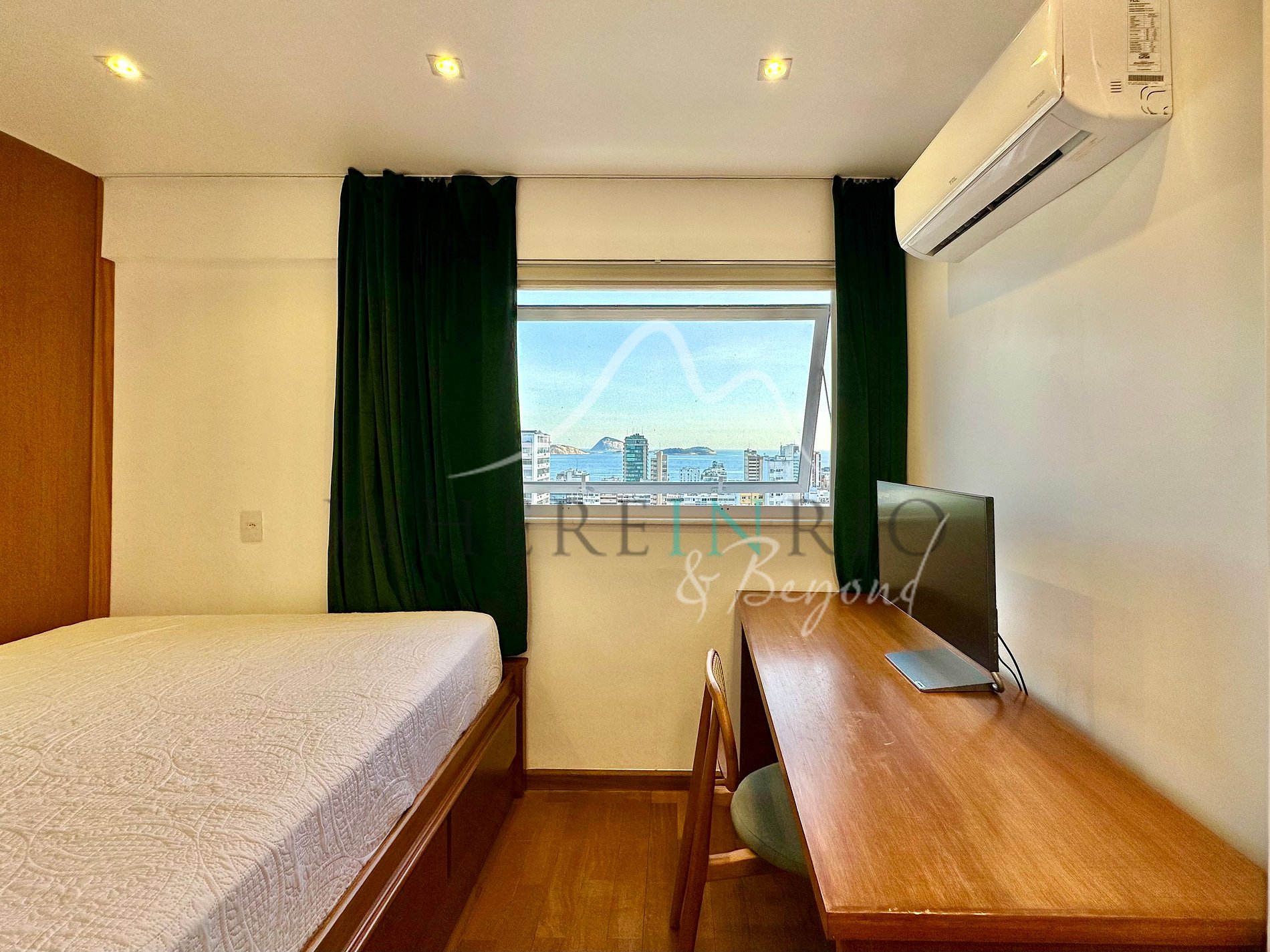 L’appartement de 80 m² dispose d’un salon confortable, d’une cuisine américaine moderne, d’une buanderie et d’un WC invité. Les deux chambres sont des suites avec placards intégrés. Les grandes fenêtres offrent une vue panoramique sur la Lagoa, l’océan et le Christ Rédempteur. La rénovation combine design contemporain et fonctionnalité pour un séjour élégant et confortable.