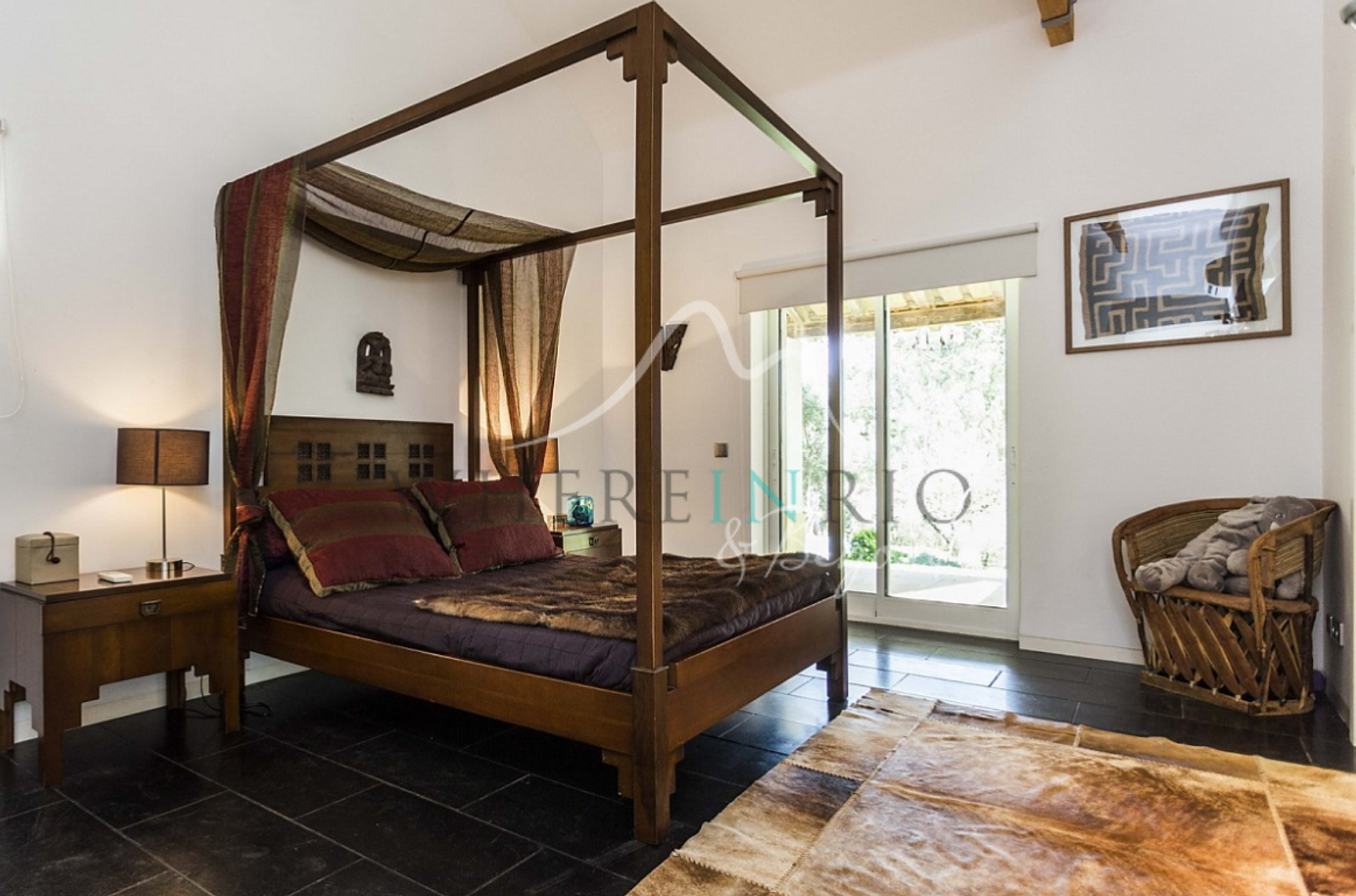 Les quatre suites sont généreusement spacieuses et confortables, toutes donnant accès à la terrasse et au jardin, certaines offrant une vue sur la piscine. À l'étage, une spacieuse mezzanine en verre abrite le bureau.