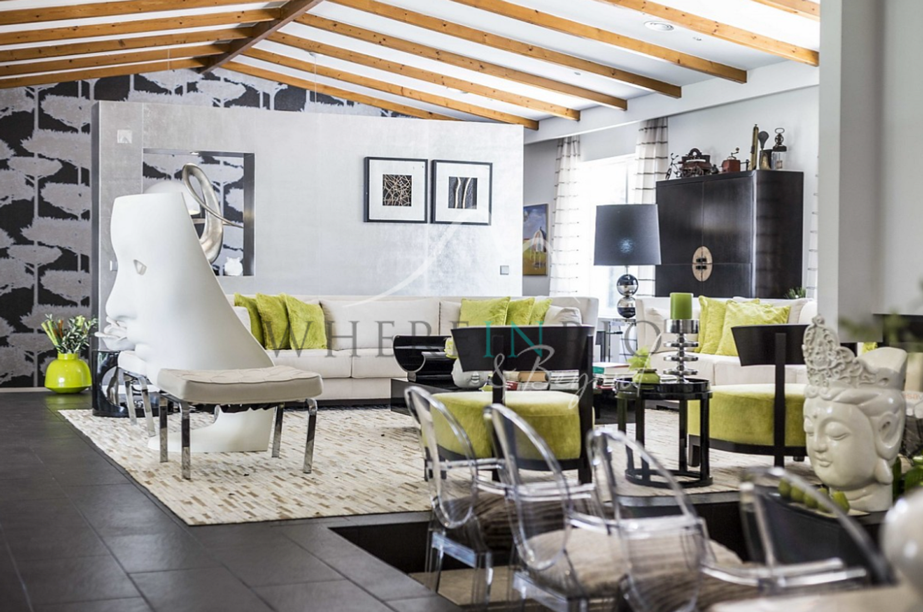 Le design de la maison principale est moderne et coloré, et le salon est magnifique et confortable, avec de grandes portes-fenêtres offrant une vue sur le jardin et la piscine. Autour de la villa se trouve une terrasse équipée de chaises longues et de petites tables.