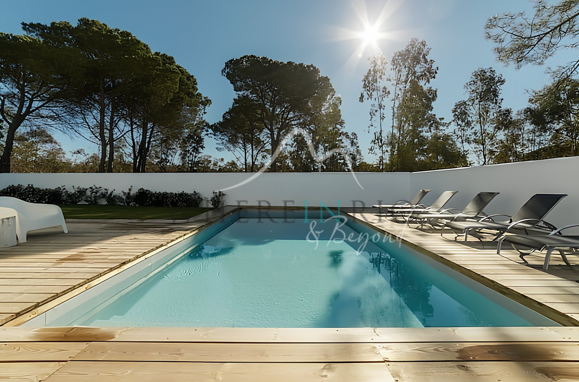 À l'extérieur, la terrasse révèle une délicieuse piscine, des chaises longues et un espace ombragé pour les repas au bord de la piscine. Le service de nettoyage hebdomadaire ajoute à la commodité, tandis qu'une station de barbecue au milieu d'une forêt de pins immaculée promet des repas en plein air mémorables. Avec un wifi rapide, cette villa sert également de refuge idéal pour travailler depuis chez soi.