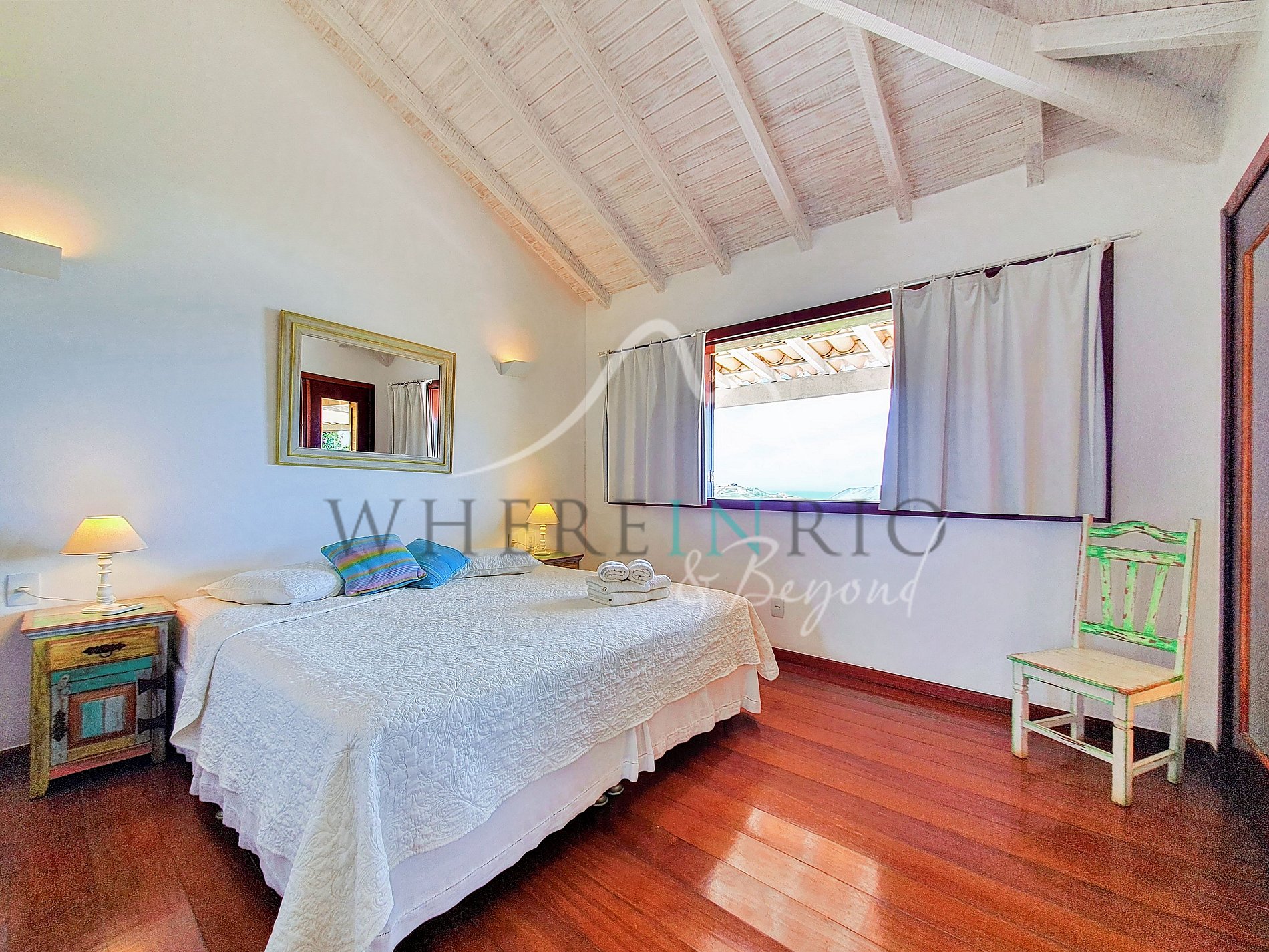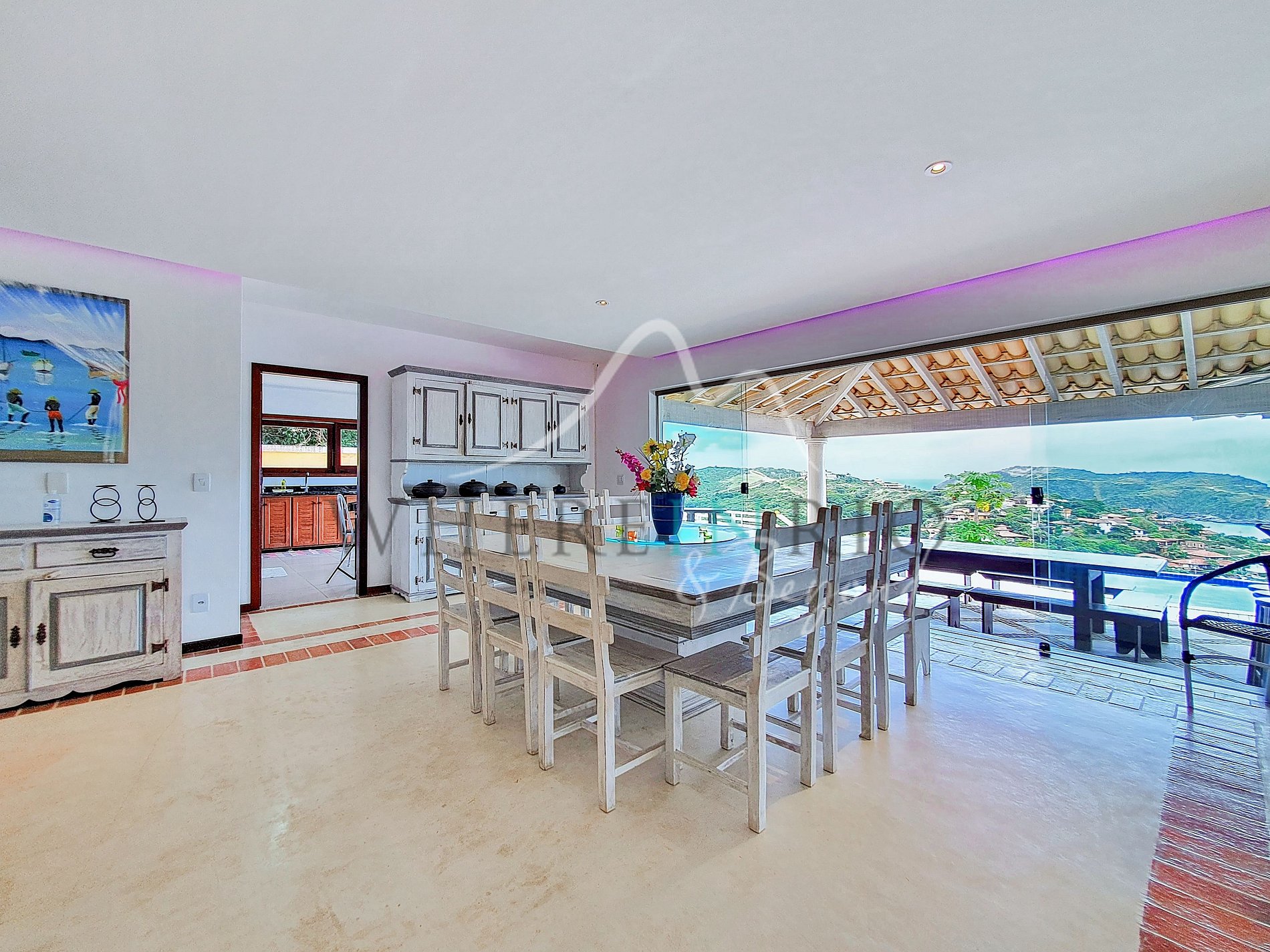 Cette maison de 300 m² offre une vue panoramique exceptionnelle sur l’océan et les montagnes. Les 4 suites possèdent des planchers en bois élégants, des salles de bain spacieuses et un accès direct à la véranda. Le salon s’ouvre sur la terrasse et la piscine, créant un cadre parfait pour des vacances de luxe à Búzios.