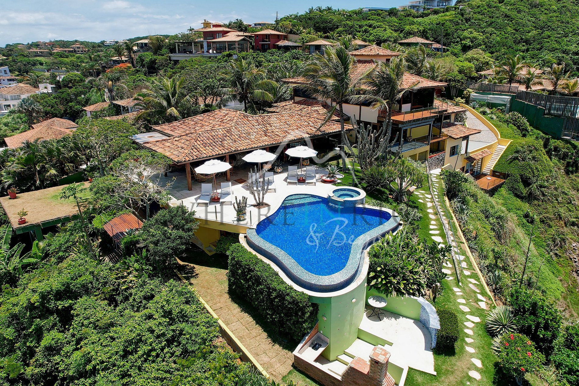 Villa de luxe de 677 m² à Búzios avec 3101 m² de terrain. Sur les hauteurs de Ferradura, elle offre l’une des plus belles vues sur l’océan, une piscine à débordement, un jacuzzi, un bar et un service hôtelier cinq étoiles.