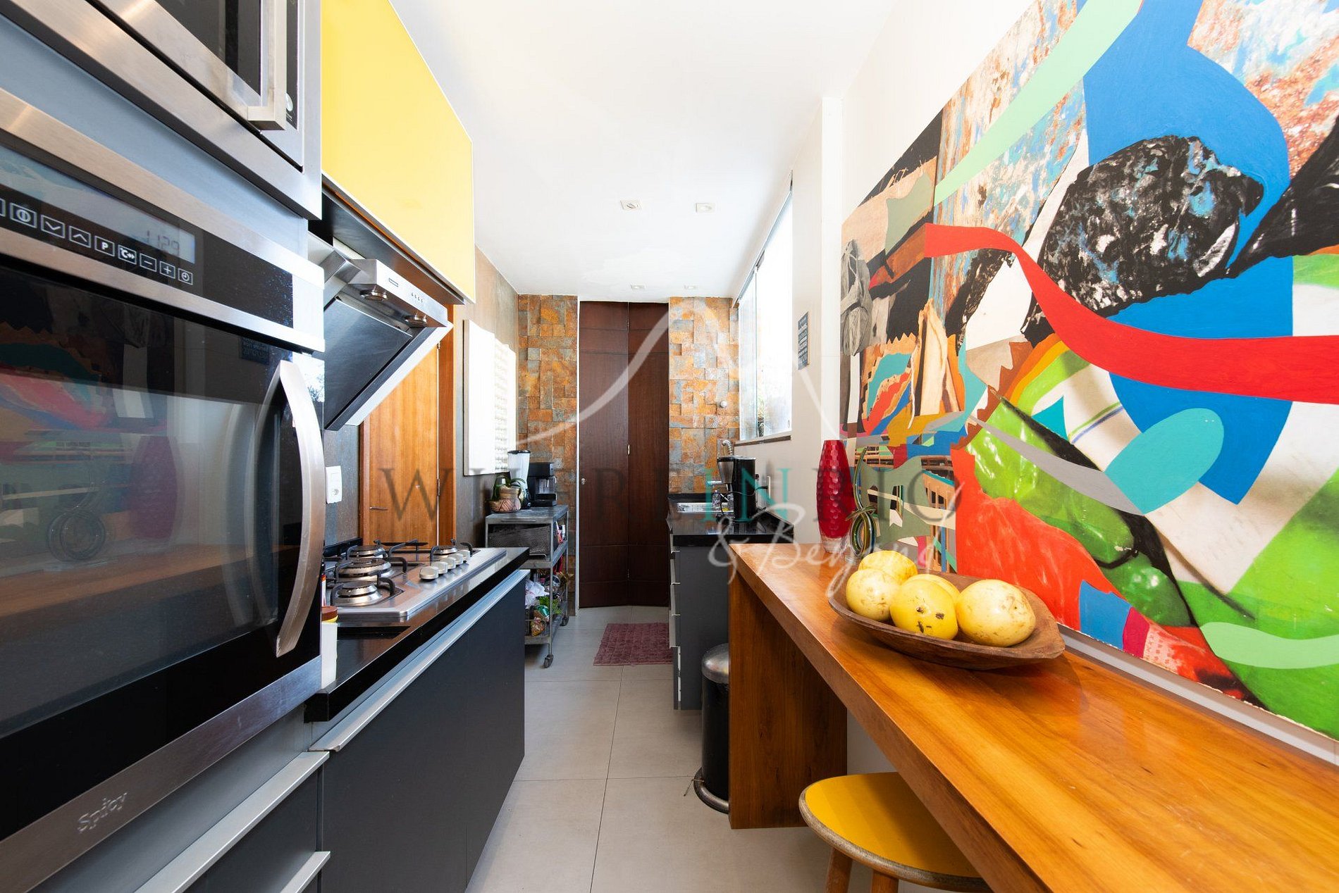 Le premier étage est composé d’un spacieux salon ainsi que d’une salle à manger particulièrement bien décorée dans le style des années 50. Cette pièce possède du mobilier crée par le célèbre designer Vladimir Kagan, mais aussi des objets d’art en cristal signés Elvira Schuartz, du bois rare brésilien (jacaranda) de Leo Bueno et des peintures/sculptures murales des artistes brésiliens les plus renommés.