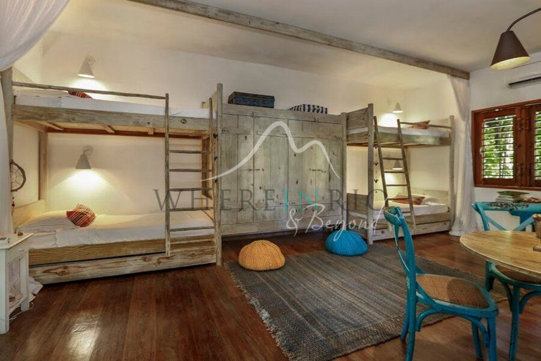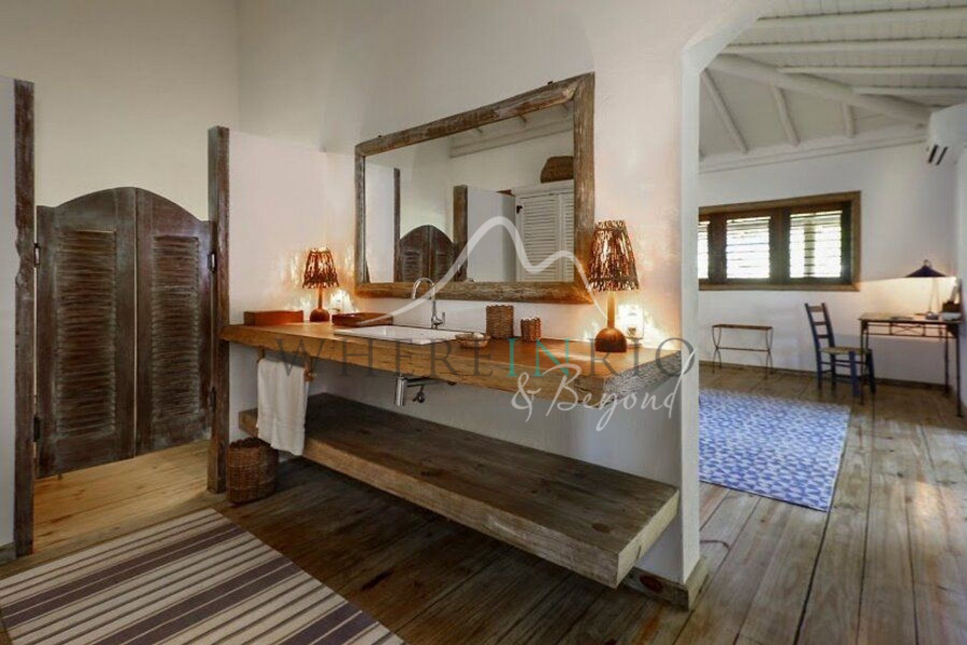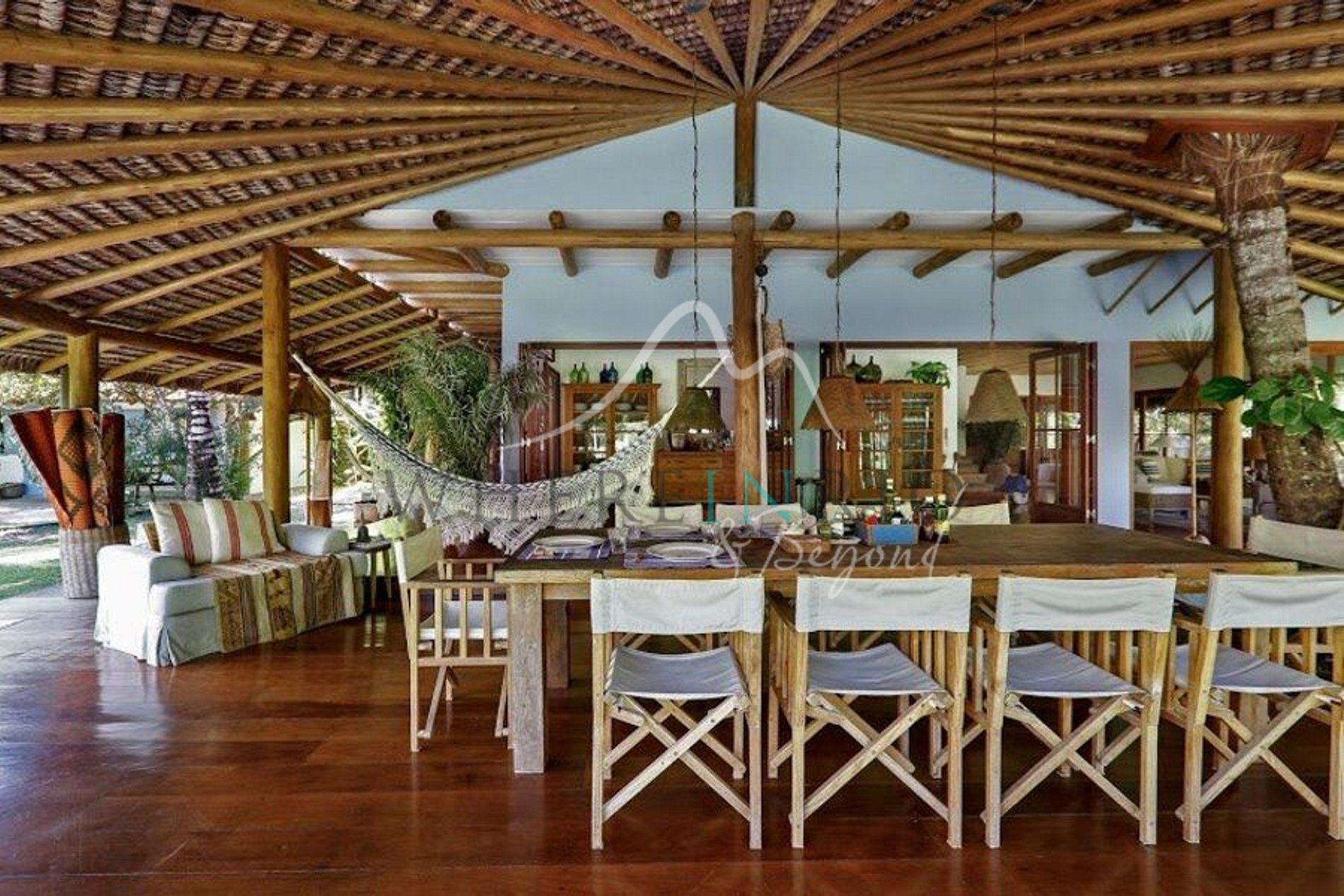Superbe propriété de luxe à Trancoso sur 6 600 m² avec deux maisons reliées. Peut accueillir jusqu’à 12 personnes avec 5 suites, dont une master avec vue mer et jacuzzi, piscine privée, cuisine gourmet et jardin de Mata Atlântica avec piscine de pierres et douche extérieure.