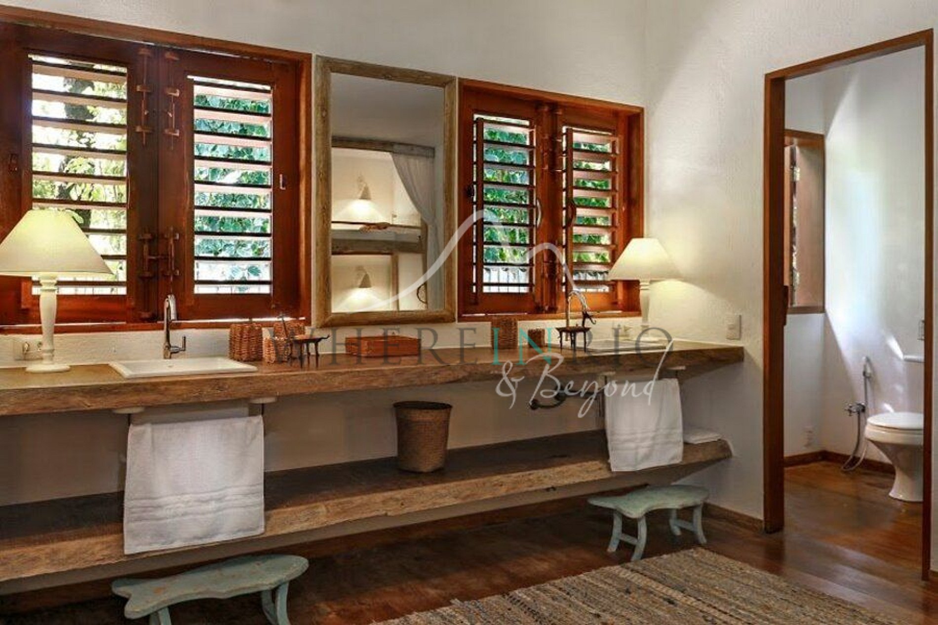 Superbe propriété de luxe à Trancoso sur 6 600 m² avec deux maisons reliées. Peut accueillir jusqu’à 12 personnes avec 5 suites, dont une master avec vue mer et jacuzzi, piscine privée, cuisine gourmet et jardin de Mata Atlântica avec piscine de pierres et douche extérieure.