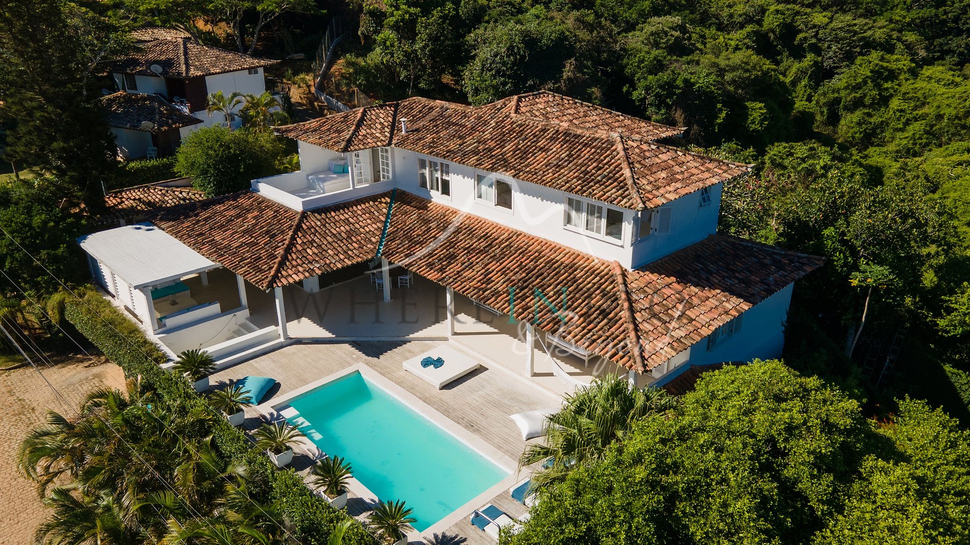 Superbe villa de luxe bleue et blanche à louer au-dessus de la plage de Ferradura à Búzios, avec vue imprenable sur la baie, cinq suites spacieuses et piscine avec deck en bois.