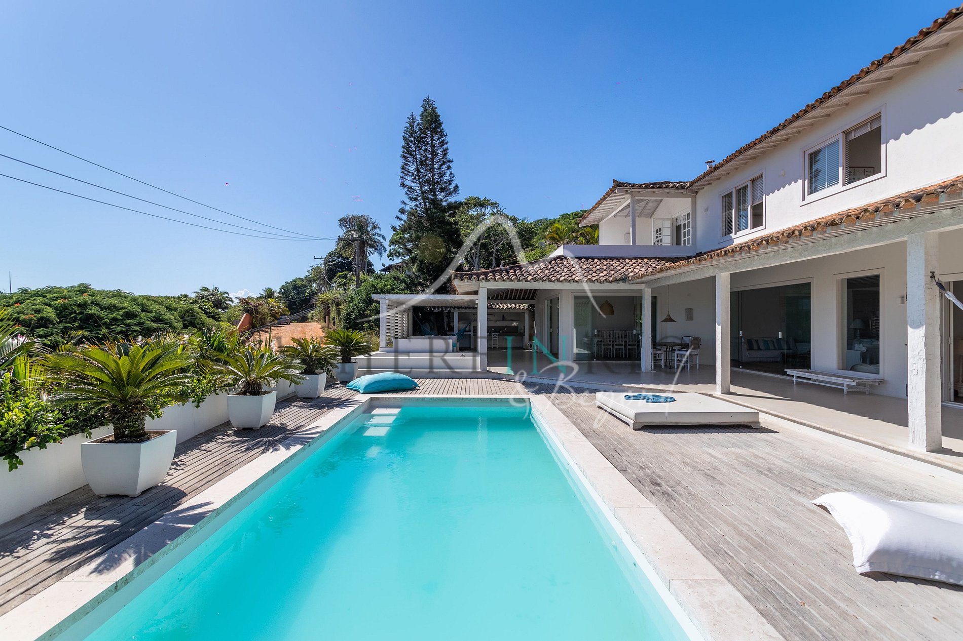 Superbe villa de luxe bleue et blanche à louer au-dessus de la plage de Ferradura à Búzios, avec vue imprenable sur la baie, cinq suites spacieuses et piscine avec deck en bois.