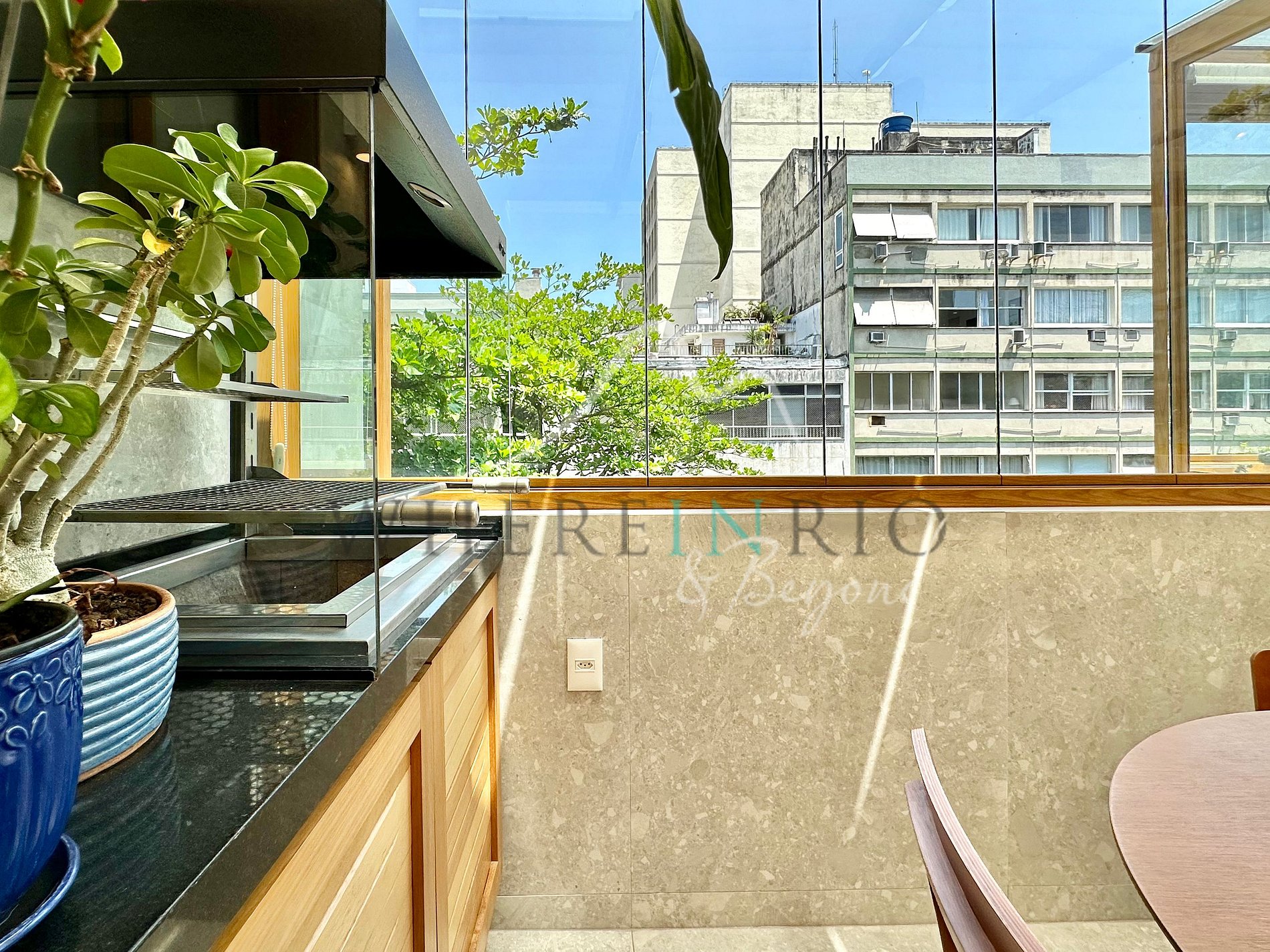 Appartement sophistiqué à Ipanema, au-dessus des cimes des arbres, avec espaces intégrés, design contemporain et balcon vitré doté d’une douche extérieure. Élégance, confort et connexion à la nature.