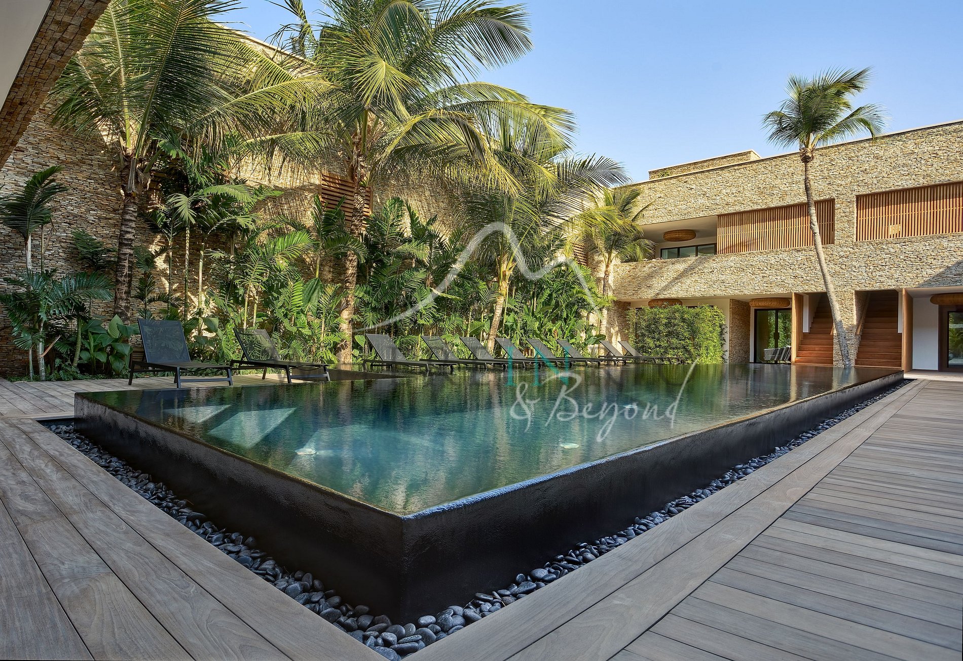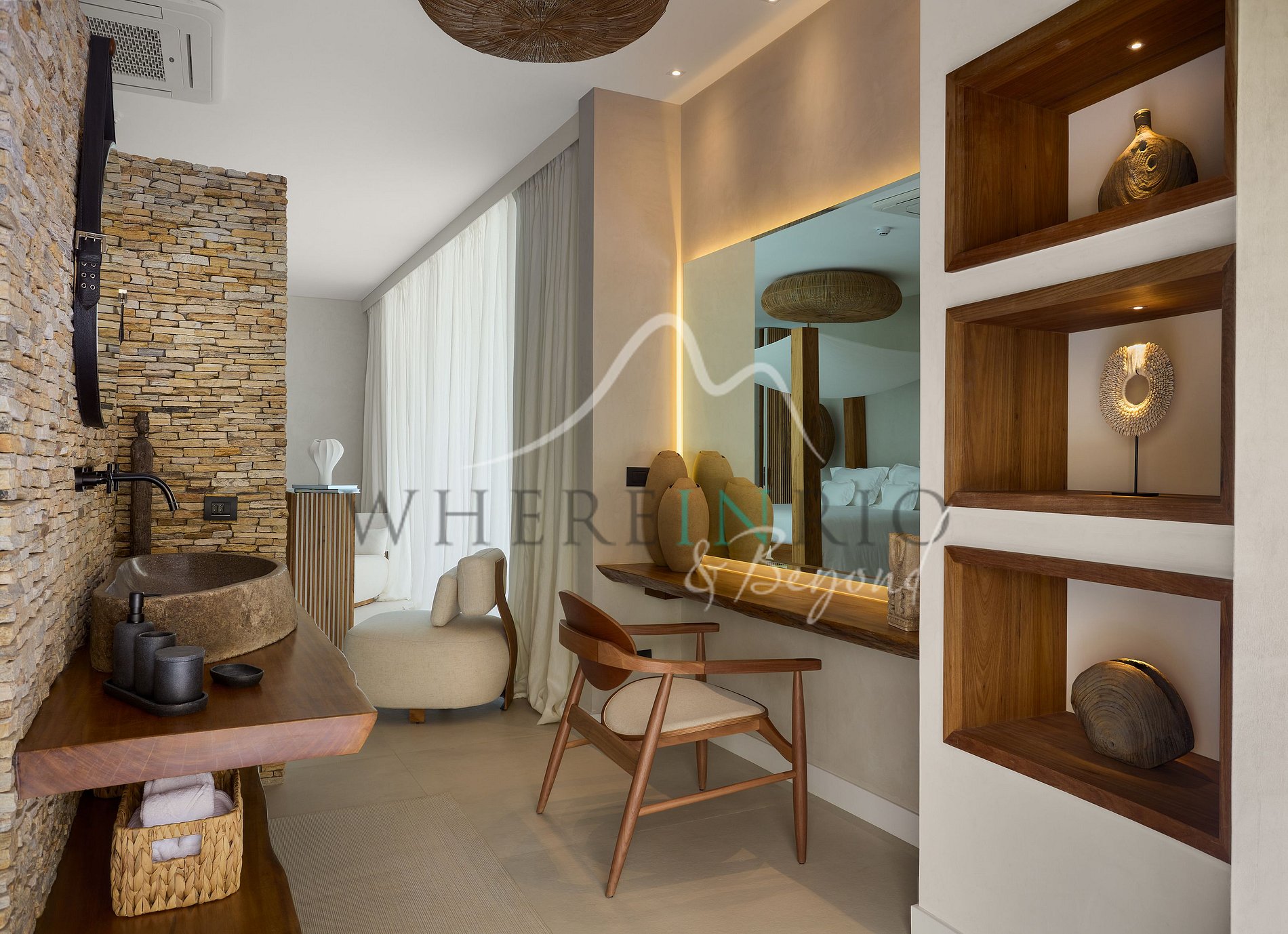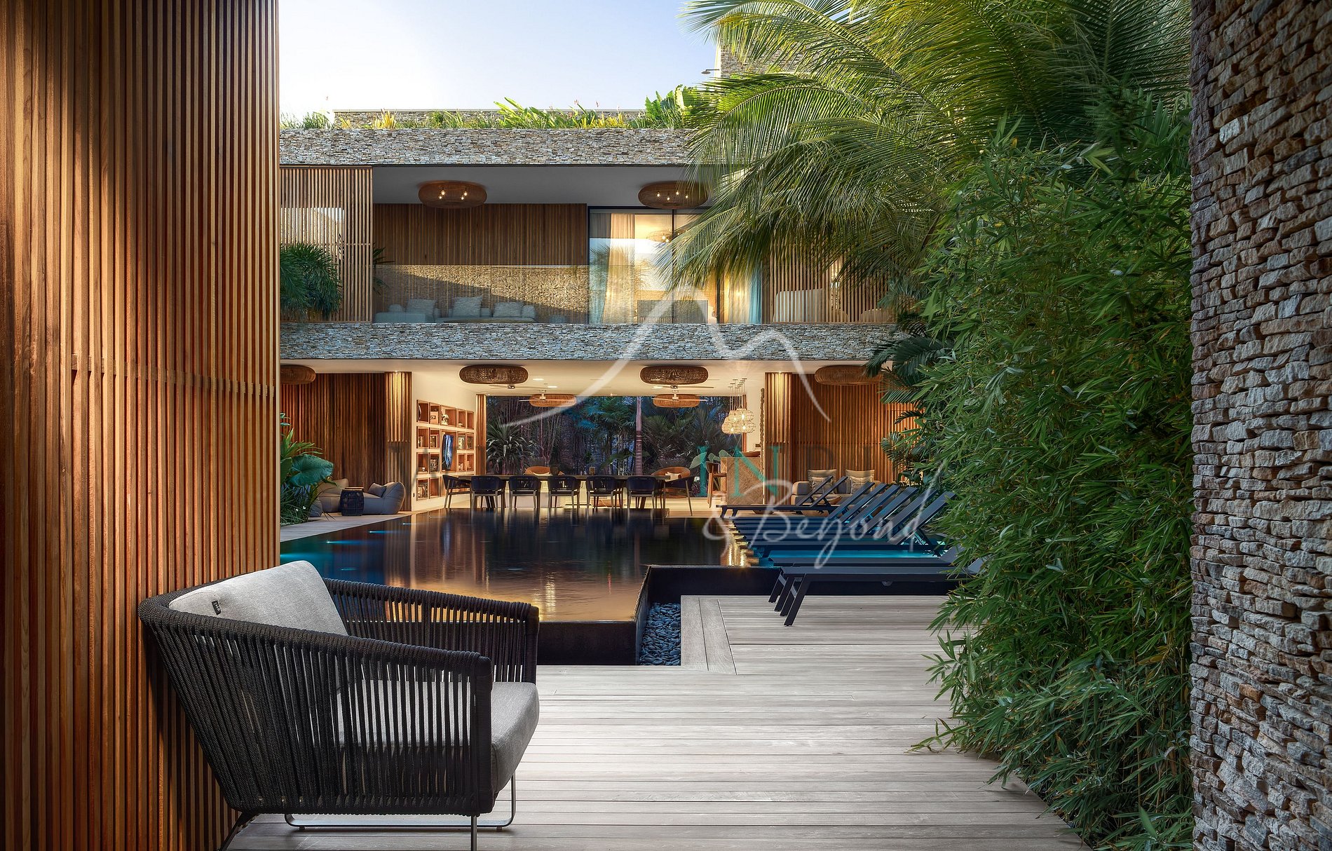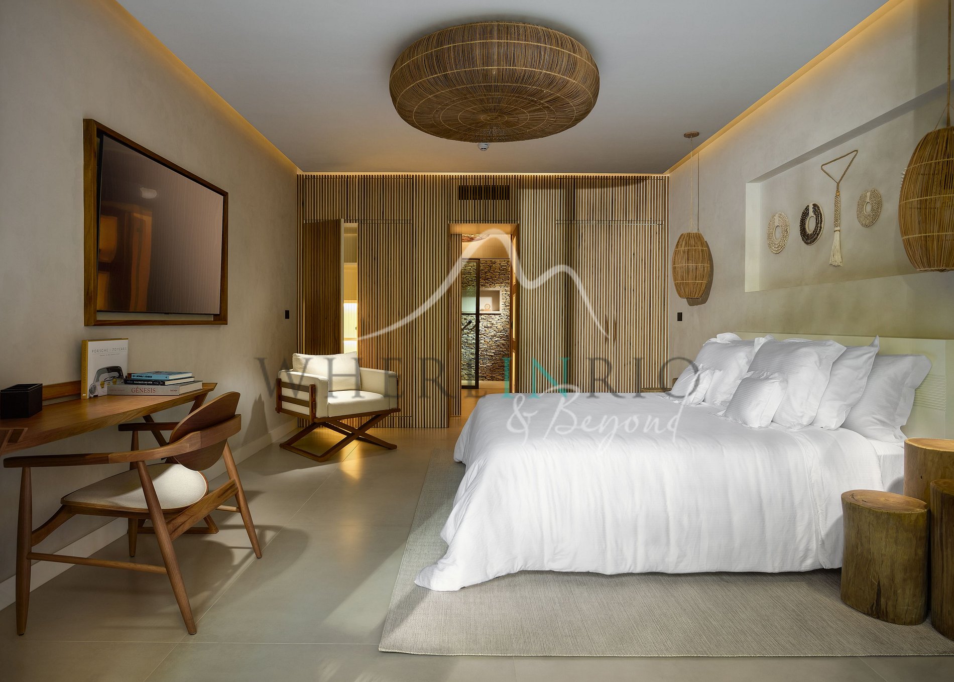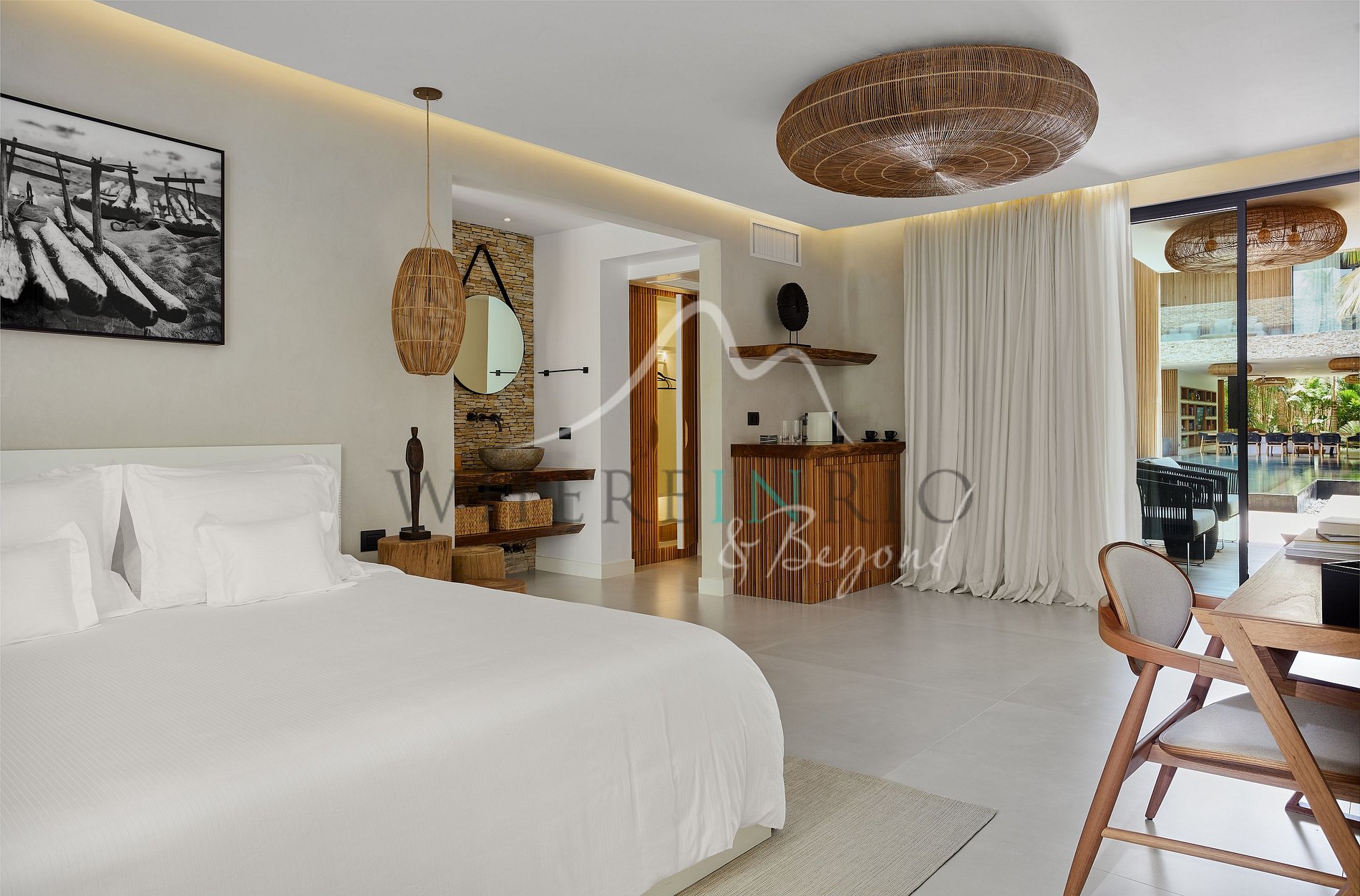 La villa comprend six suites élégantes, allant des Junior Luxe au rez-de-chaussée jusqu’à la spacieuse Suite Master de 235 m² avec rooftop privé et mini-piscine. Les rooftops offrent une vue imprenable sur le coucher du soleil et la piscine à débordement du jardin ajoute un charme unique. La décoration soignée, les matériaux rustiques et les meubles exclusifs créent une atmosphère sophistiquée et accueillante.