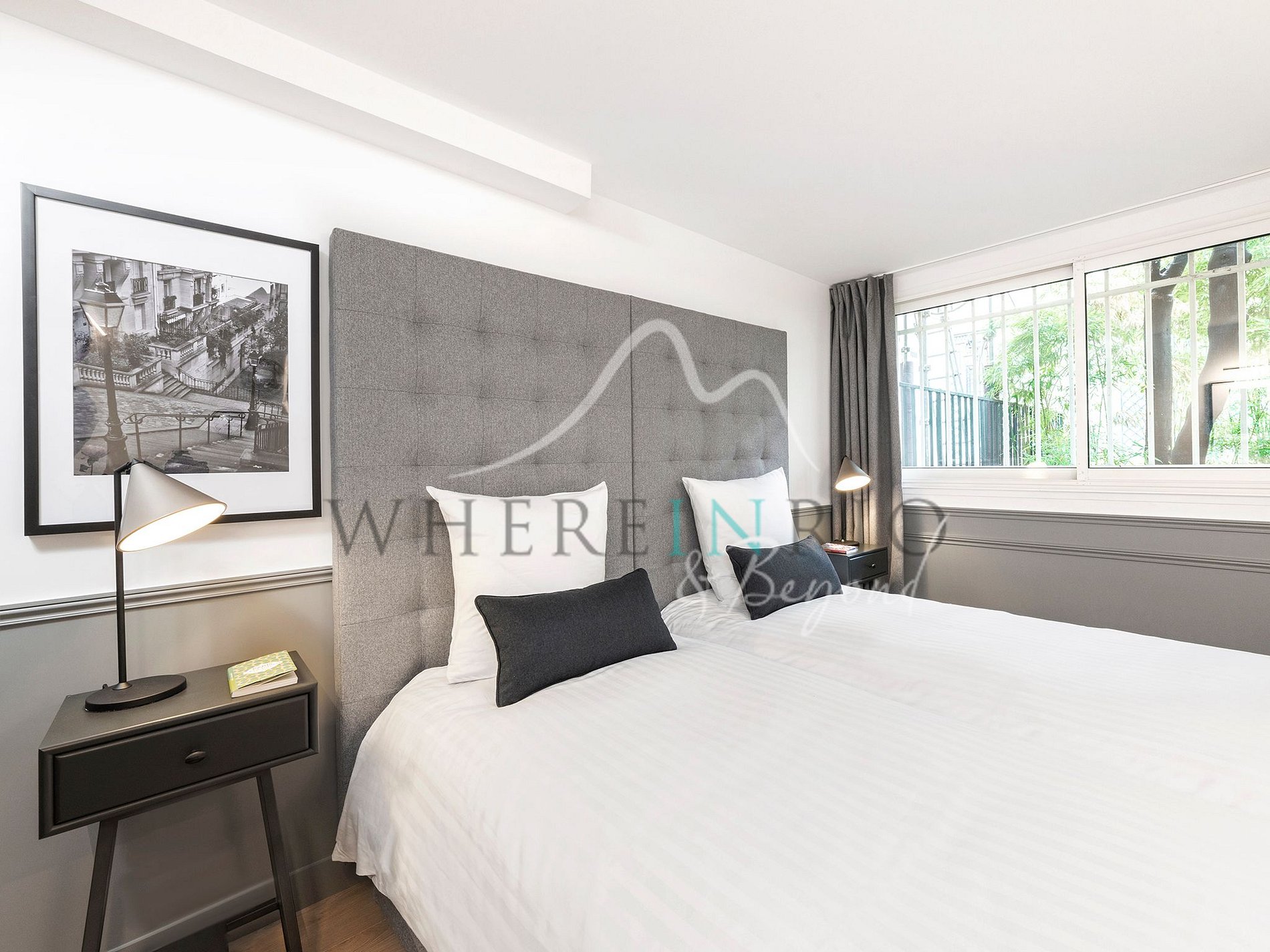 En entrant dans l'appartement, vous serez accueilli par un salon spacieux et lumineux avec une vue sur un charmant jardin intérieur. La décoration élégante et parisienne vous plongera dans une atmosphère conviviale.