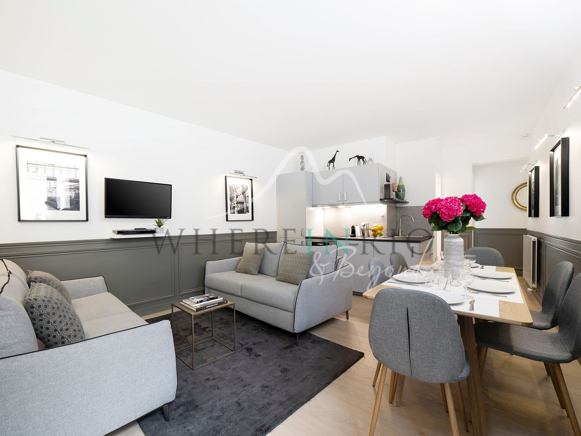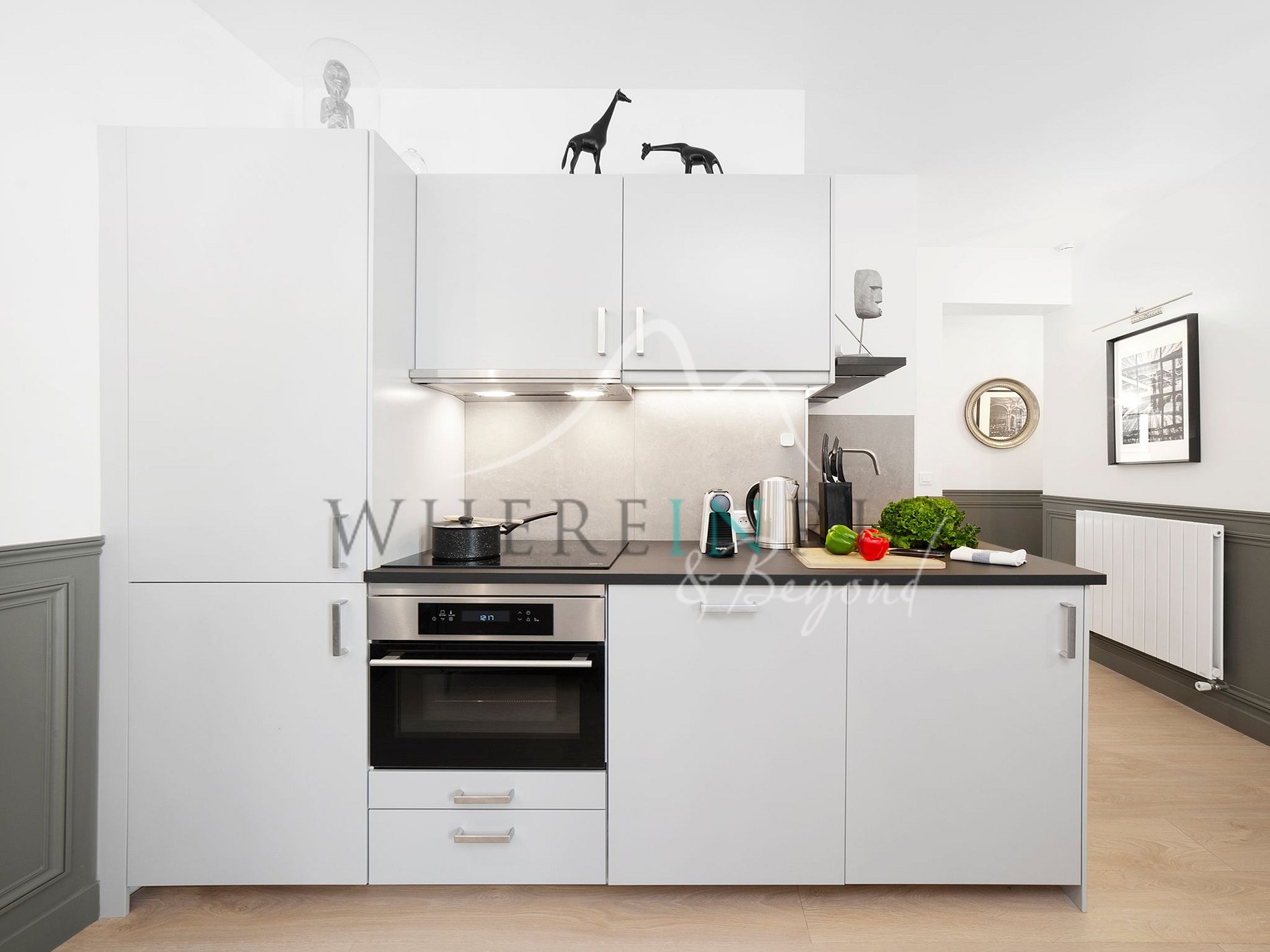La cuisine est entièrement équipée avec un réfrigérateur, un four à micro-ondes combiné, une bouilloire, une machine à café Nespresso, un lave-vaisselle et un lave-linge séchant.