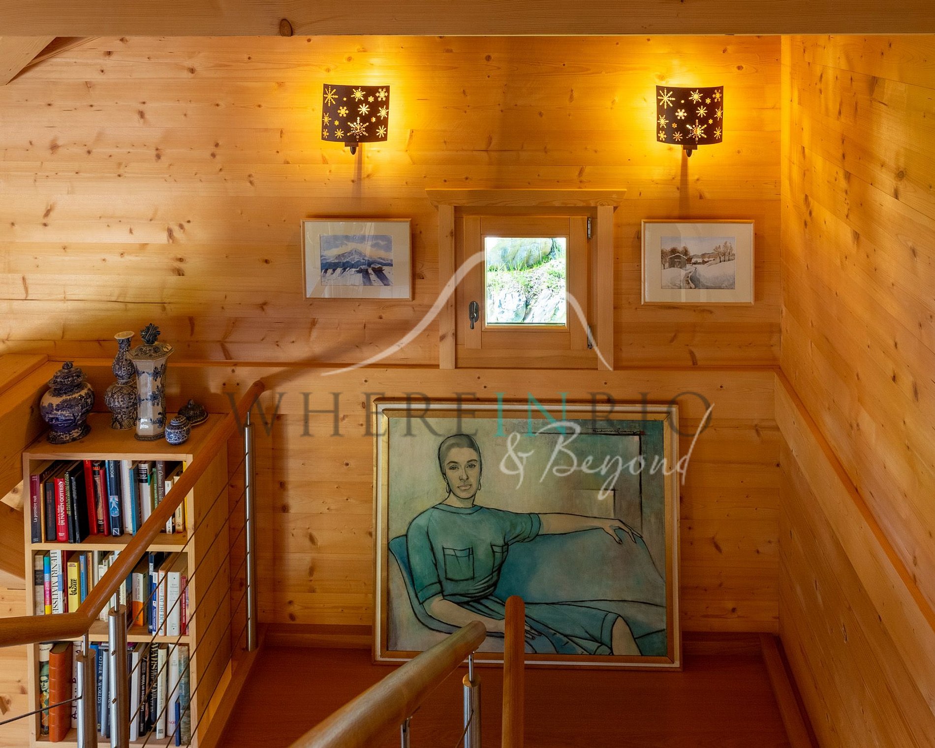 Le chalet dispose également d'un garage pour 2 voitures, d'un terrain de 1000m2 avec une petite rivière traversant la propriété, ainsi que d'une terrasse abritée orientée sud-est.