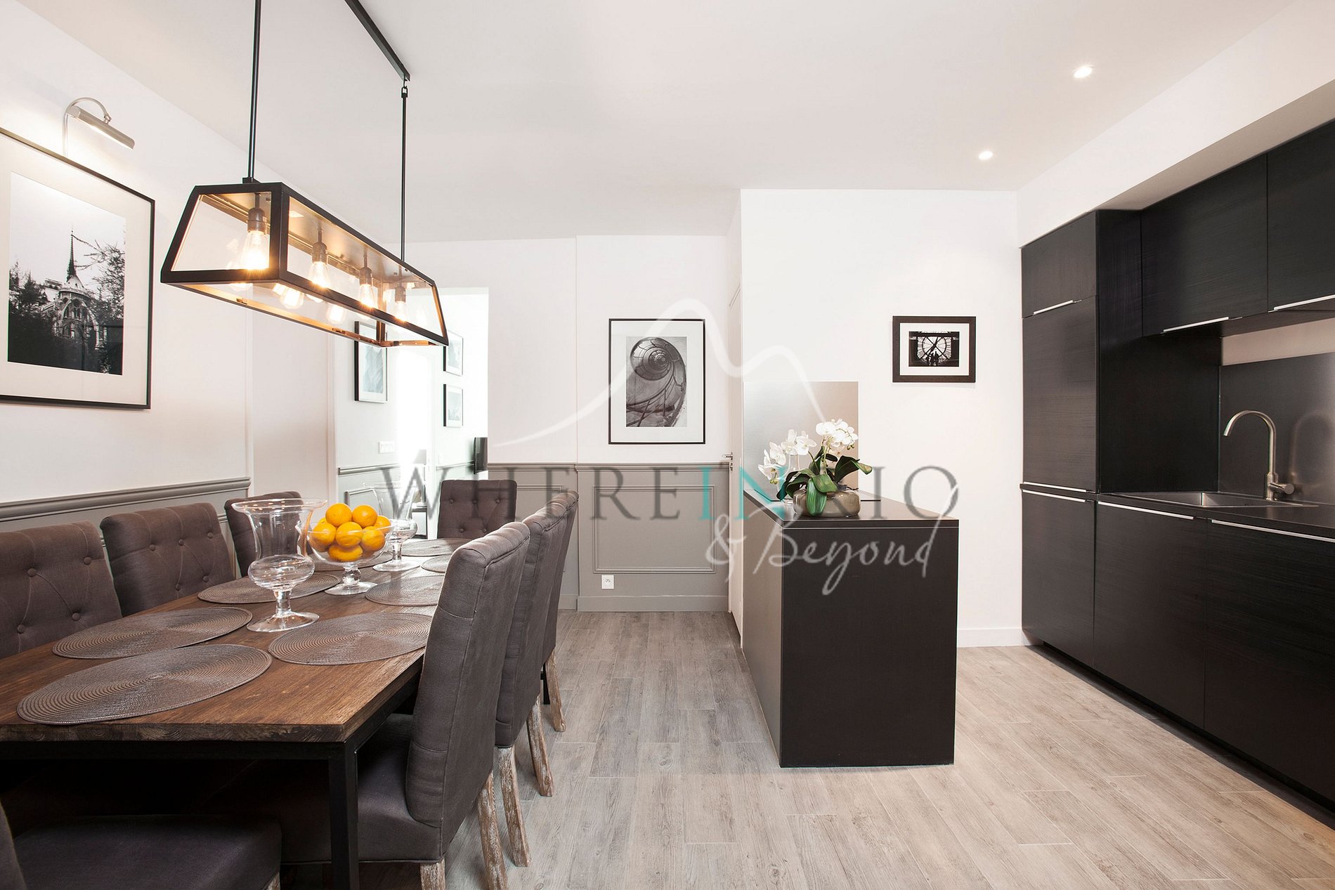 La cuisine est entièrement équipée avec un réfrigérateur, un four à micro-ondes combiné, une bouilloire, une machine à café Nespresso, un lave-vaisselle et un lave-linge séchant.