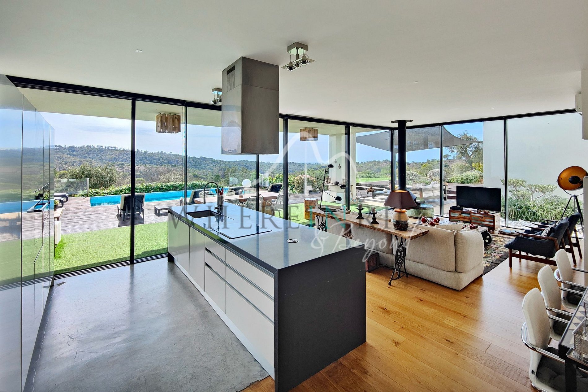 La maison présente un design moderne et des pièces spacieuses, comprenant 3 suites confortables, des chambres supplémentaires pour enfants et des salles de bains complètes. Le point fort est la terrasse avec piscine privée, offrant une vue panoramique sur la vallée et la mer, idéale pour des moments de détente.