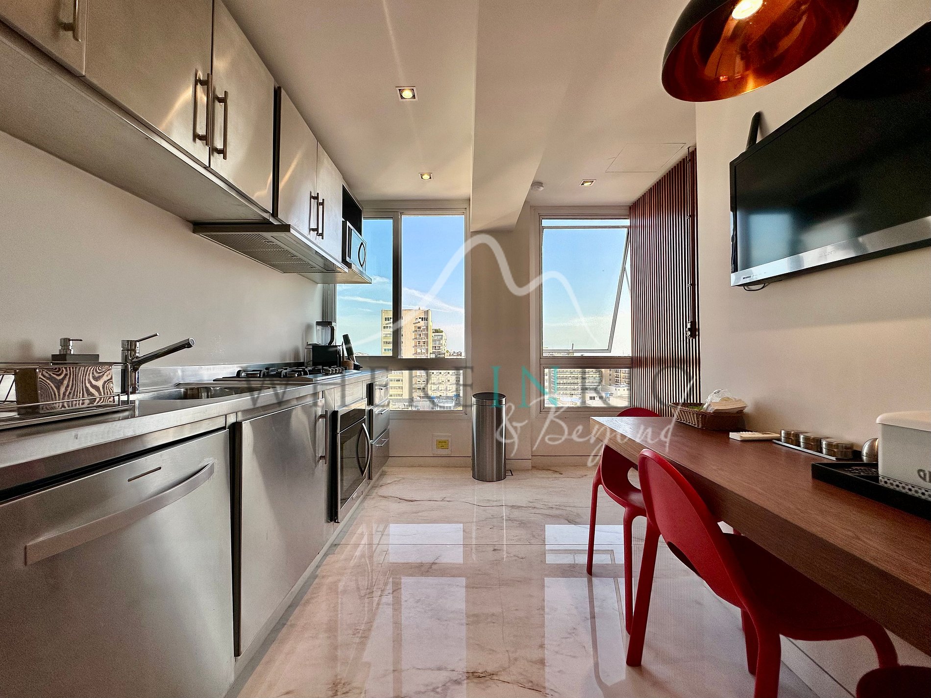 Les invités ont accès exclusif à l’ensemble du penthouse : piscine privée sur le toit, terrasse, salon, cuisine moderne et les trois suites. L’immeuble offre une réception 24h/24 et une place de parking privée.